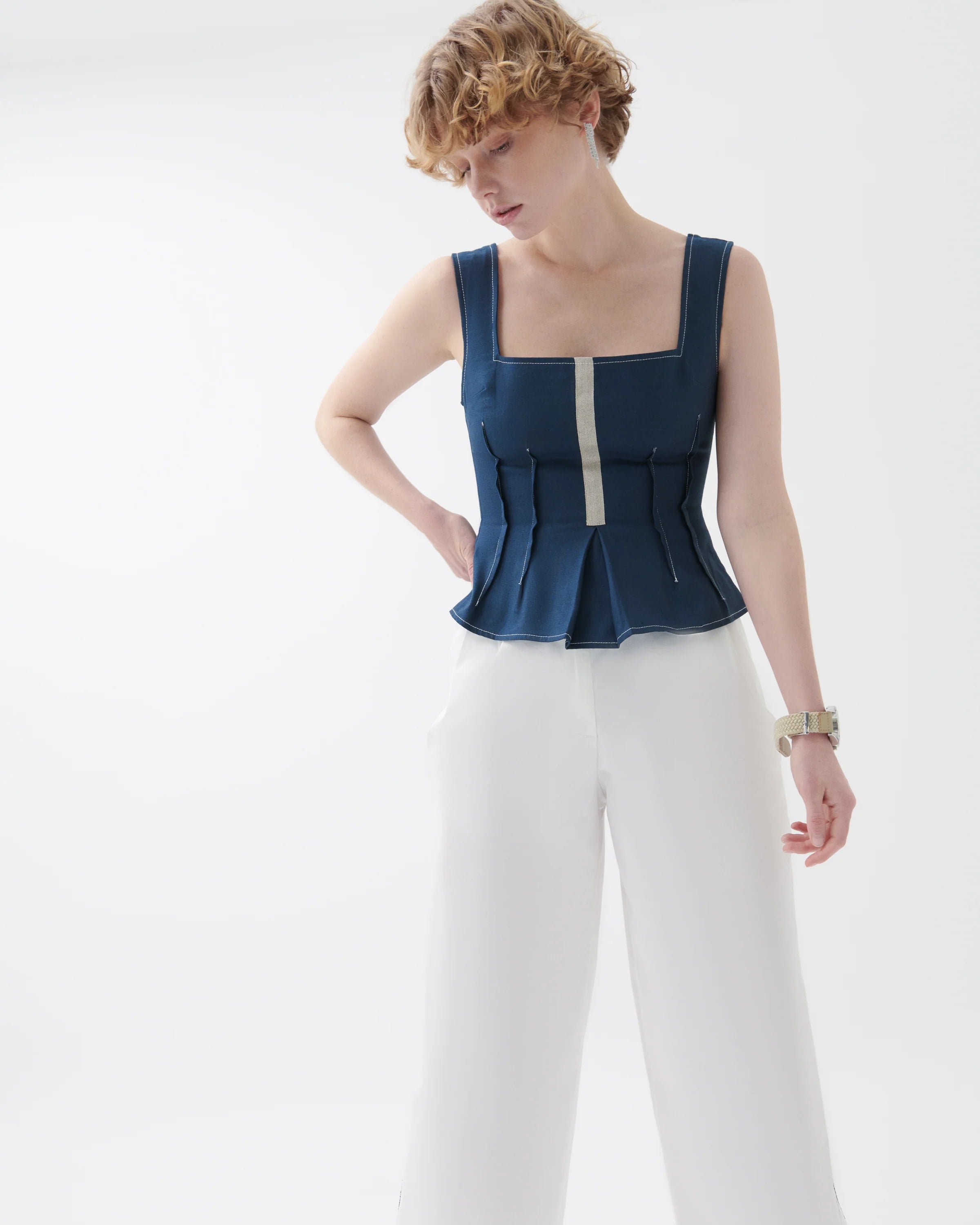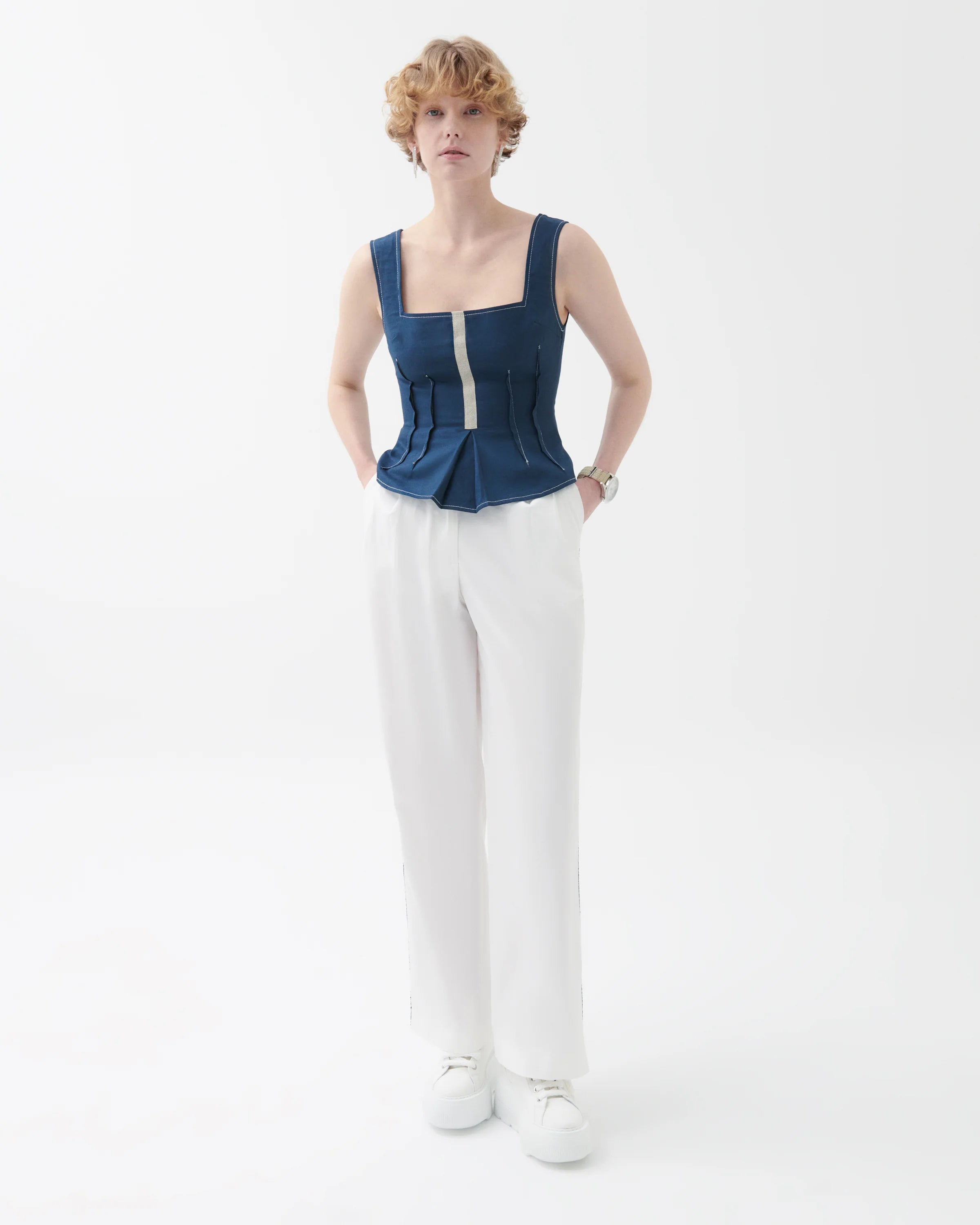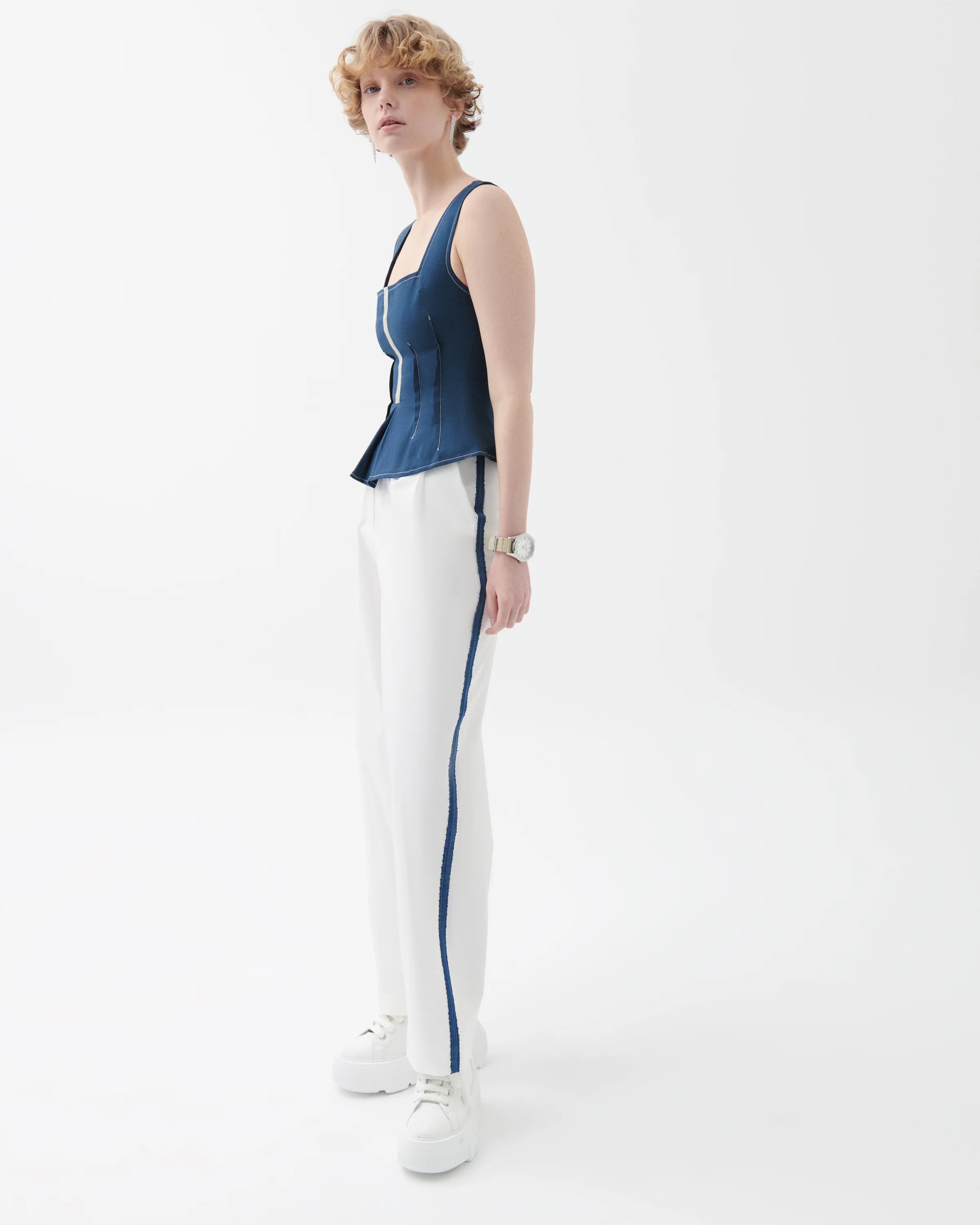 The Amellia trousers bring a refined update to modern tailoring. Defined by a high-rise waist and sleek straight-leg silhouette, they feature front pleats and a bold side stripe in navy for a dynamic contrast. Cut from a breathable cotton–viscose blend with added stretch, they balance structure and comfort for everyday versatility—from office wear to casual styling.