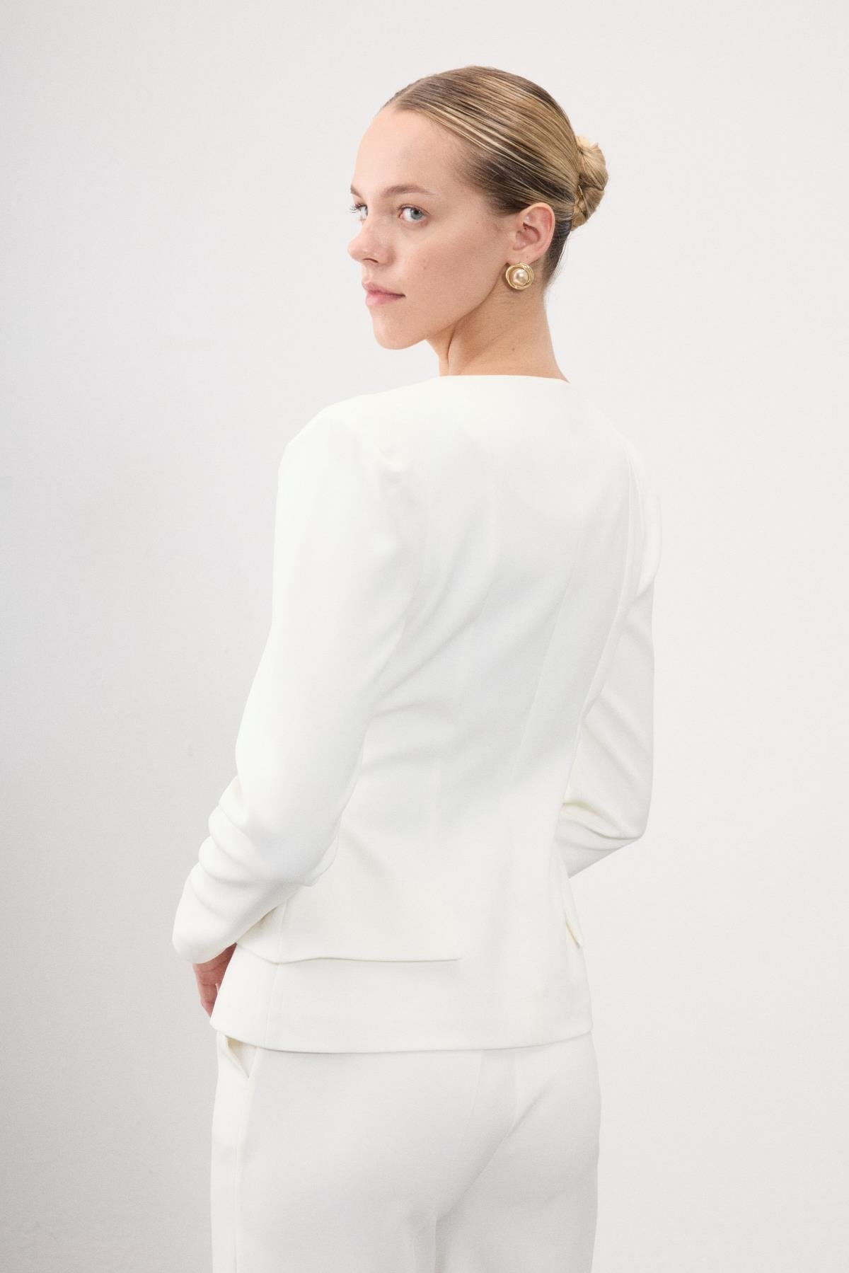 Refined and timeless, the Cornelia Suit redefines power dressing with feminine elegance. The tailored jacket features a sculptural neckline and crystal-accented buttons, creating a luxurious focal point. Designed in a softly structured woven fabric, the set includes straight-leg trousers that balance sophistication and comfort — ideal for evening occasions or elevated professional wear.