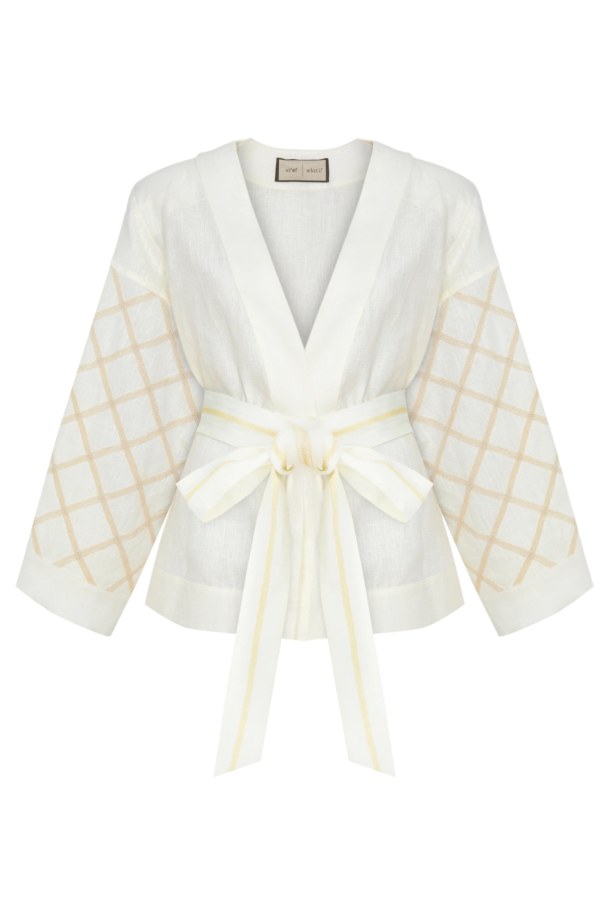 A modern interpretation of timeless elegance, this kimono blouse is crafted from 100% linen for lightness and breathability. Featuring wide sleeves with subtle embroidered detailing and a waist-defining tie belt, it combines natural ease with a sophisticated silhouette. Perfect for both daywear and evening occasions.