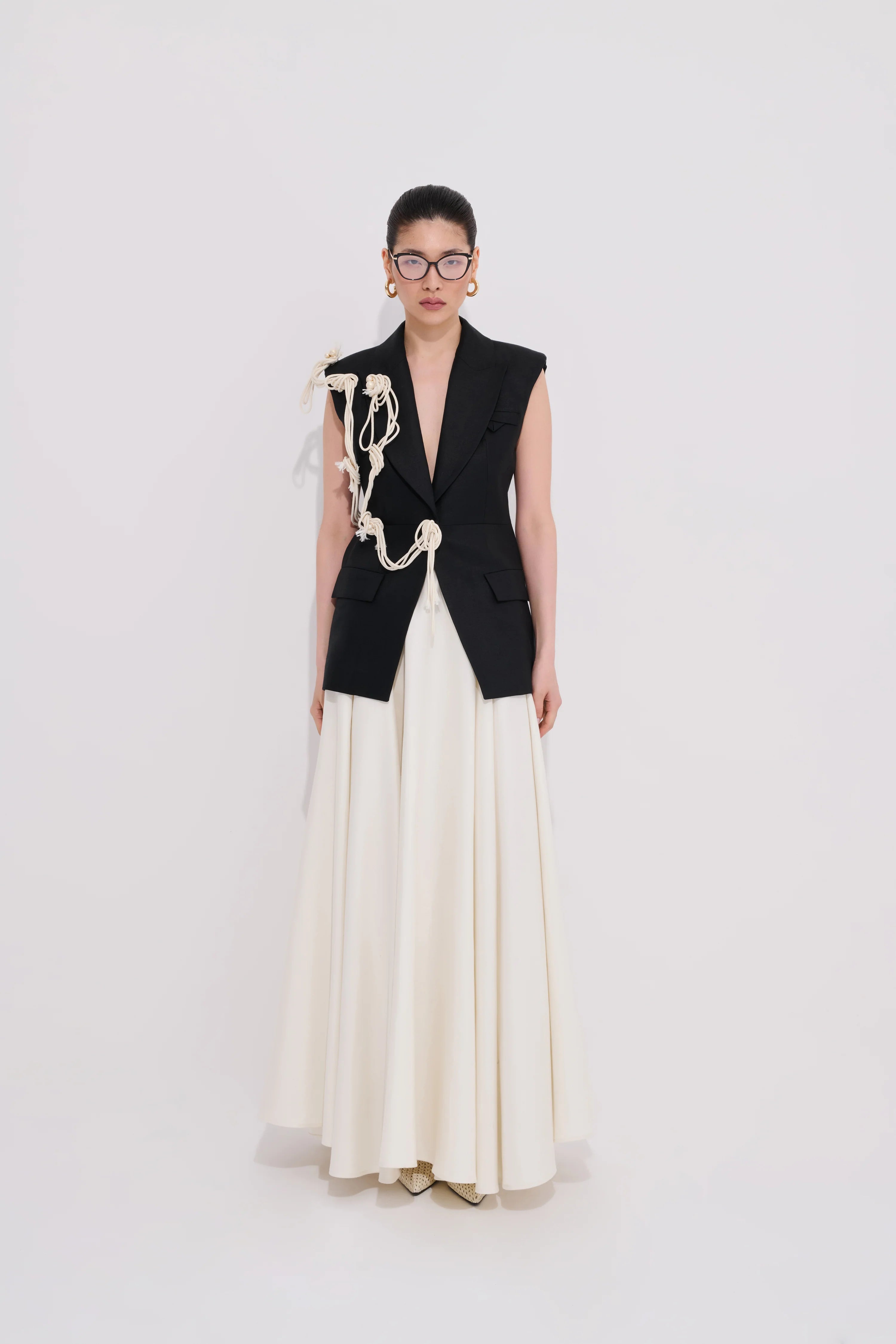 An avant-garde interpretation of classic tailoring, this linen vest merges sharp lines with bold artistry. Featuring a detachable handcrafted rope detail cascading from one shoulder, it transforms effortlessly from minimal chic to statement-ready. Its tailored silhouette ensures versatility, making it a striking addition for both day and evening wear.