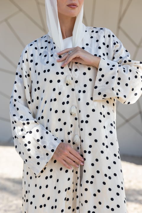 Step into timeless sophistication with this Polka Abaya, blending classic charm with modern modest elegance. Designed with a flowing silhouette, it features an all-over polka dot pattern and statement pearl tassel buttons that add a refined feminine touch. Delicate lace inserts along the sides create graceful movement, making this piece ideal for both daytime elegance and evening occasions.