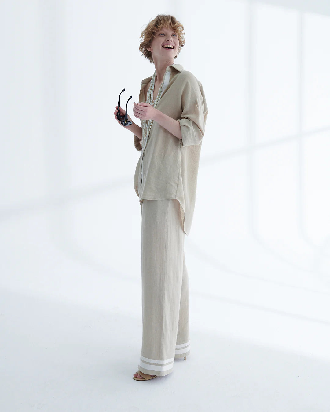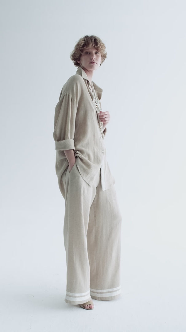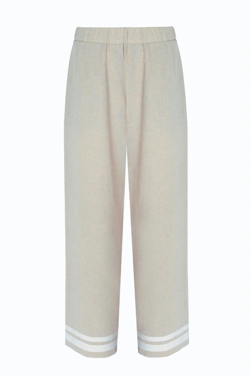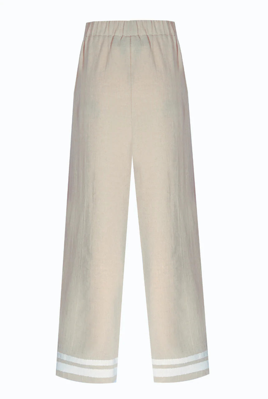 The Scarlett trousers combine natural ease with refined detailing. Tailored in a relaxed wide-leg silhouette, they feature practical side pockets and a French-inspired stripe accent at the hem for a subtle modern edge. Crafted from a breathable cotton–linen blend, they deliver lightweight comfort with timeless versatility — ideal for elevating everyday style.