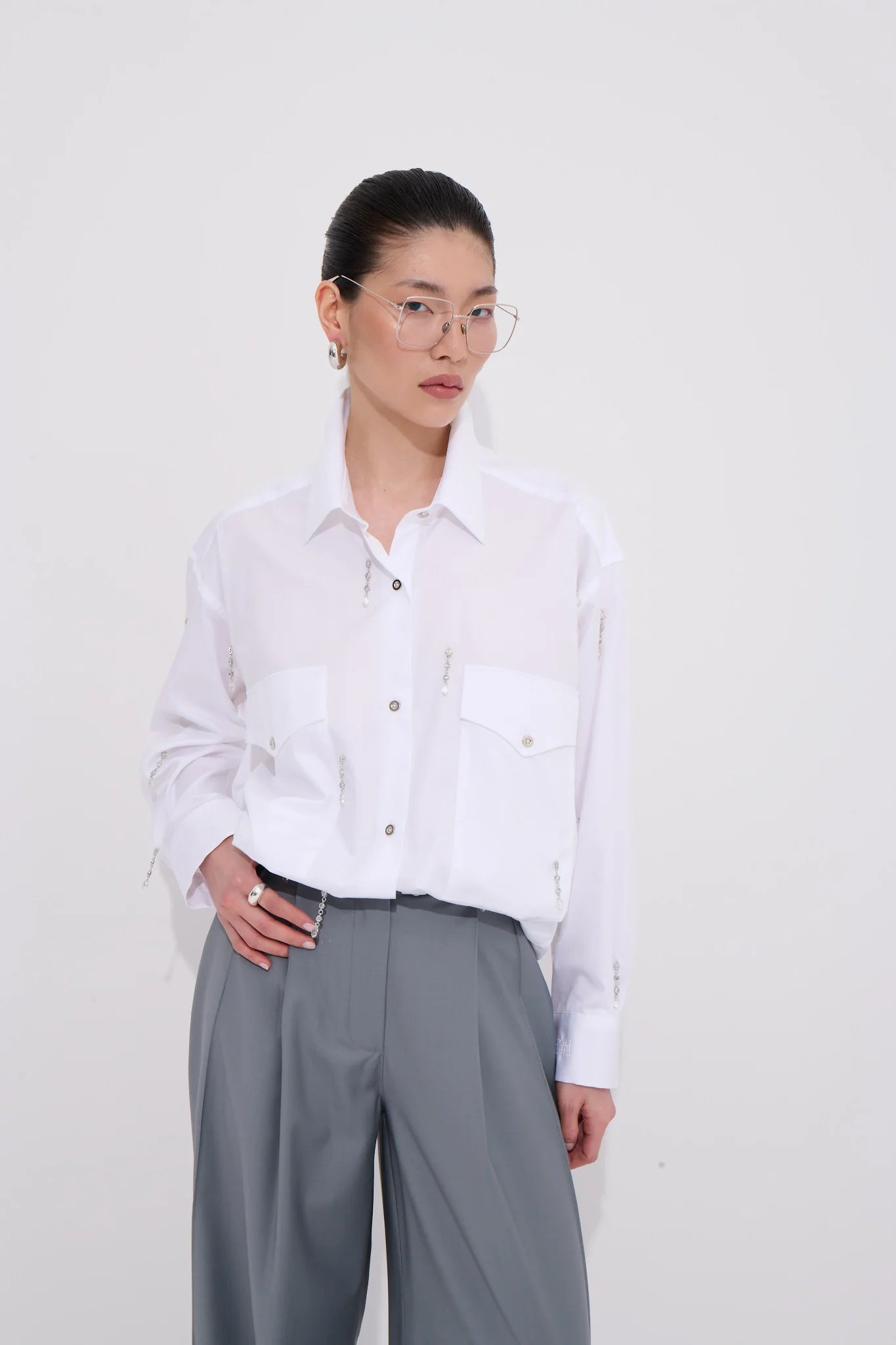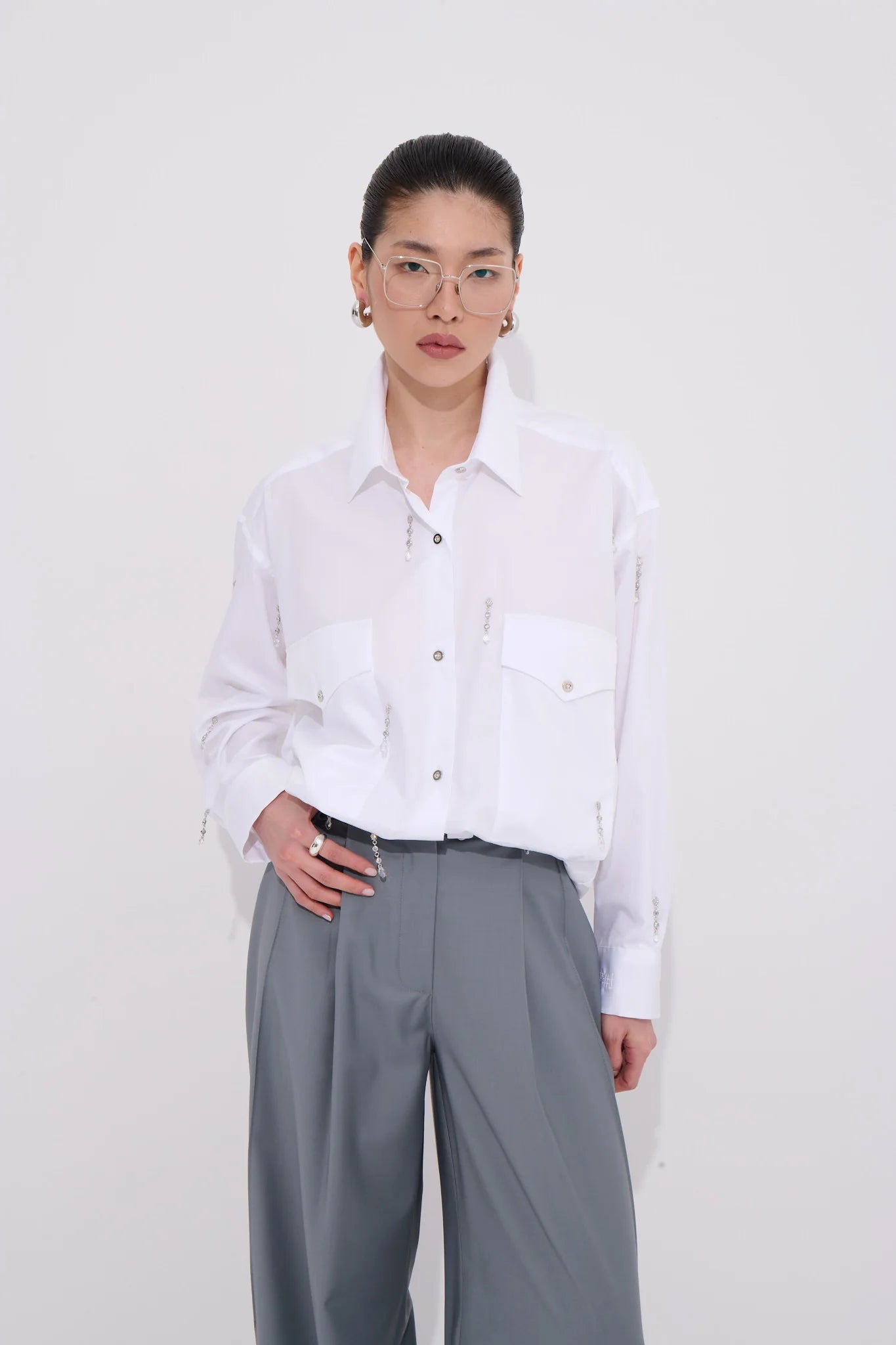 Specially designed for WhatIfBrand, the Teardrop shirt reimagines classic tailoring with sparkling refinement. Swarovski crystal-embellished buttons add a luminous accent to the crisp silhouette, while wide pockets and clean lines balance elegance with functionality. Crafted from 100% cotton, it ensures breathability and comfort throughout the day. Perfectly versatile, it transitions seamlessly from business wear to evening sophistication, pairing effortlessly with tailored trousers or timeless skirts.