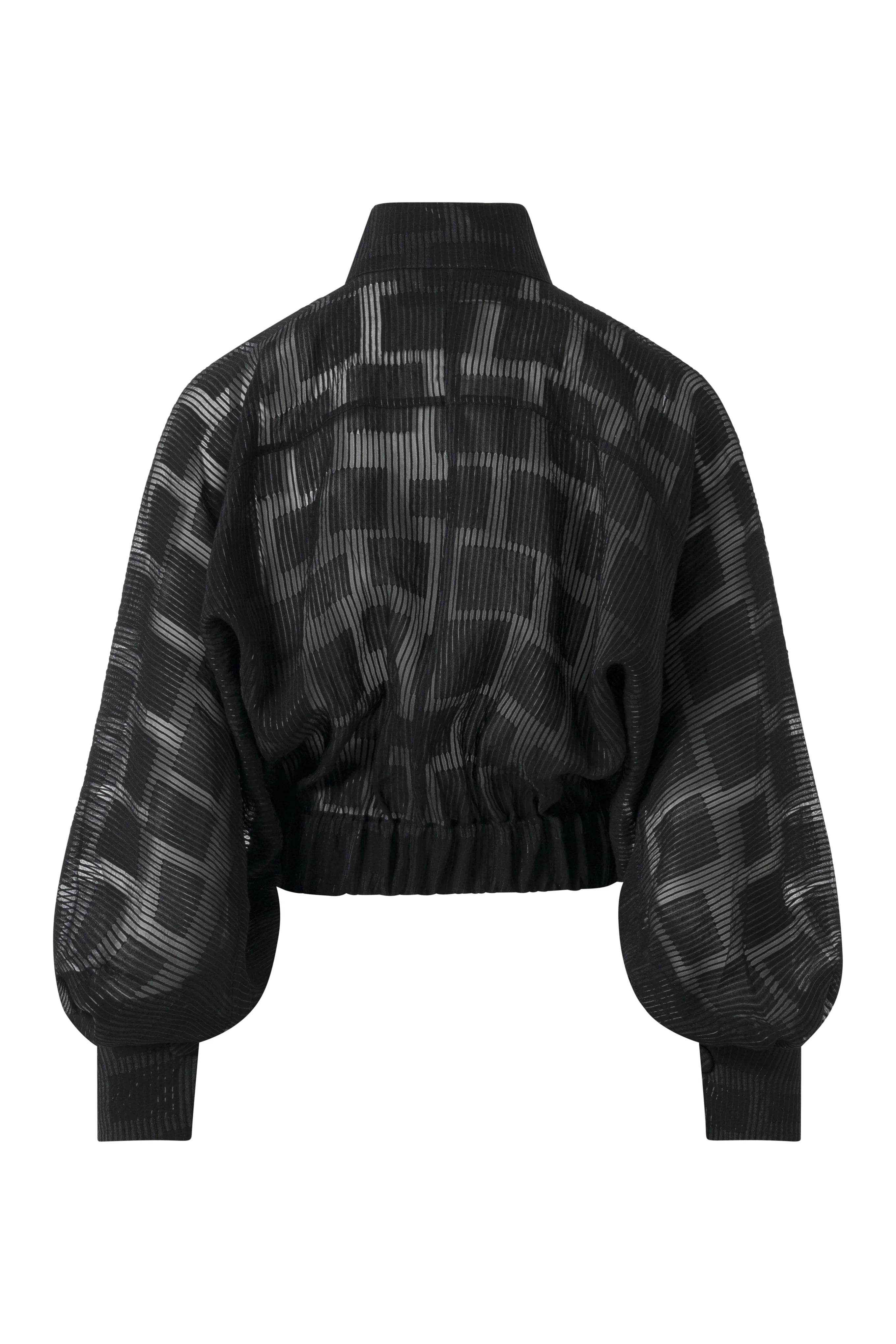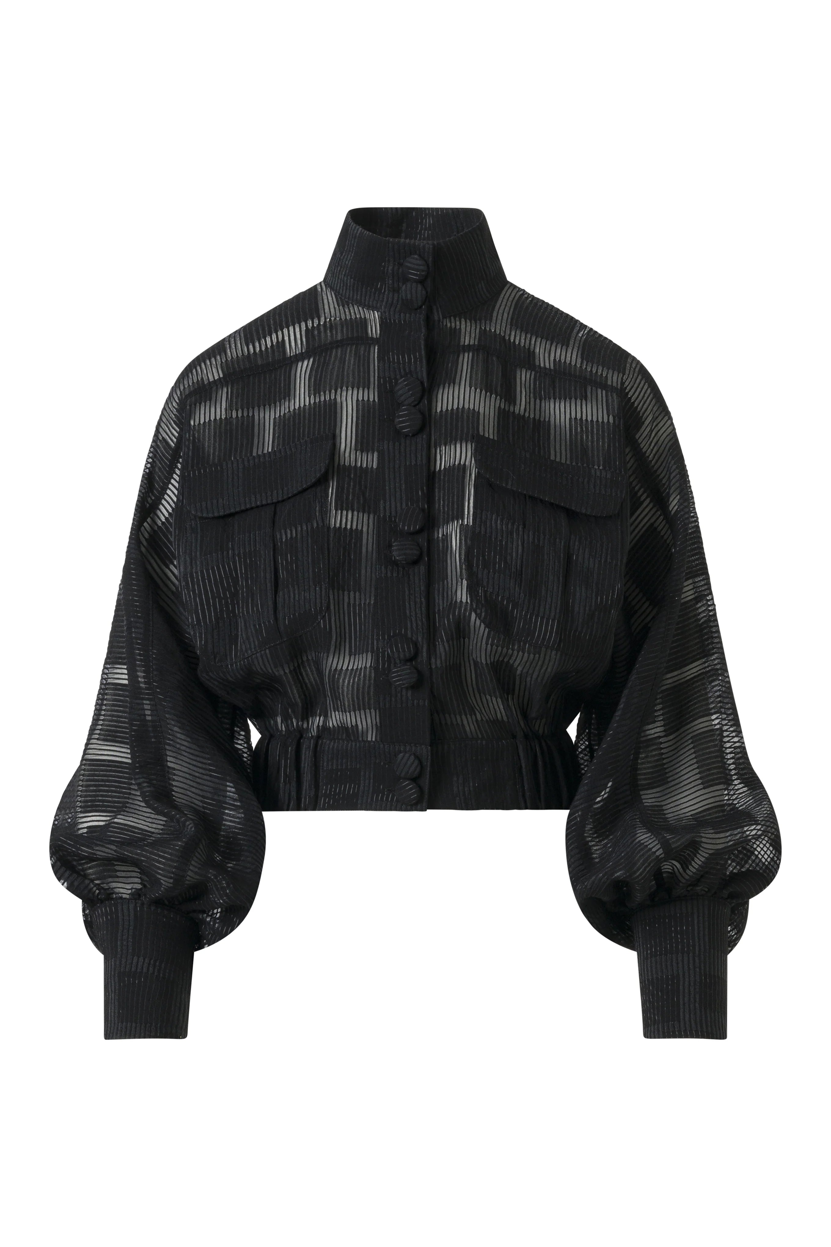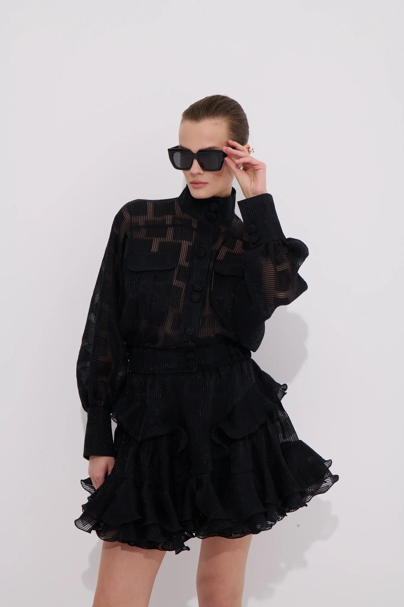 The Violaine blouse is a bold yet refined piece, crafted with a sheer check-patterned texture that adds depth and lightness. Its unlined construction ensures breathability, while the relaxed cut drapes naturally over the body. Finished with a stand collar, fabric-covered buttons, and voluminous sleeves with structured cuffs, this blouse strikes the perfect balance between contemporary elegance and effortless ease. The elasticated hem enhances its modern silhouette.