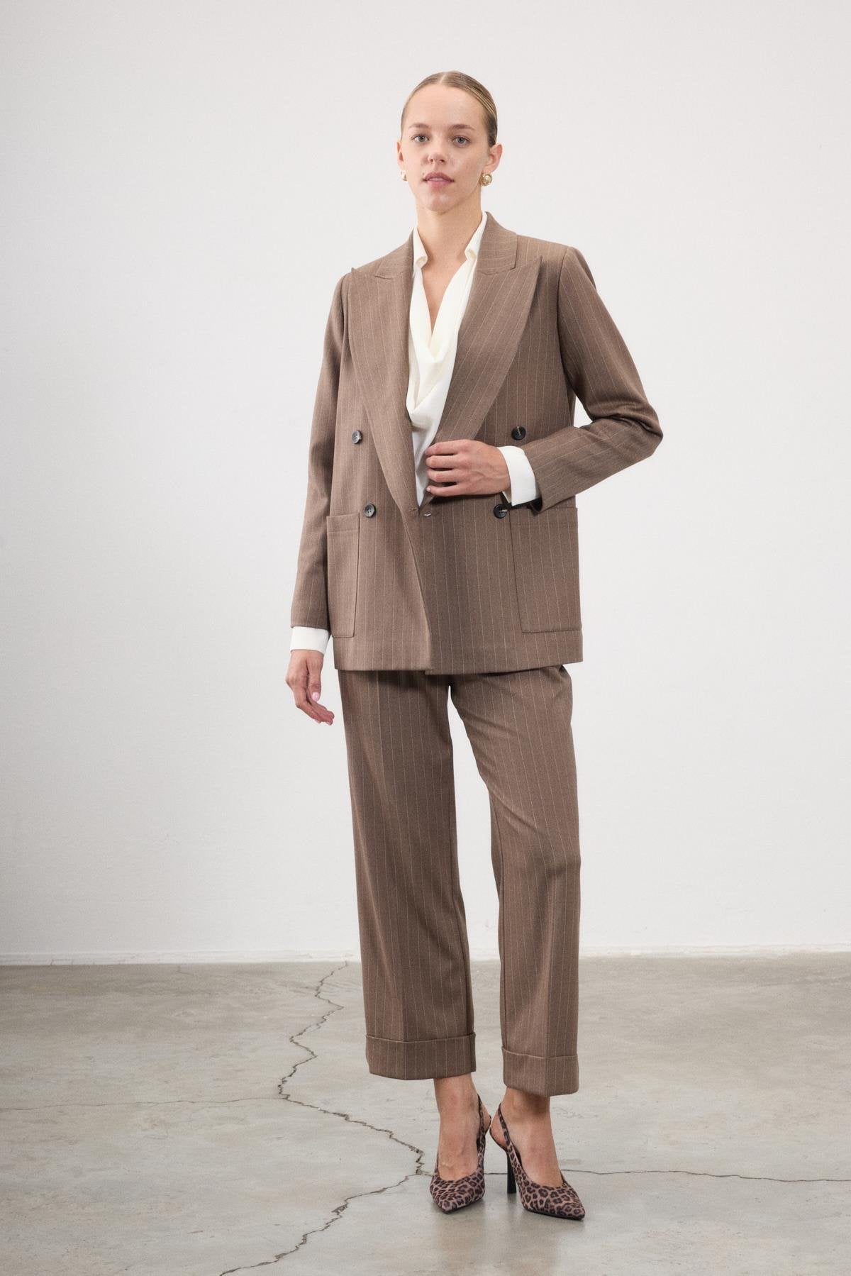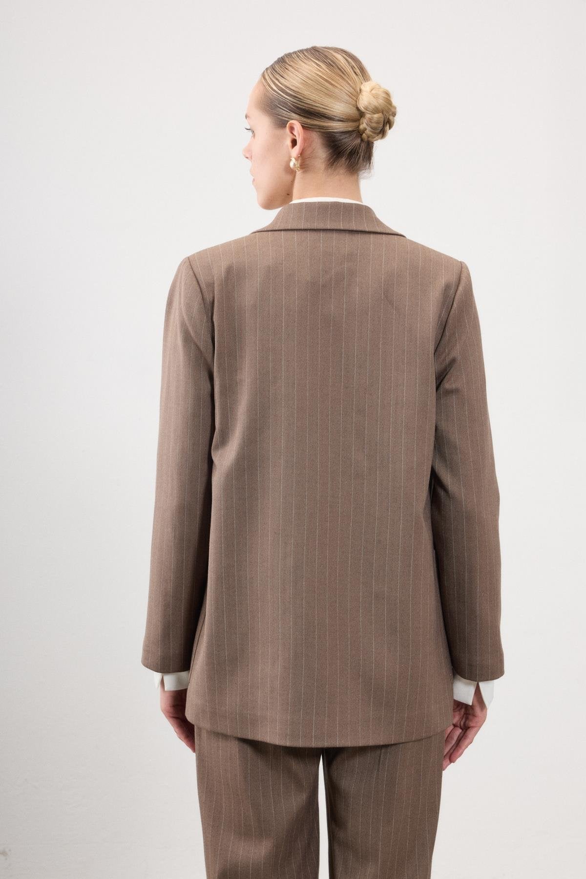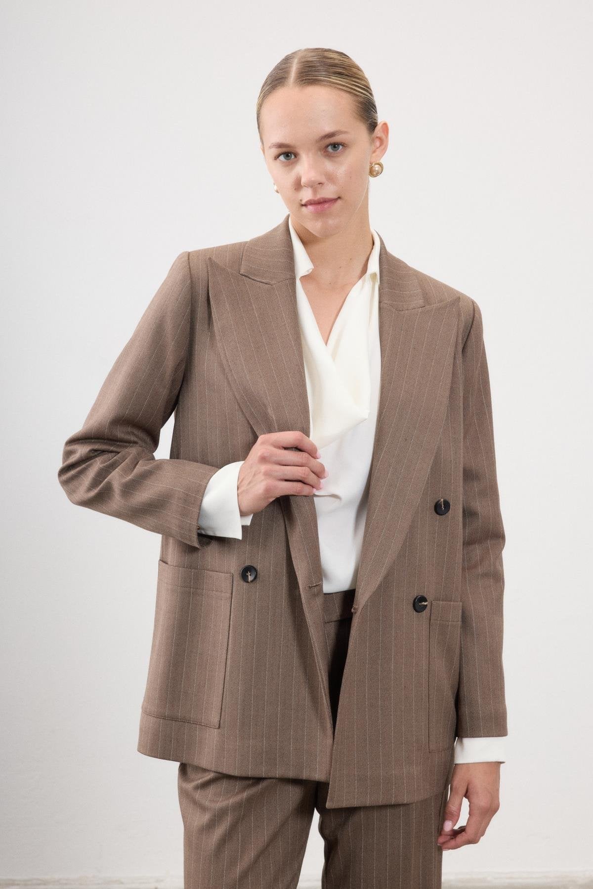 An elegant staple reimagined for timeless sophistication. The Benita Blazer features subtle pinstripes across a warm coffee-toned fabric, offering a refined take on classic tailoring. Cut from a soft, structured weave, it’s designed with a double-breasted front, sharp lapels, and minimalist flap pockets — ideal for both workwear and elevated casual styling.