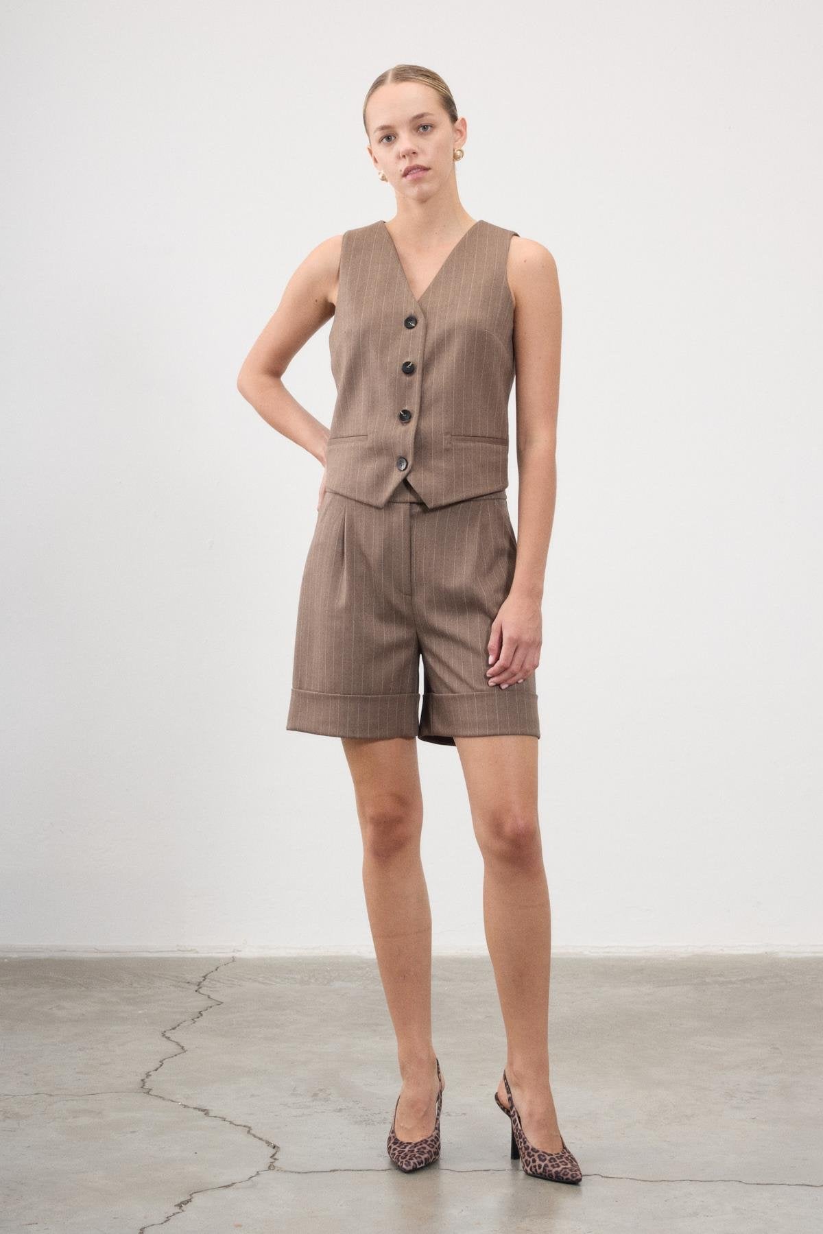 A refined layering essential designed for understated sophistication. The Benita Vest features fine pinstripes and a structured V-neck silhouette that channels timeless tailoring. Its darted front and button fastening create a sleek, feminine line — perfect for pairing with matching trousers or a crisp shirt for modern office wear.