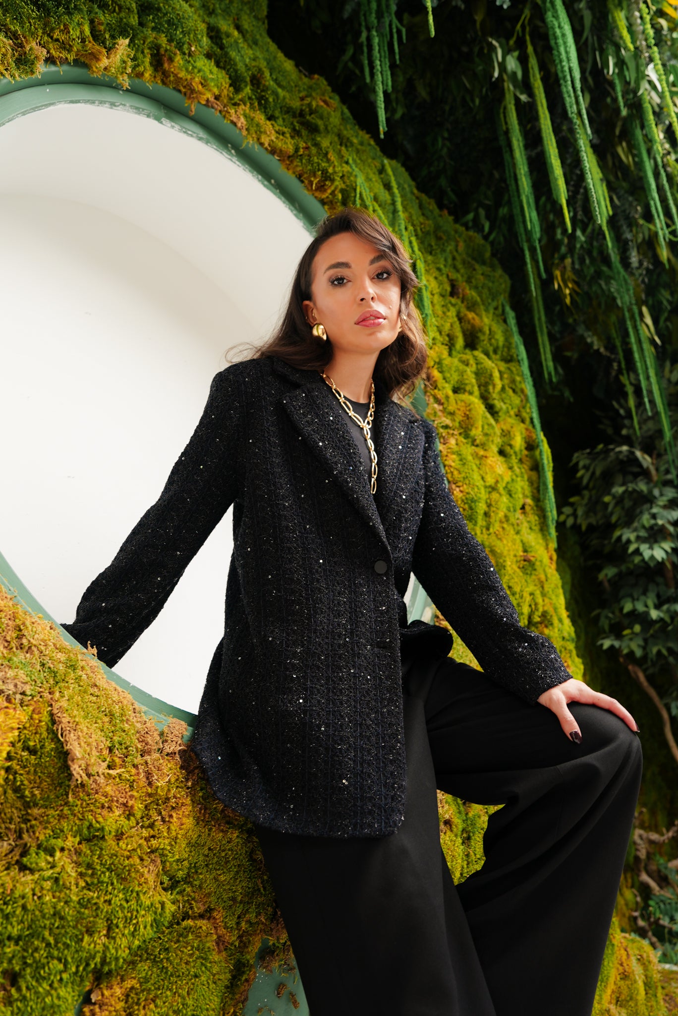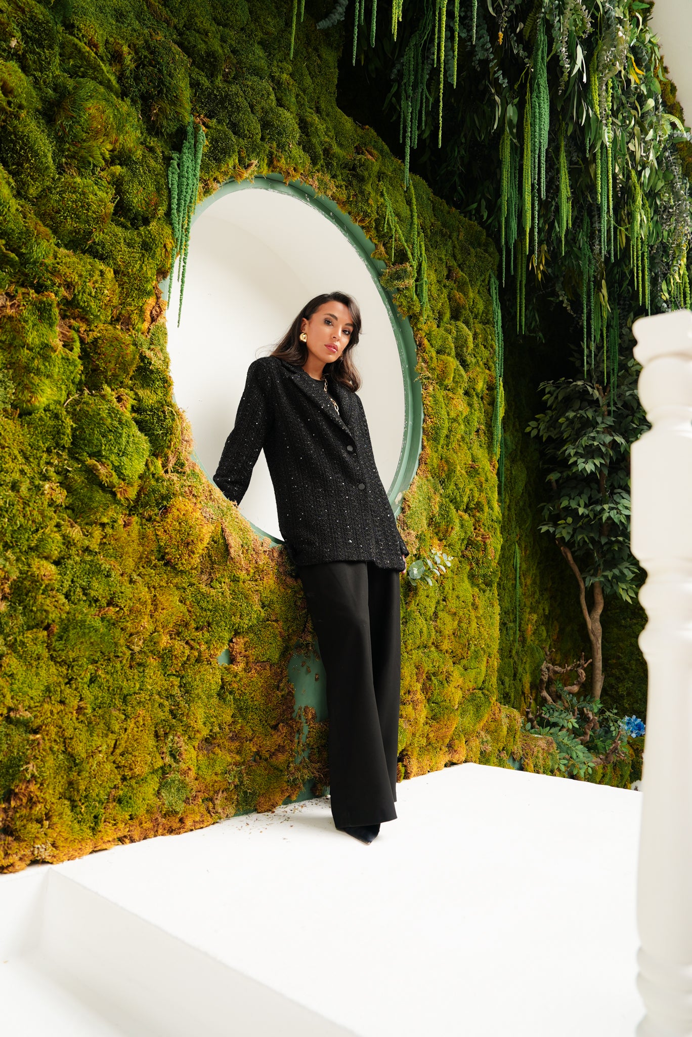 A refined staple that elevates any modest wardrobe, the Elara blazer is crafted from a special textured tweed with a subtle shimmer effect. The structured shoulders, elongated silhouette, and clean single-breasted closure create an effortlessly elegant look — perfect for elevated everyday wear or evening refinement.