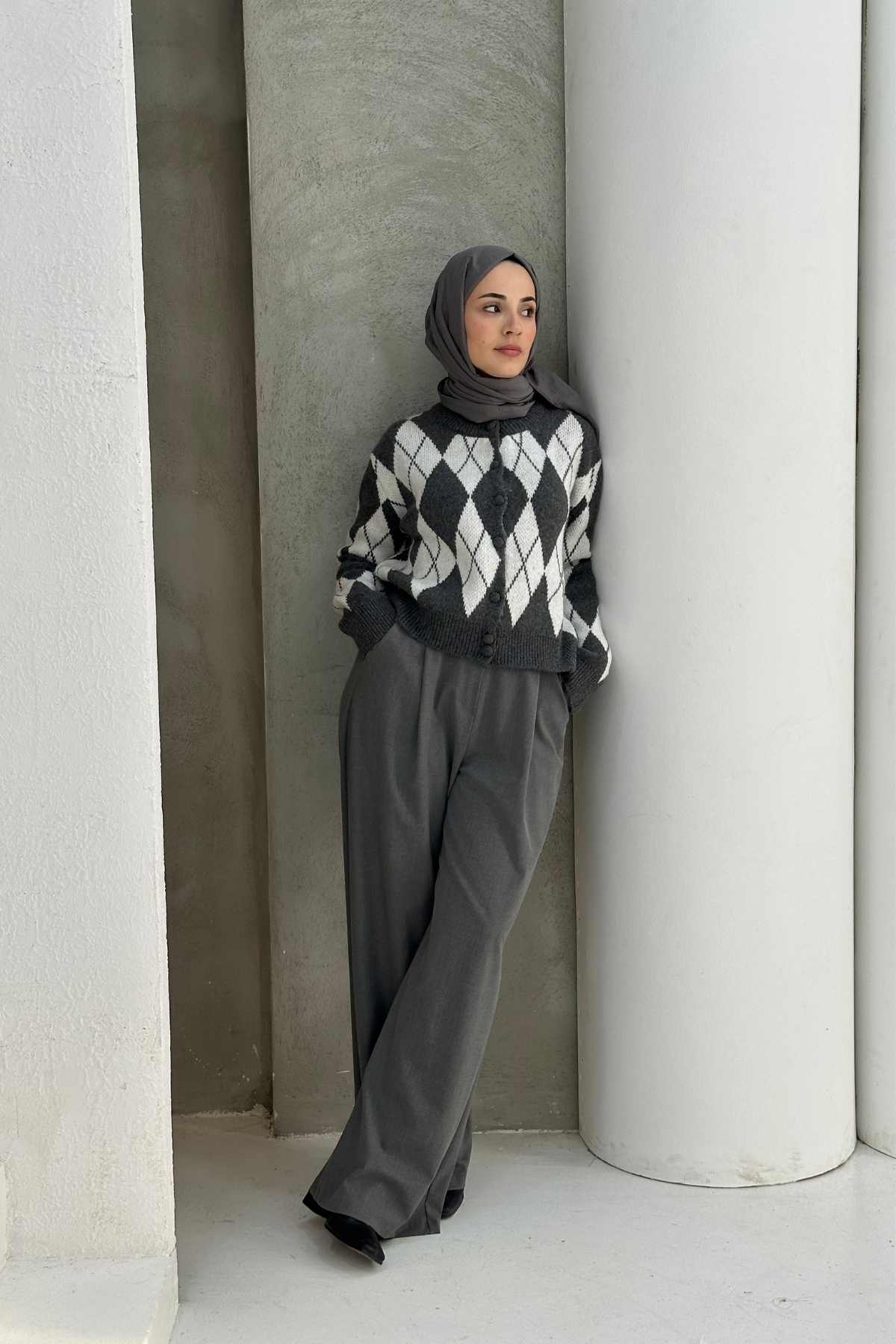 This diamond-patterned cardigan blends vintage charm with modern ease, featuring soft ribbed trims and covered buttons that add texture and refinement.