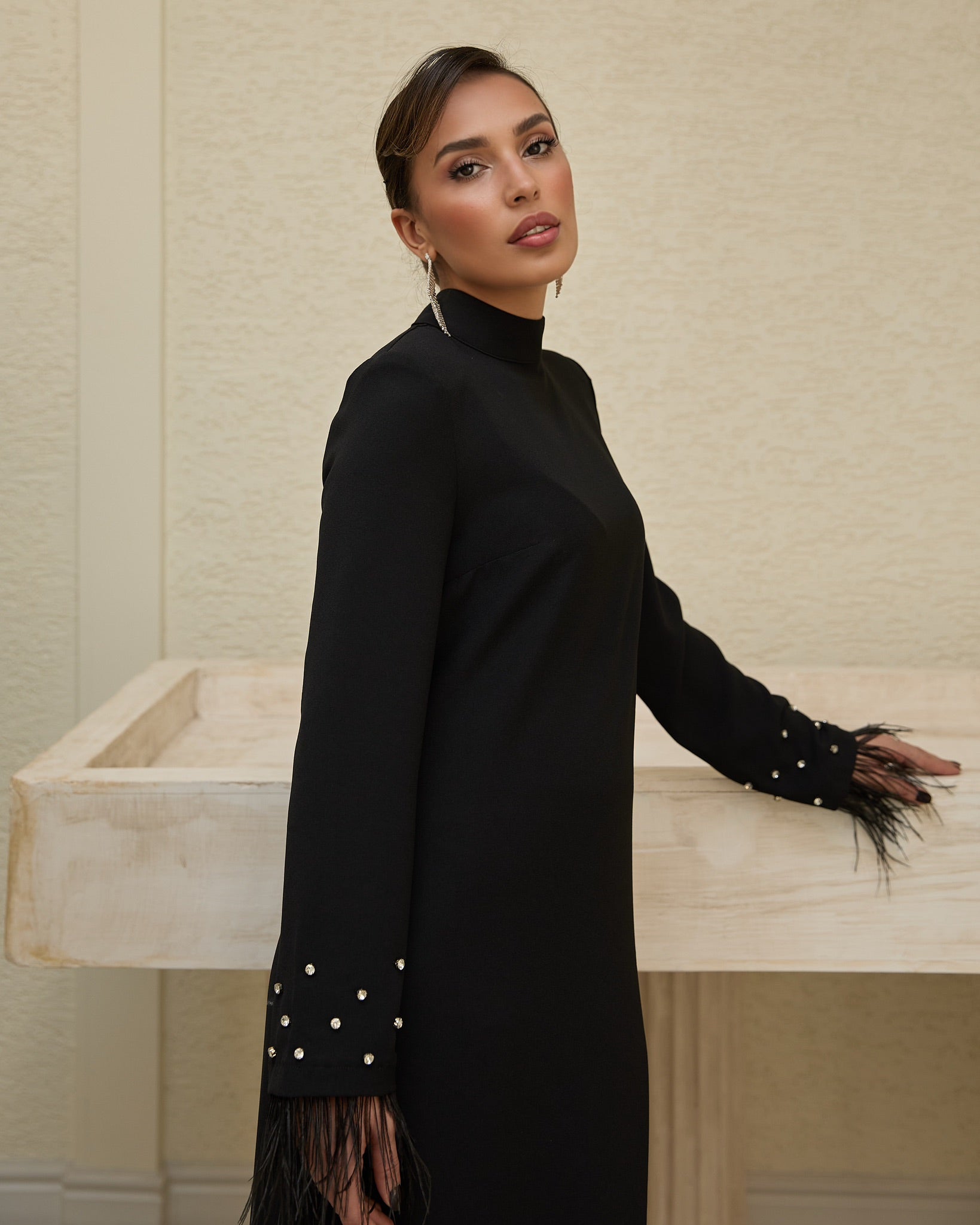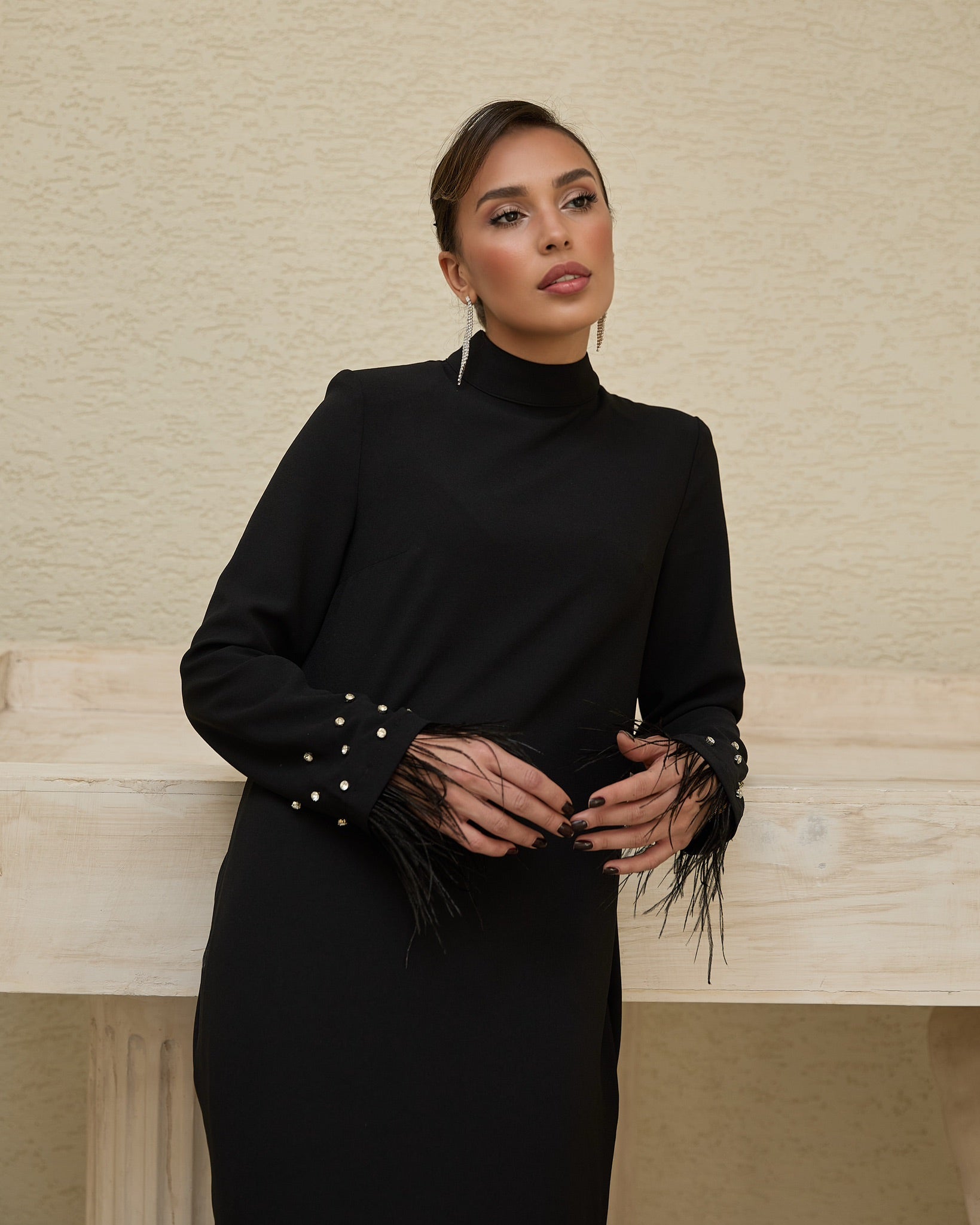Crafted from flowing crepe, it features a modest high neckline and a straight silhouette that gracefully elongates the figure. The cuffs and hem are adorned with delicate pearl embellishments and feather trims, adding a sophisticated touch of texture and movement. Unlined and fluid, it offers comfort and understated glamour — perfect for evening events or special occasions.