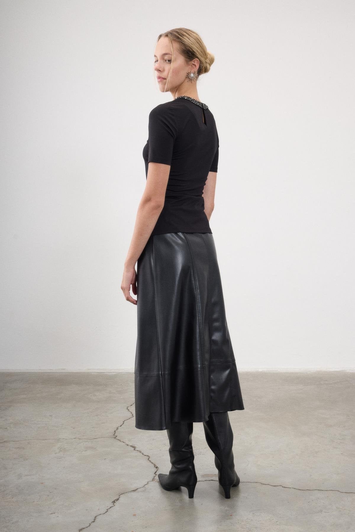 Timeless sophistication meets modern edge. The Freya midi skirt is crafted from smooth faux leather with a subtle sheen and a fluid A-line silhouette. Designed to sit high on the waist and gently flare toward the hem, it moves gracefully with every step — perfect for both day and evening wear. Pair it with a crisp shirt or soft knit for effortless elegance.