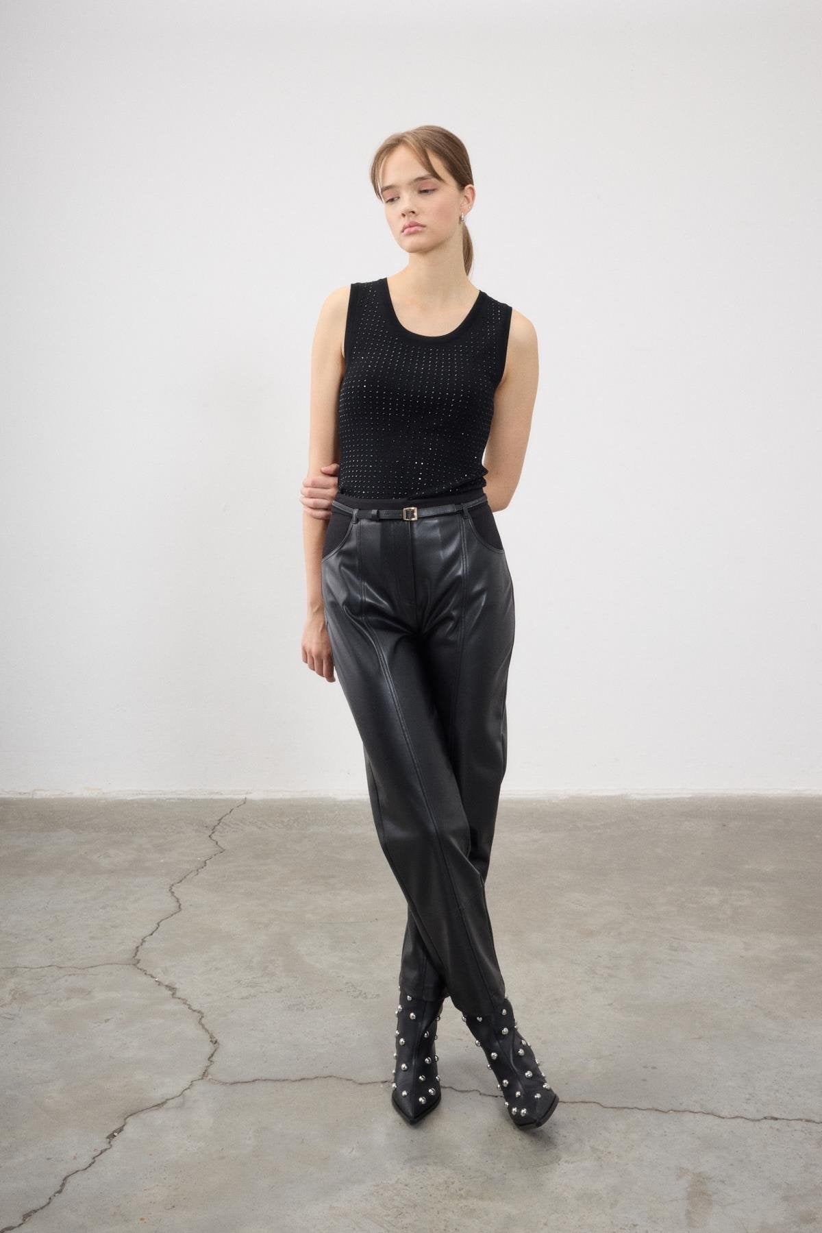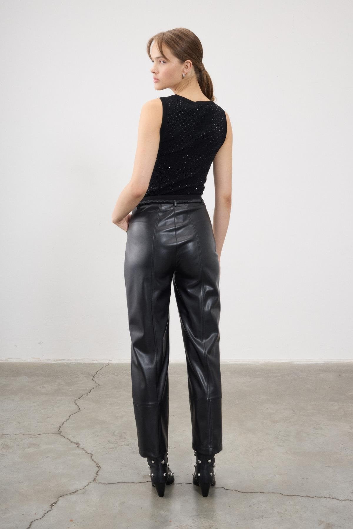 A contemporary staple reimagined in supple faux leather for the modern wardrobe. The Freya trousers feature a structured straight-leg silhouette that flatters while maintaining ease of movement. Designed with precise tailoring and a clean high-rise waist, they seamlessly transition from day to night. Perfect paired with soft knits or structured blazers for an elevated statement look.