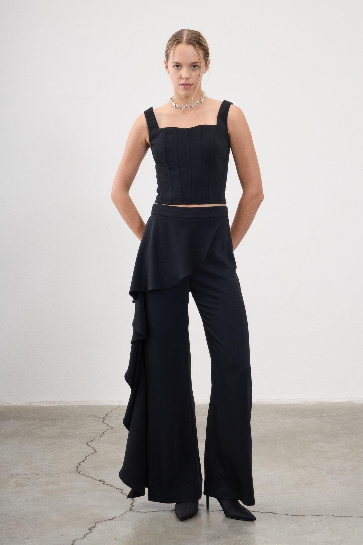 A contemporary reimagining of classic tailoring. The Indira trousers feature an asymmetric draped panel cascading elegantly along one leg, creating fluid movement with every step. Their high-rise waist and structured wide-leg cut elongate the silhouette, making them a statement piece for refined evening looks or elevated daywear. Pair them with the matching corset top for a cohesive, sophisticated ensemble.
