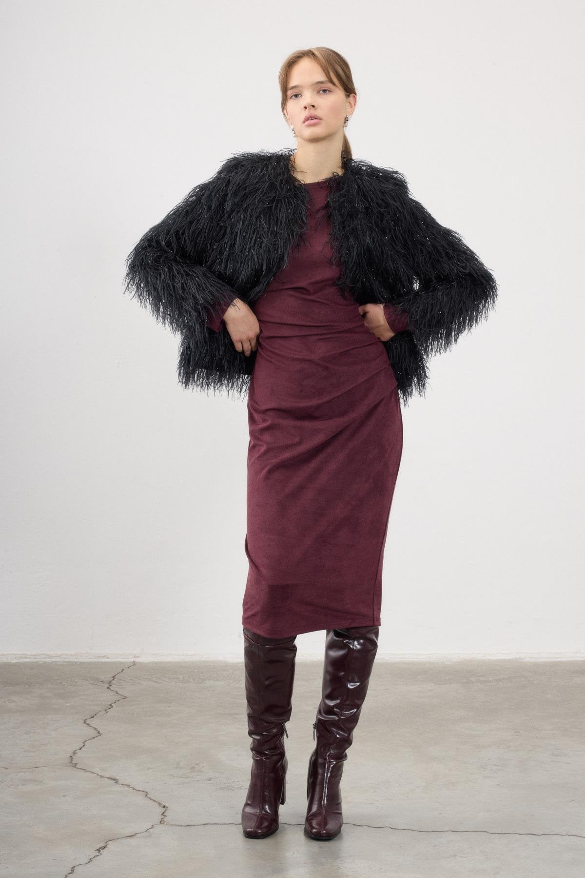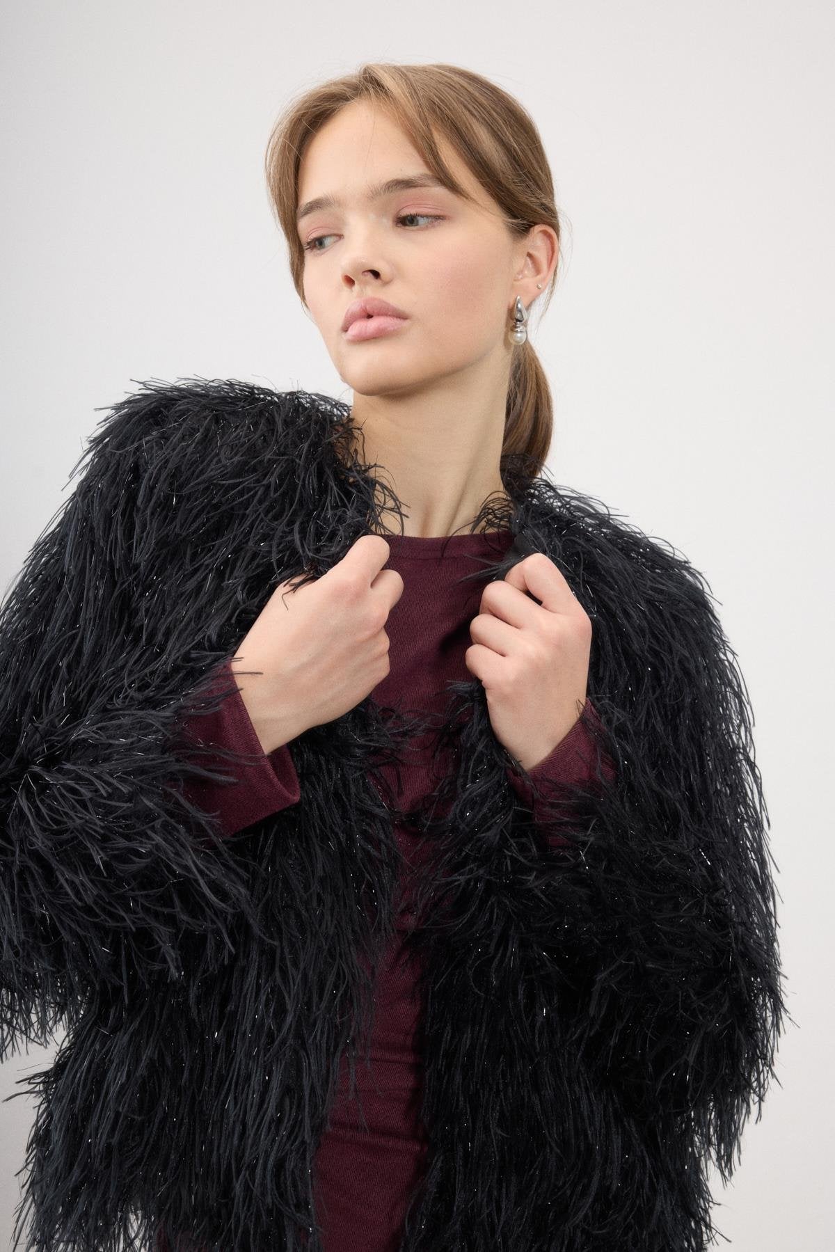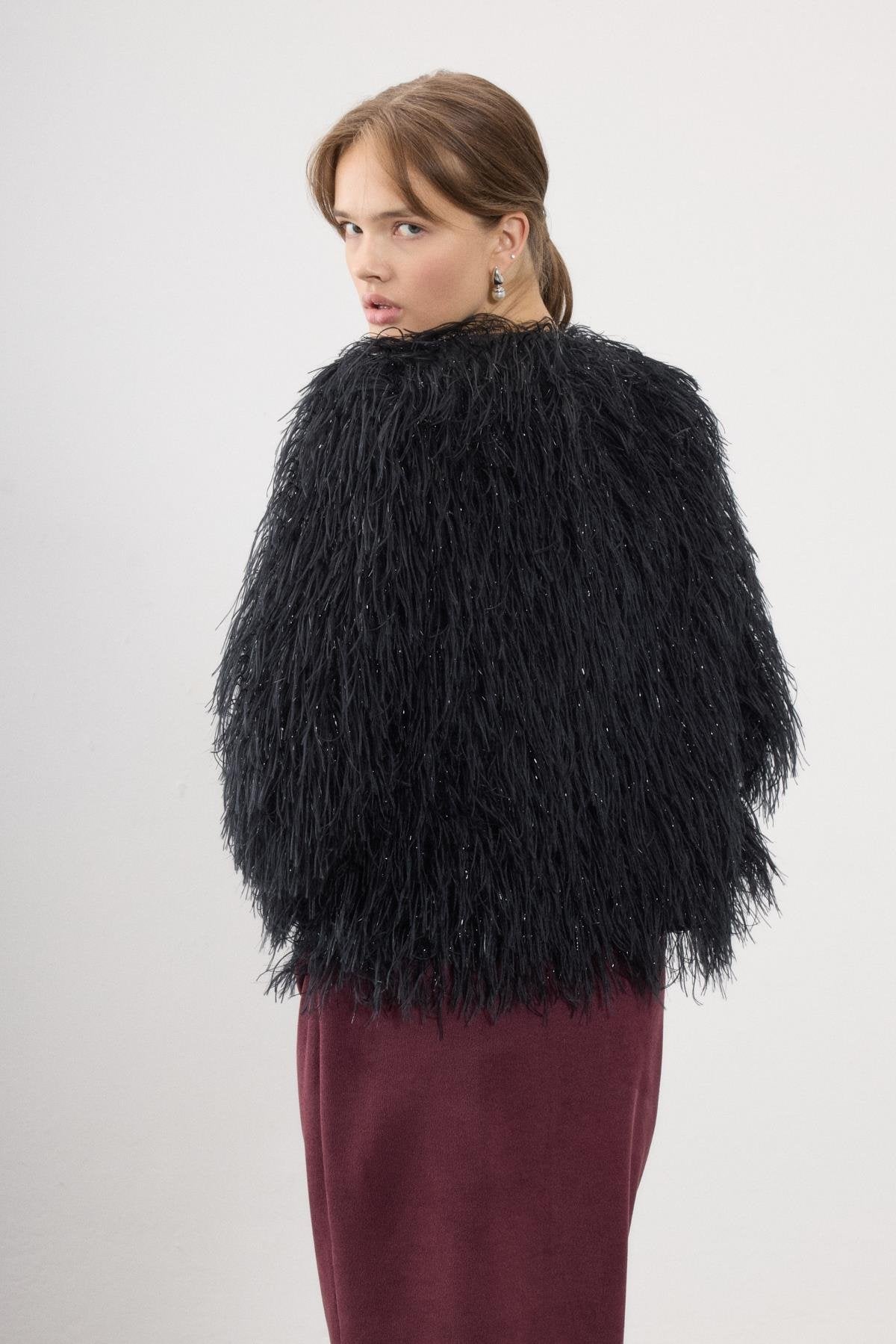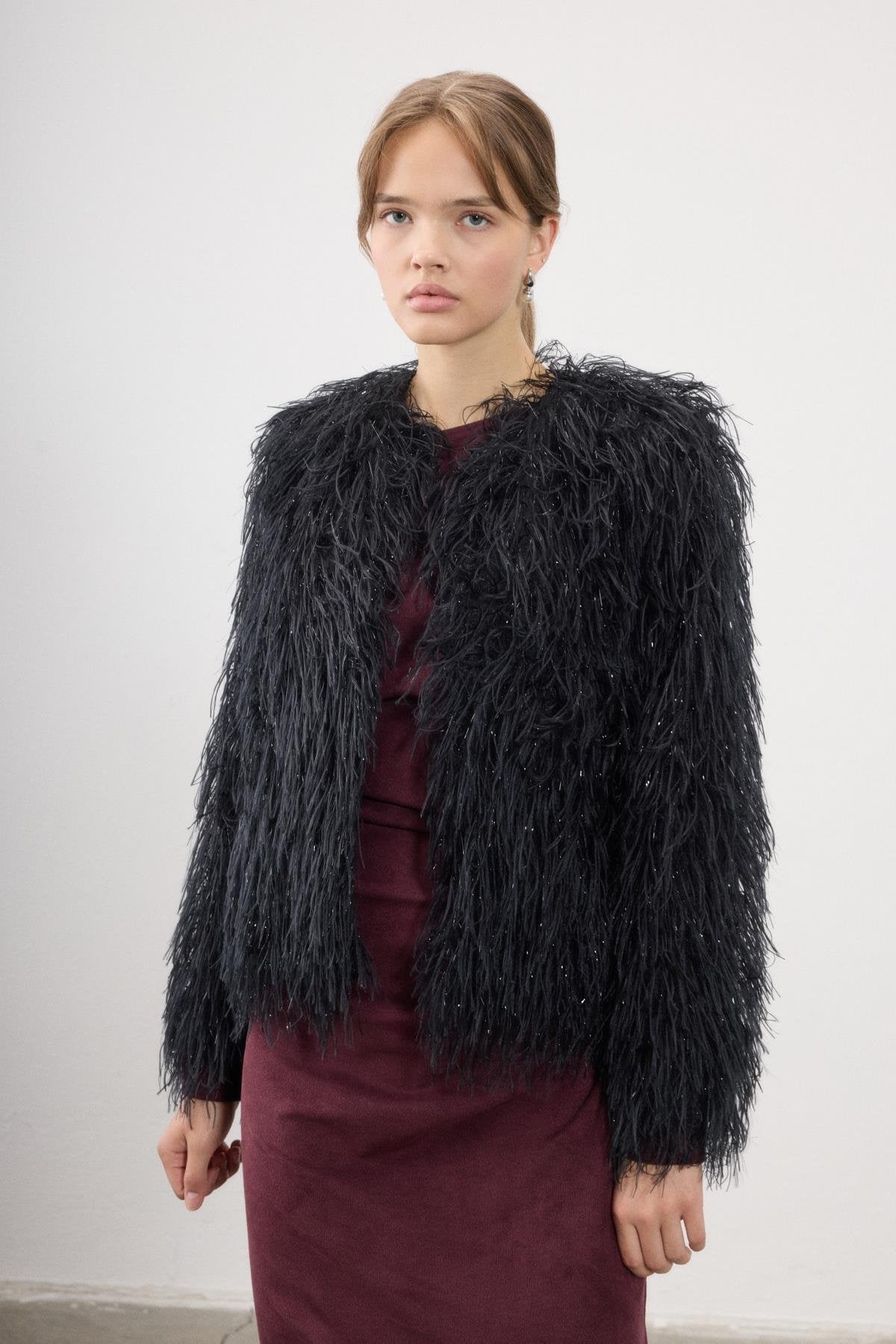 Crafted from textured feather-effect fabric with subtle shimmer, this open-front jacket brings luxurious movement and soft volume to your look. Perfect for layering over evening dresses or tailored ensembles for refined glamour.