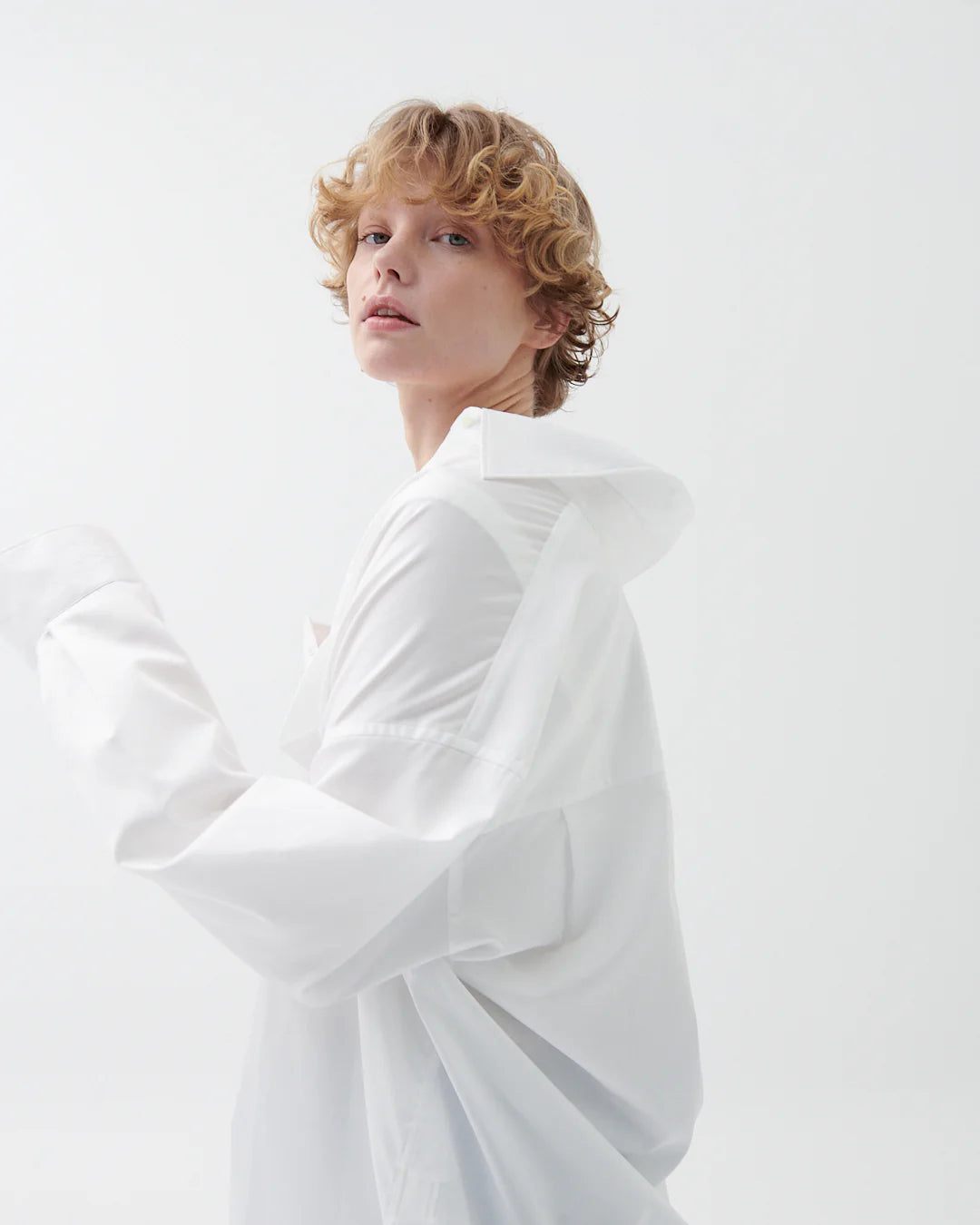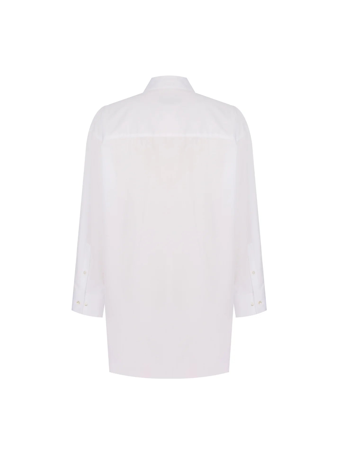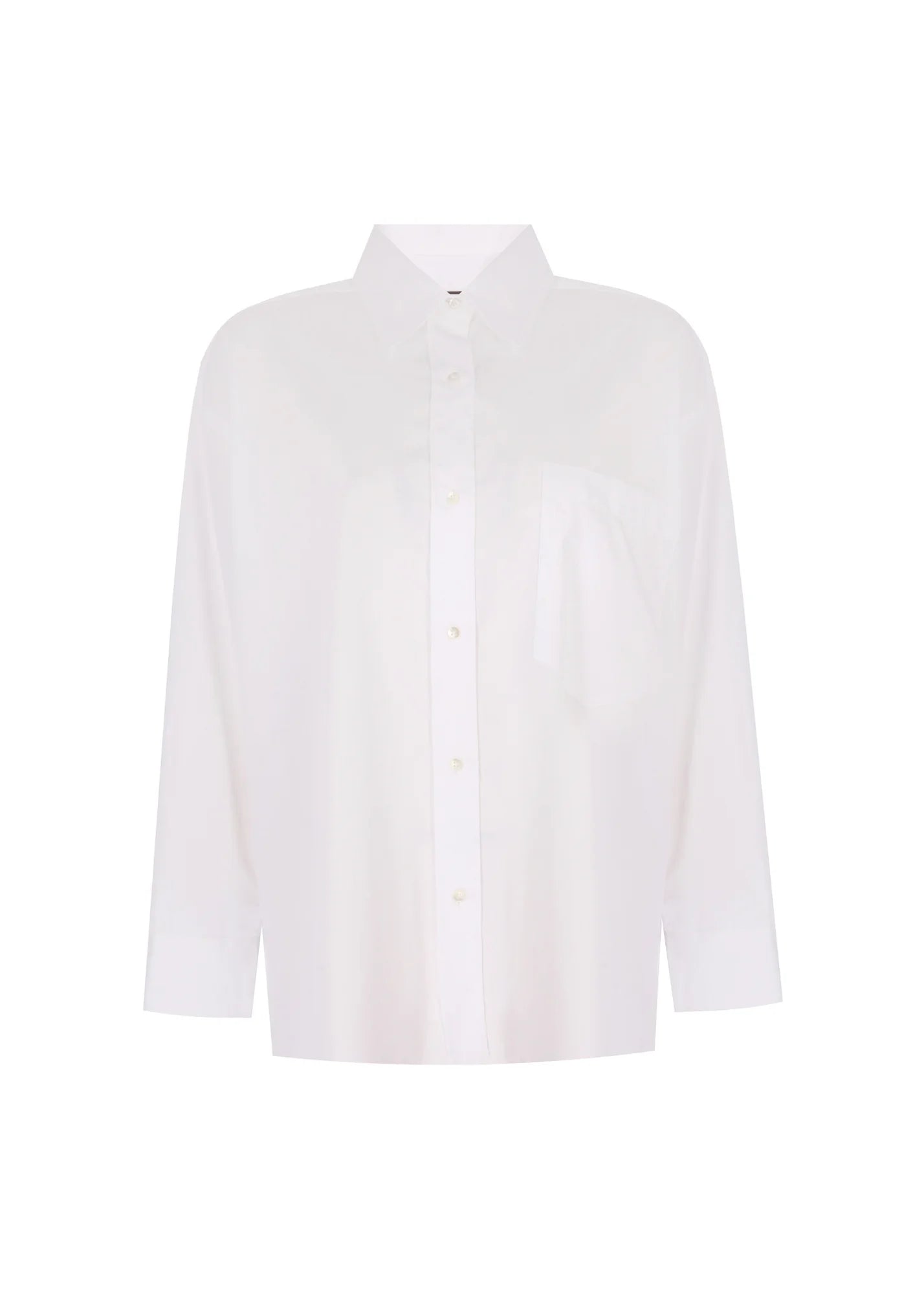 A timeless essential reimagined with modern detailing. This oversized shirt features a pointed collar, dropped shoulders, and a single chest pocket, offering effortless elegance. The subtle embroidered logo at the cuff adds a refined signature touch. Crafted from 100% breathable cotton, it blends natural comfort with versatile styling for both office and casual wear.