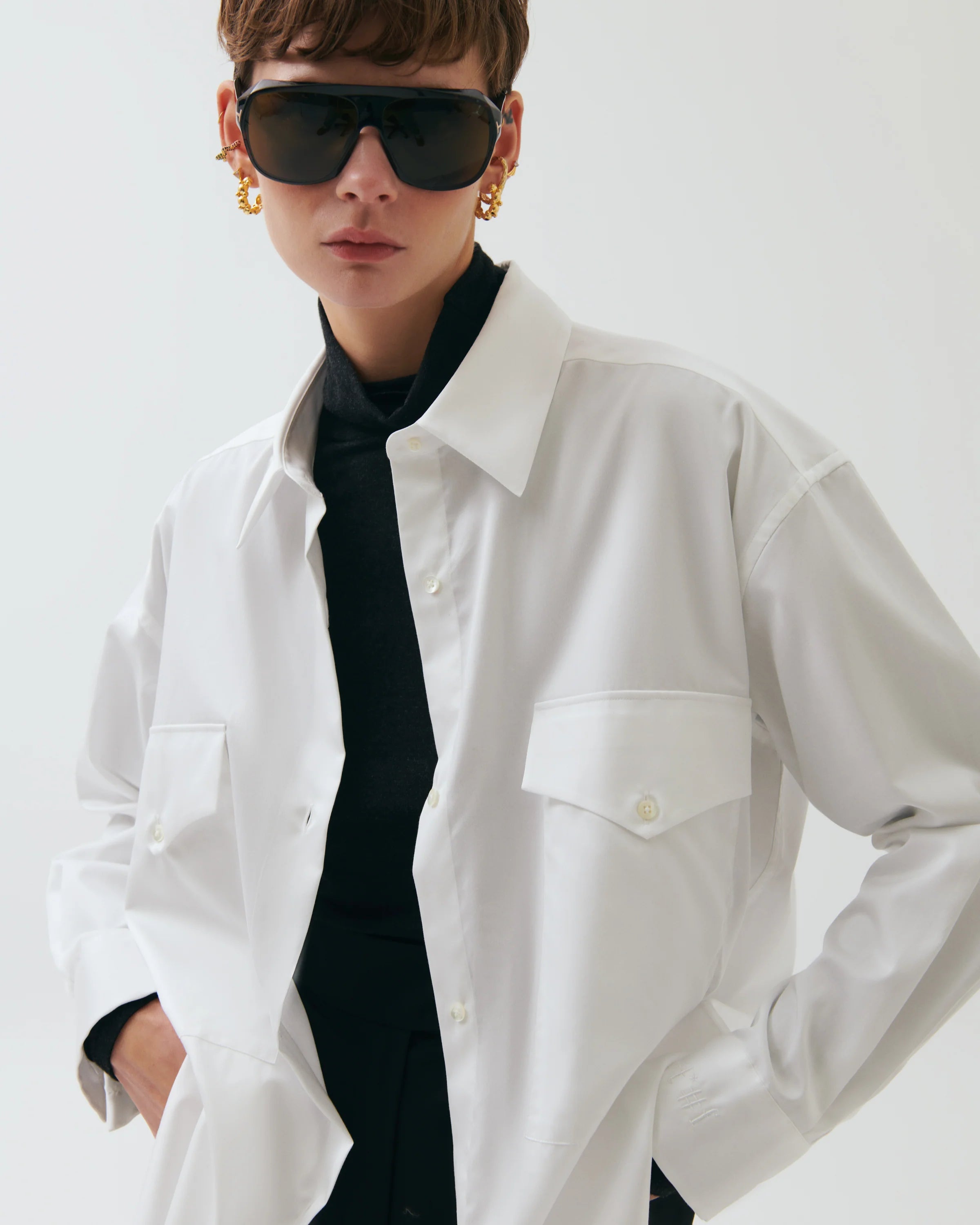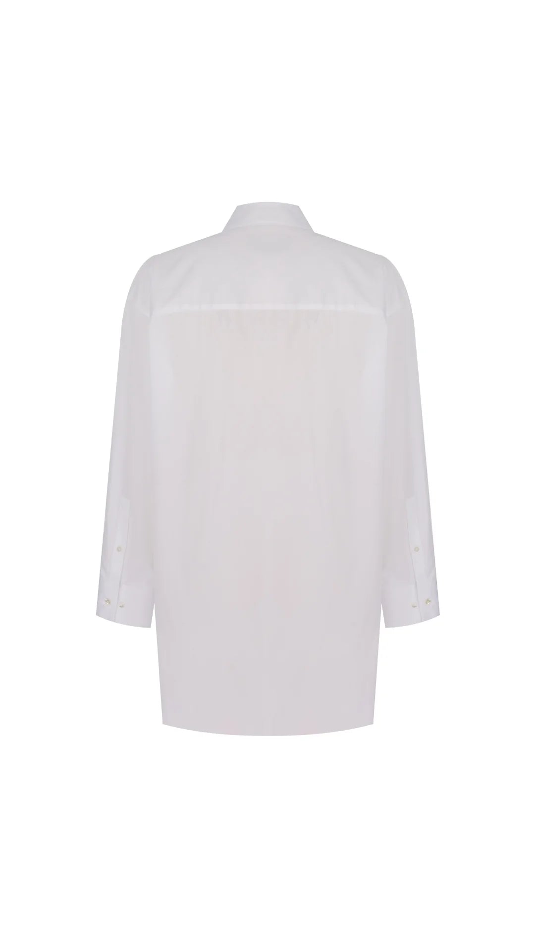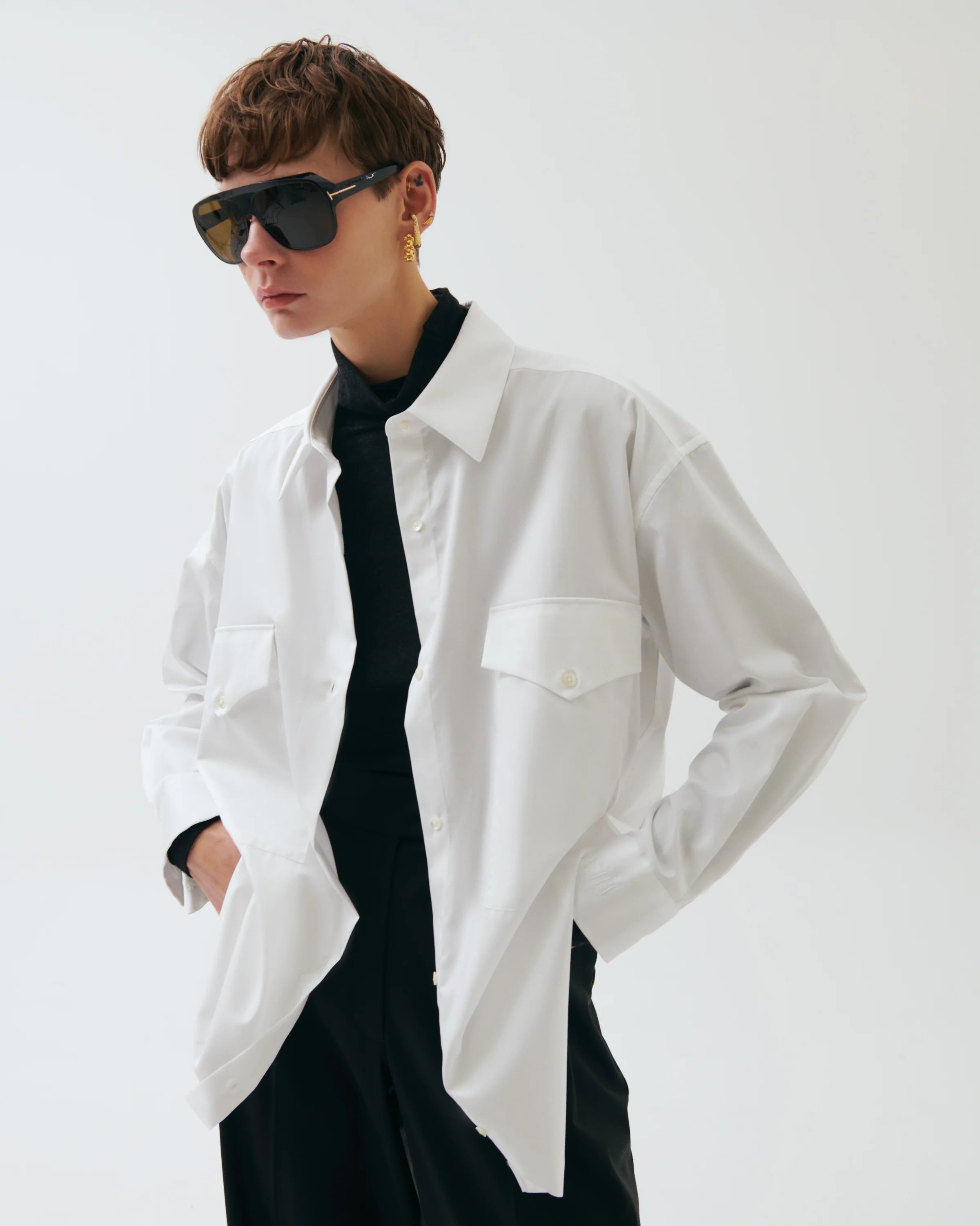 Designed with a bold oversized silhouette and functional details, this cotton shirt redefines everyday elegance. Featuring a pointed collar, long cuffed sleeves, and two oversized front pockets, it strikes the perfect balance between practicality and refined minimalism. Crafted from 100% breathable cotton, it ensures comfort while offering a timeless and versatile style for urban dressing.