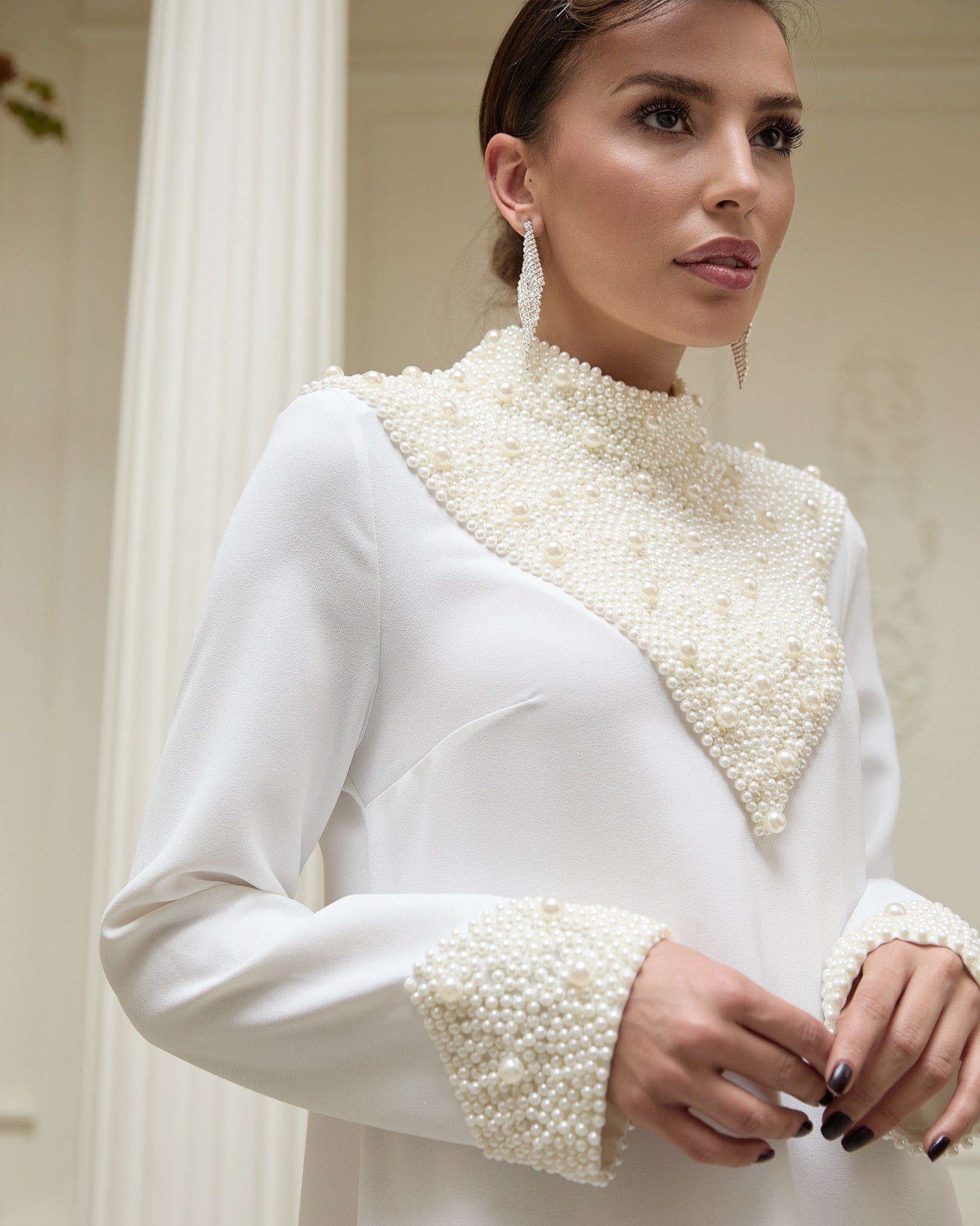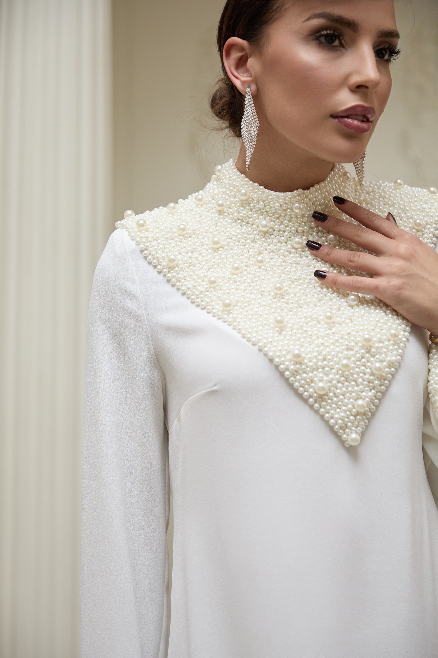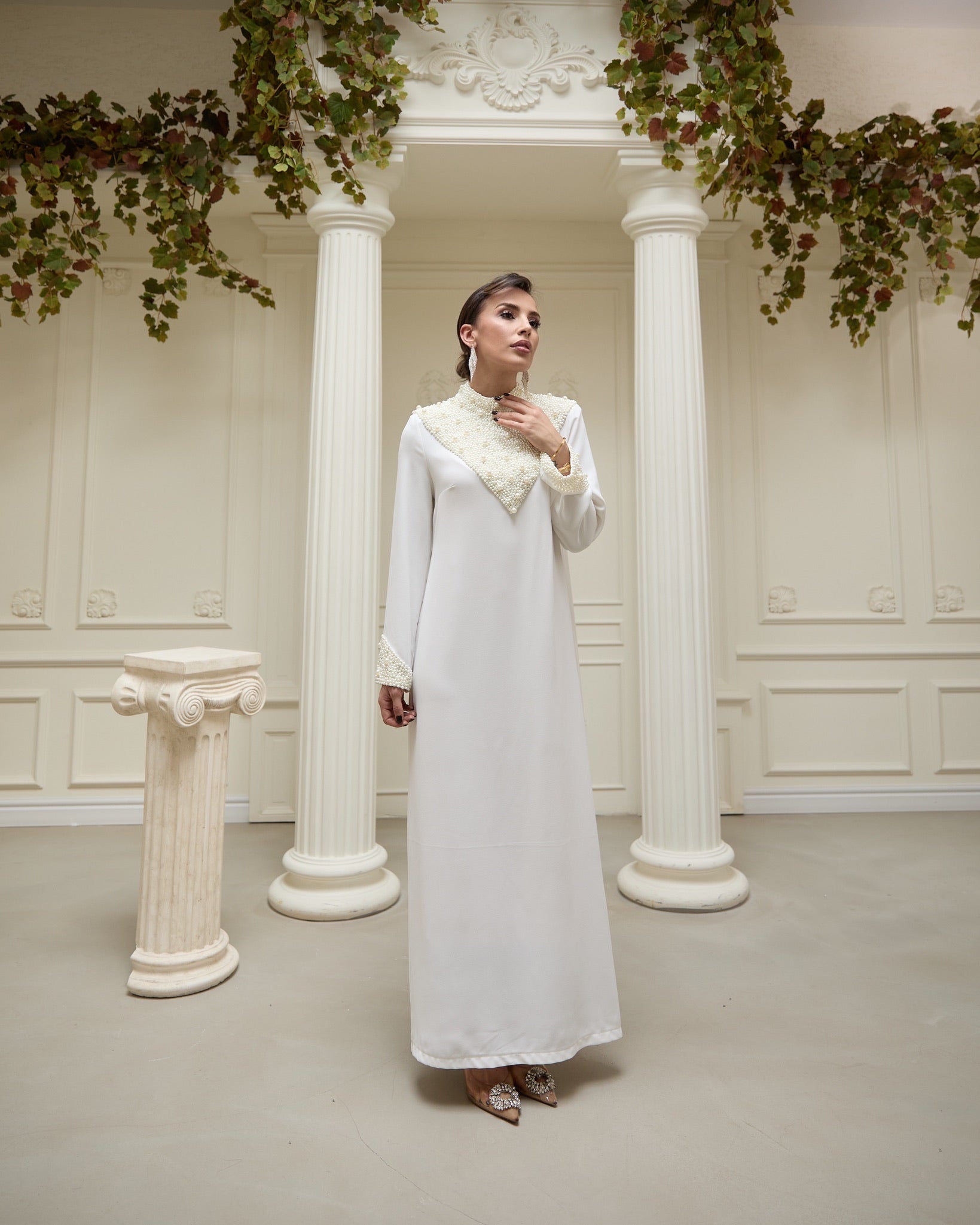 An exquisite statement of grace and craftsmanship, this satin maxi dress features intricate hand-applied pearl embellishments across the high neckline, cuffs, and front yoke. The flowing silhouette falls elegantly to the floor, evoking timeless sophistication for evening or ceremonial occasions. Designed without lining to maintain its lightweight drape, this piece embodies pure refinement with a modern modest sensibility.