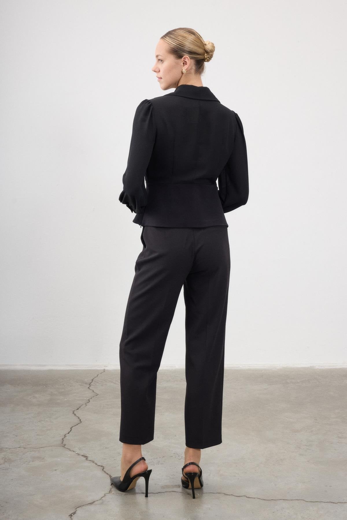 An elevated wardrobe essential defined by modern structure and timeless sophistication. This waist-fitted blouse features sharp pleats along the bodice and voluminous sleeves gathered at the cuffs. Golden button detailing adds a touch of understated luxury, while the tailored silhouette makes it ideal for both office and evening styling.