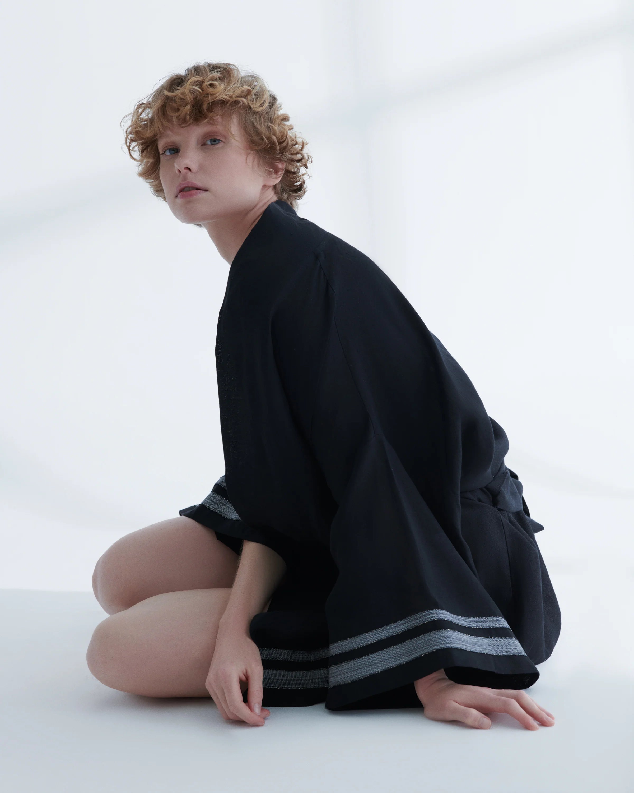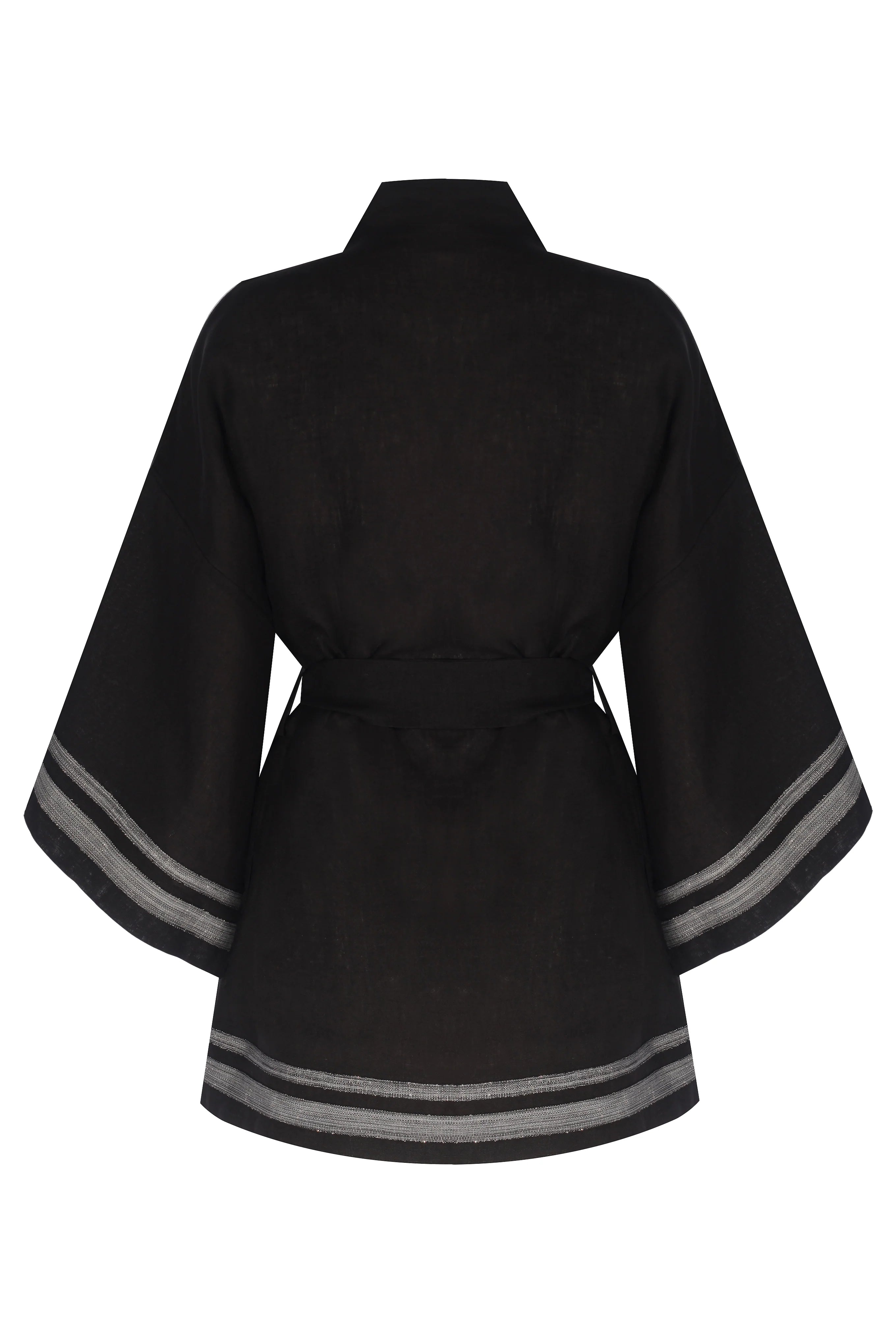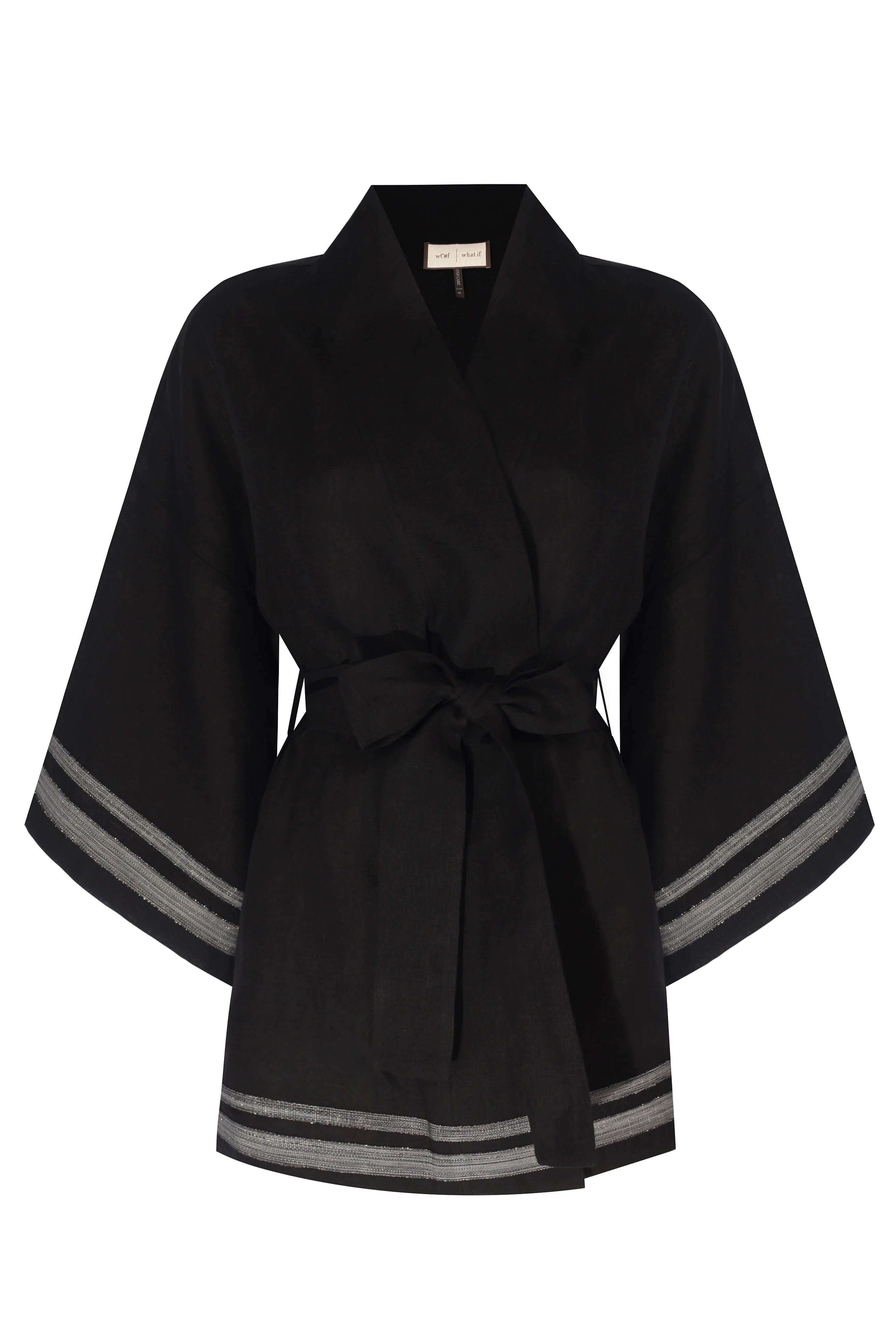 The Quinn kimono blends effortless elegance with modern detailing. Crafted from 100% linen, it features refined French trim along the sleeves and hem, adding a touch of sophistication to its relaxed silhouette. With its airy drape and breathable fabric, it offers comfort and versatility—worn as a short dress, layered over skirts, or styled as outerwear. A timeless piece designed to elevate summer wardrobes with understated luxury.
