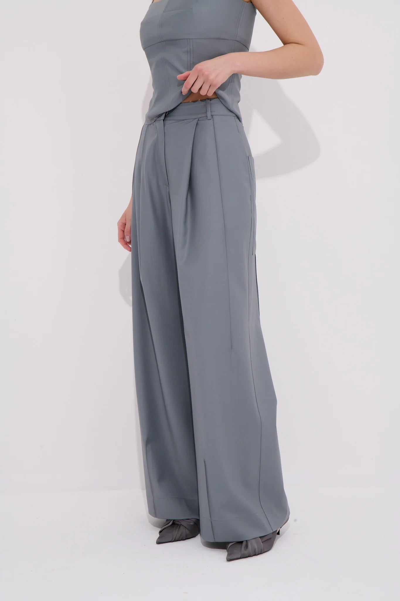 Featuring a high-rise waist and pronounced front pleats, the trousers are designed to create a sculpted, voluminous shape without sacrificing balance. Oversized back patch pockets lend subtle functionality and a sporty edge to the otherwise polished structure. Rendered in a soft yet crisp shade of grey, they bring an understated sophistication to any outfit.