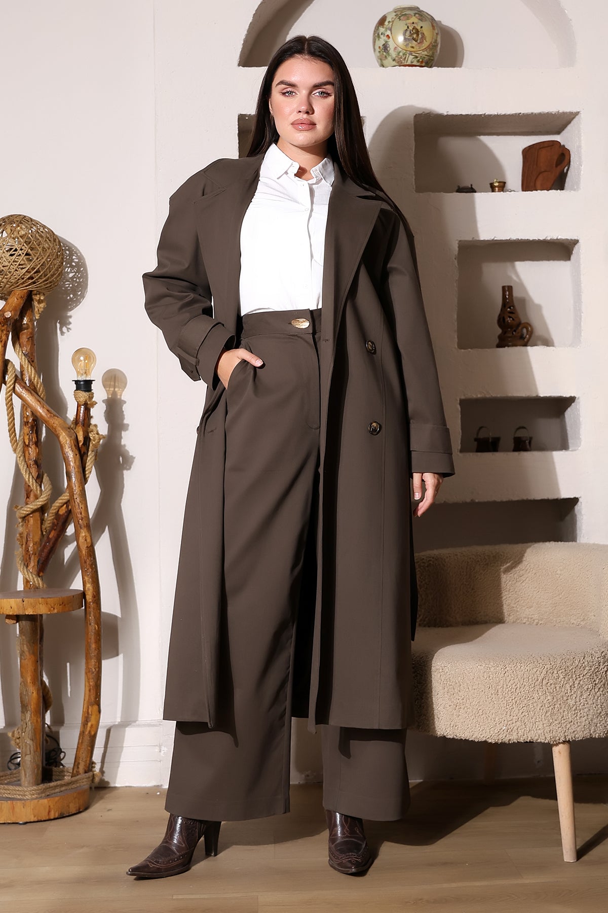 Elegant and versatile, this mocha trench coat captures the essence of refined modestwear. Designed with a tailored, elongated silhouette, it features a belted waist, double-breasted front, and wide lapels for a timeless finish. The full-length cut offers graceful movement and effortless layering, making it a perfect statement piece for transitional seasons.