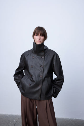 High-Collar Faux Leather Jacket – Black