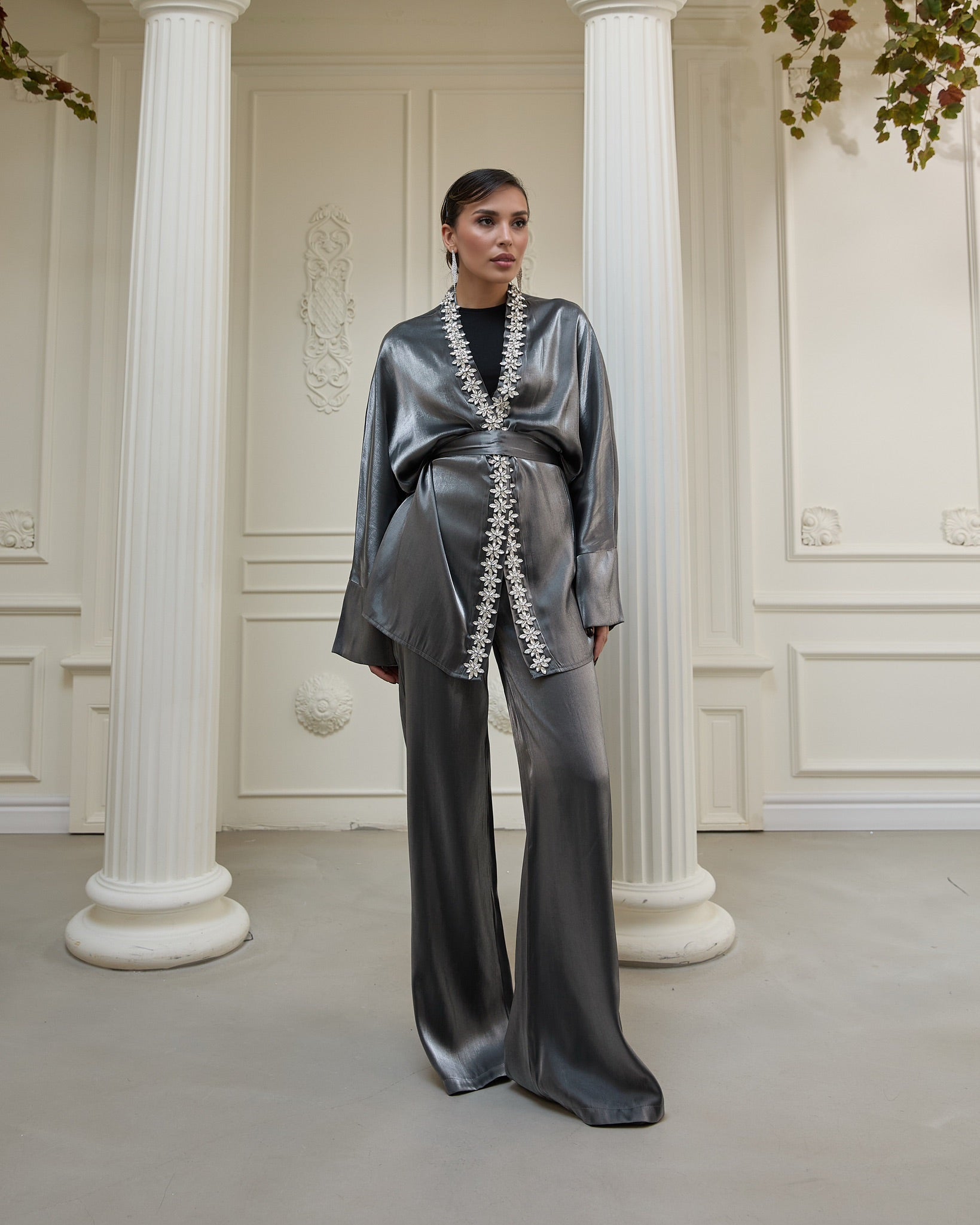 An exquisite fusion of contemporary design and artisanal craftsmanship. This two-piece ensemble features a fluid kimono-style jacket and wide-leg trousers, both crafted with luminous texture and graceful drape. The jacket is adorned with intricate floral embellishments made of lace and crystal stones, adding an elegant shimmer to its structured silhouette. Ideal for evening occasions or refined celebrations, this set embodies timeless sophistication with a modern edge.