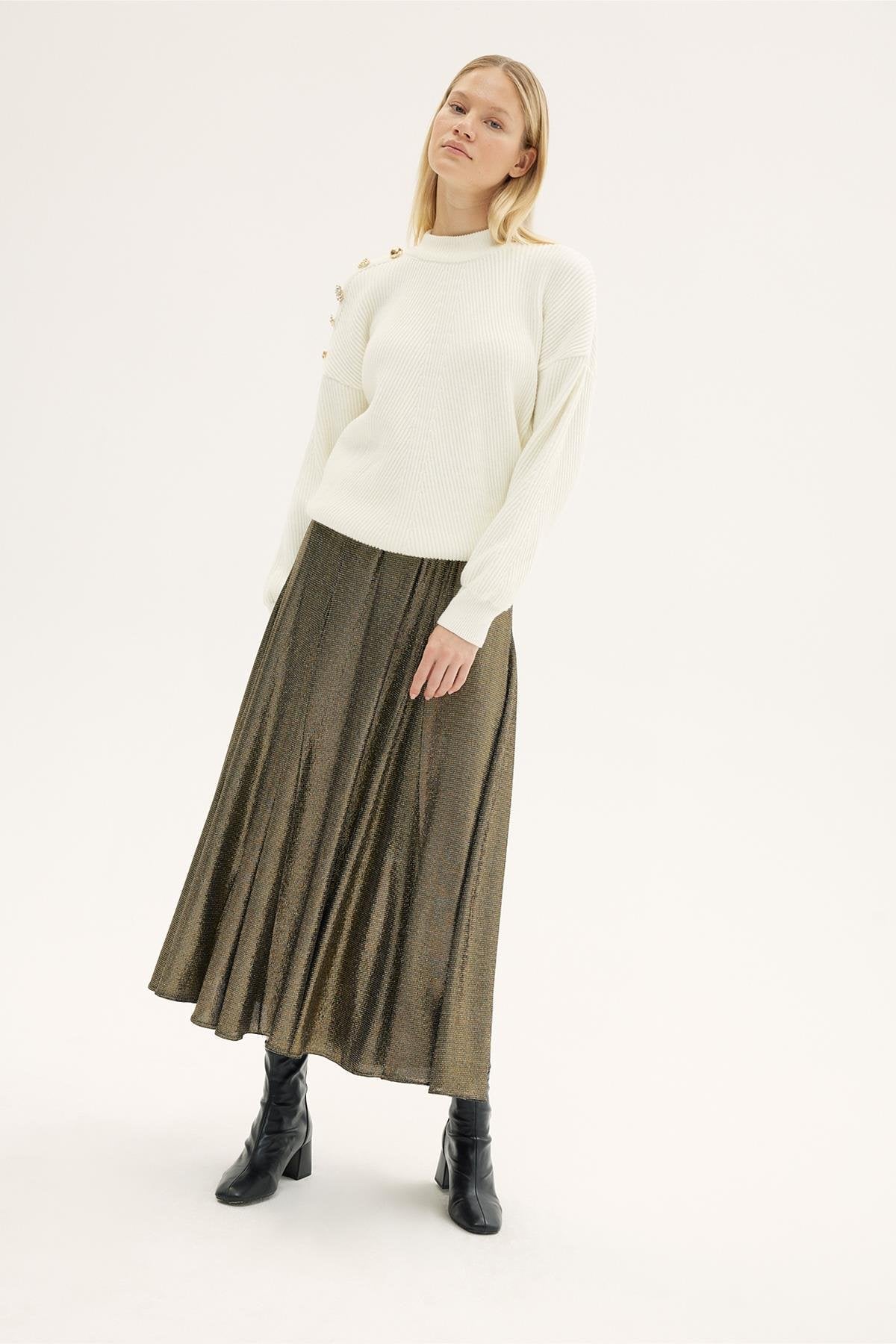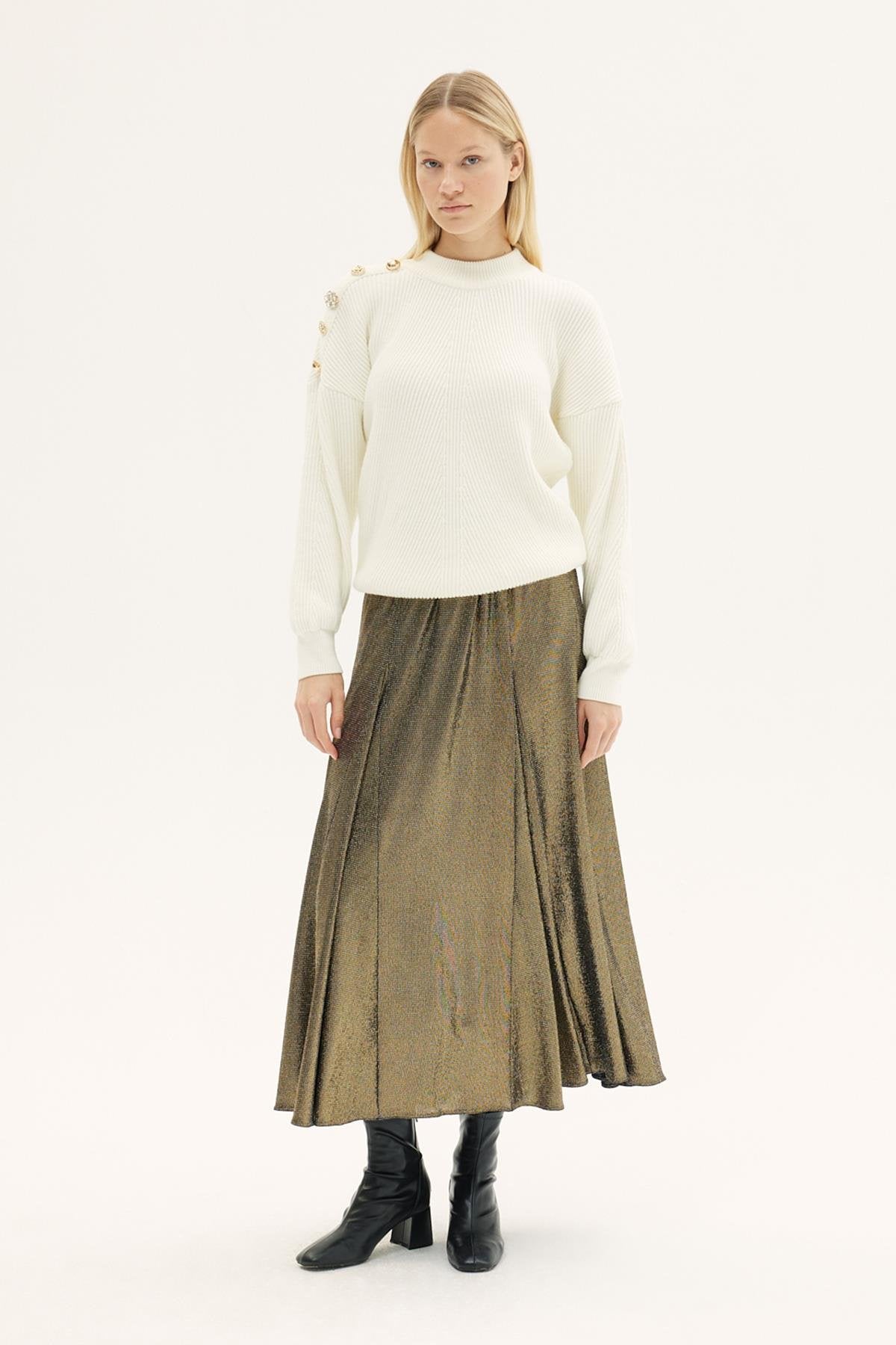 A statement of quiet elegance. The Juana skirt shimmers with a soft metallic glow, flowing effortlessly with every movement. Designed with a high-rise waist and a fluid flared silhouette, it captures a perfect balance of sophistication and ease. Ideal for both formal and evening occasions, this piece adds subtle glamour to any modest wardrobe.