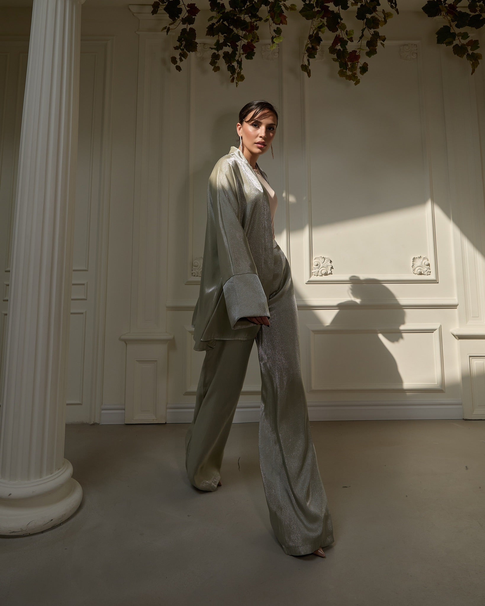 Refined elegance meets modern minimalism. This two-piece suit features a fluid kimono-style top and wide-leg trousers, crafted from a fine, subtly lustrous fabric that drapes beautifully with every movement. The belted waist highlights a graceful silhouette, while the minimalist design ensures timeless versatility — ideal for evening gatherings, special occasions, or elevated everyday wear.