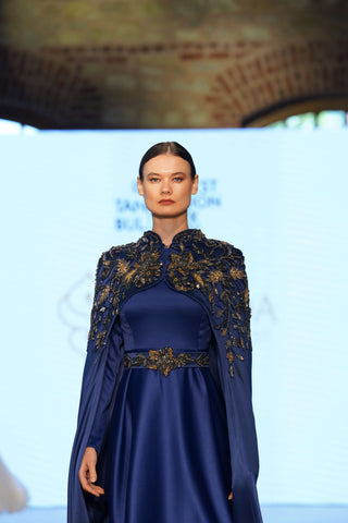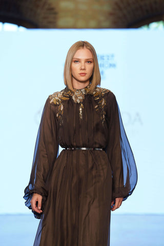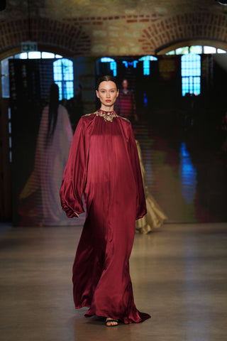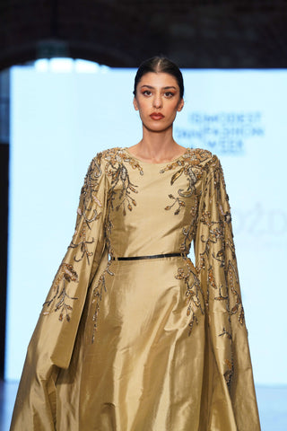 Emerald Echo Balcanian Pearl-Embroidered Silk Gown – Gold Beige