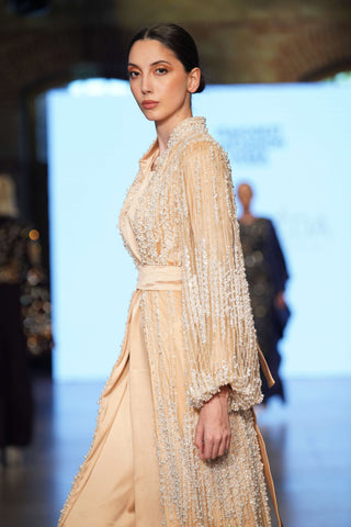 Golden Mirage Balcanian Pearl-Embellished Satin Gown – Gold Beige