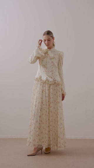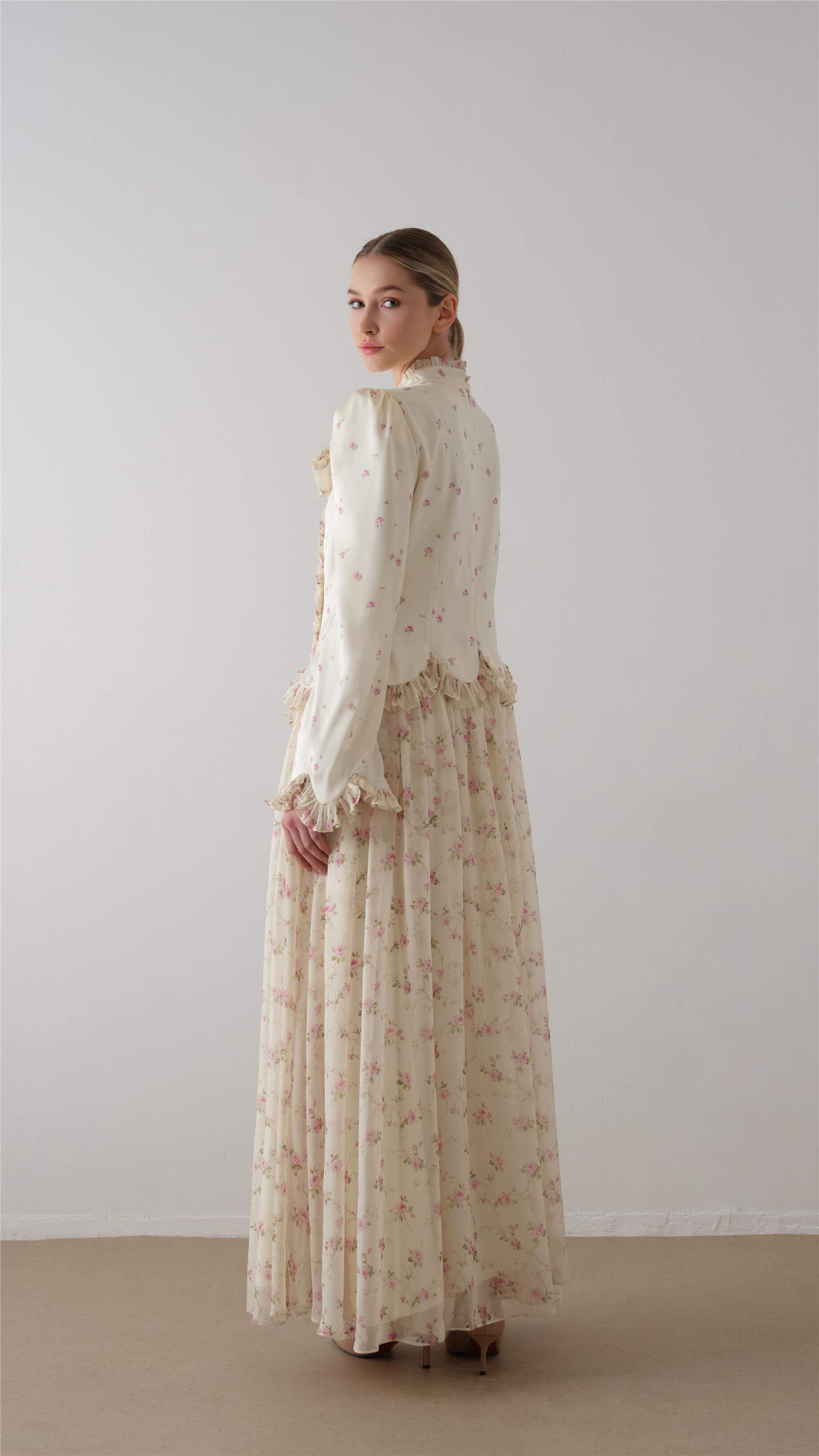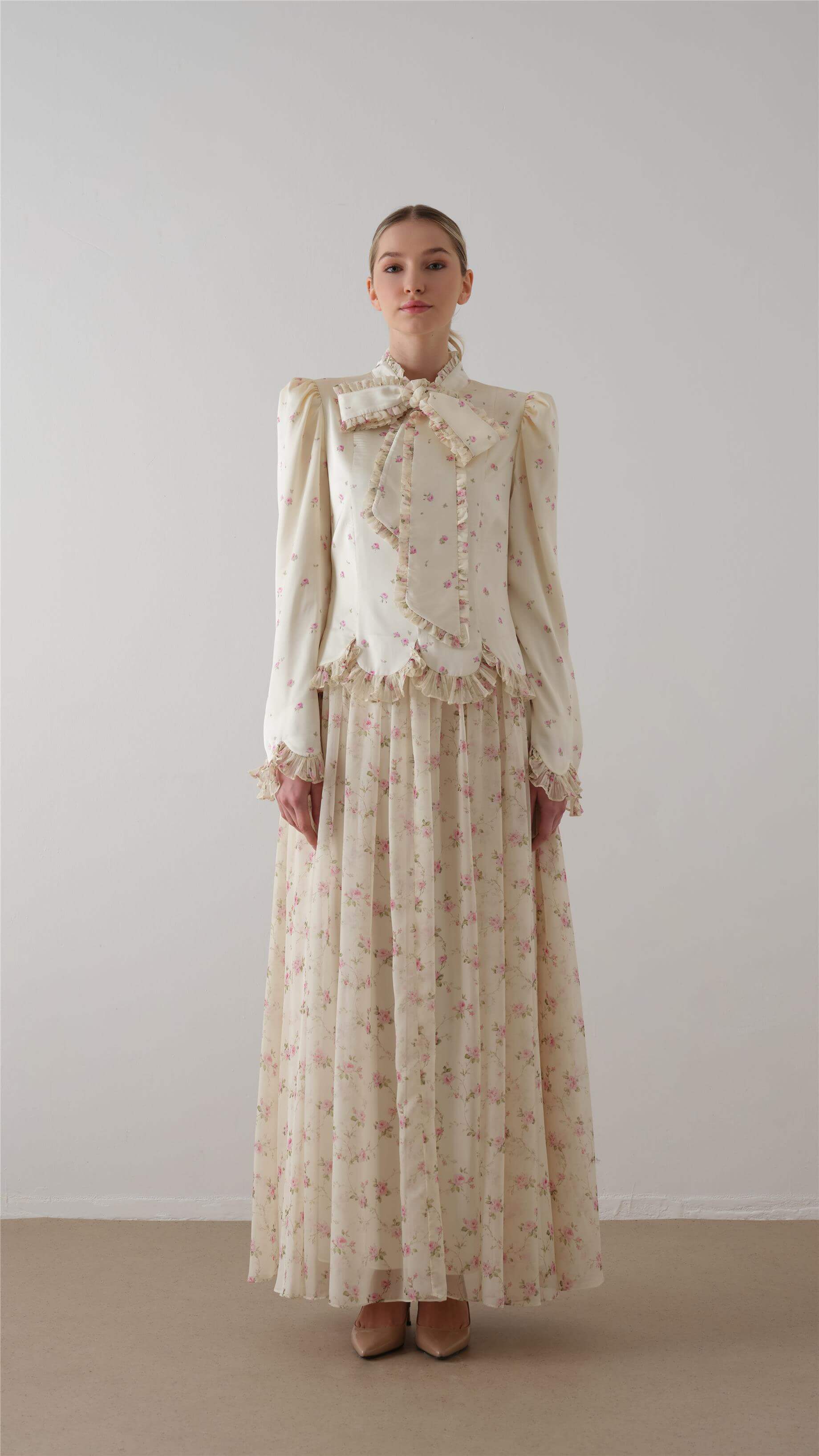 Romantic and timeless, this vintage-inspired maxi dress captures a graceful femininity with its delicate floral print and soft cream hue. The high neckline is adorned with a statement bow, while ruffled details along the cuffs and waist add a charming, period-drama elegance. Crafted in a lightweight flowy fabric, it offers both comfort and sophistication — perfect for garden gatherings, tea events, or special daytime occasions.