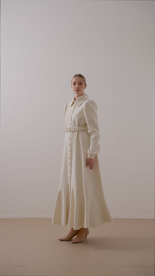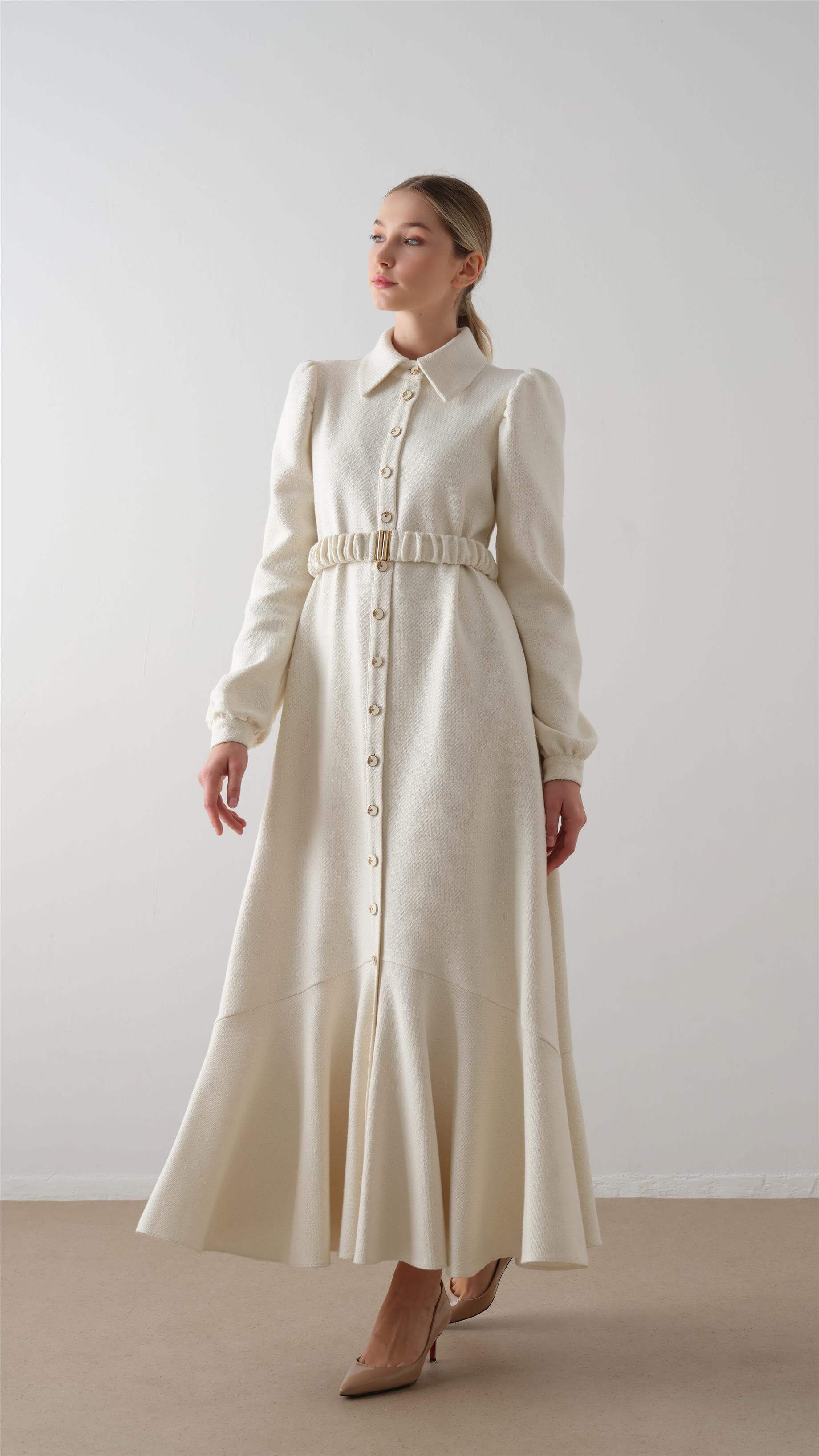 Elegant and refined, this tweed maxi dress brings timeless sophistication with modern modesty. Designed with a shirt collar and a full button-down front, it features a softly gathered elastic waist with a chic gold-buckle belt that enhances the silhouette. The textured Chanel-style fabric adds warmth and texture, making it ideal for transitional seasons and special occasions alike.