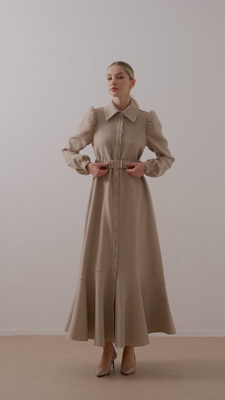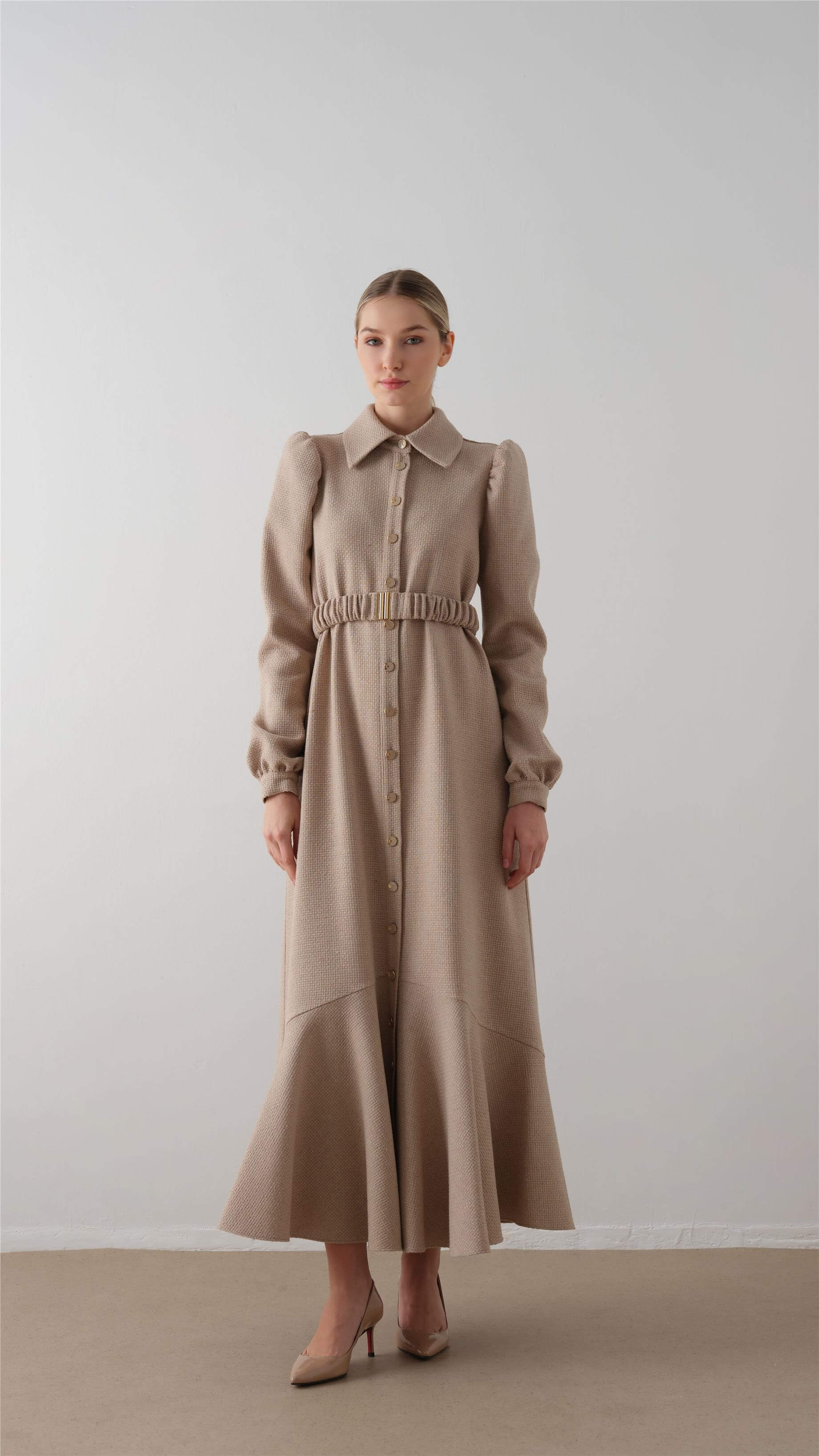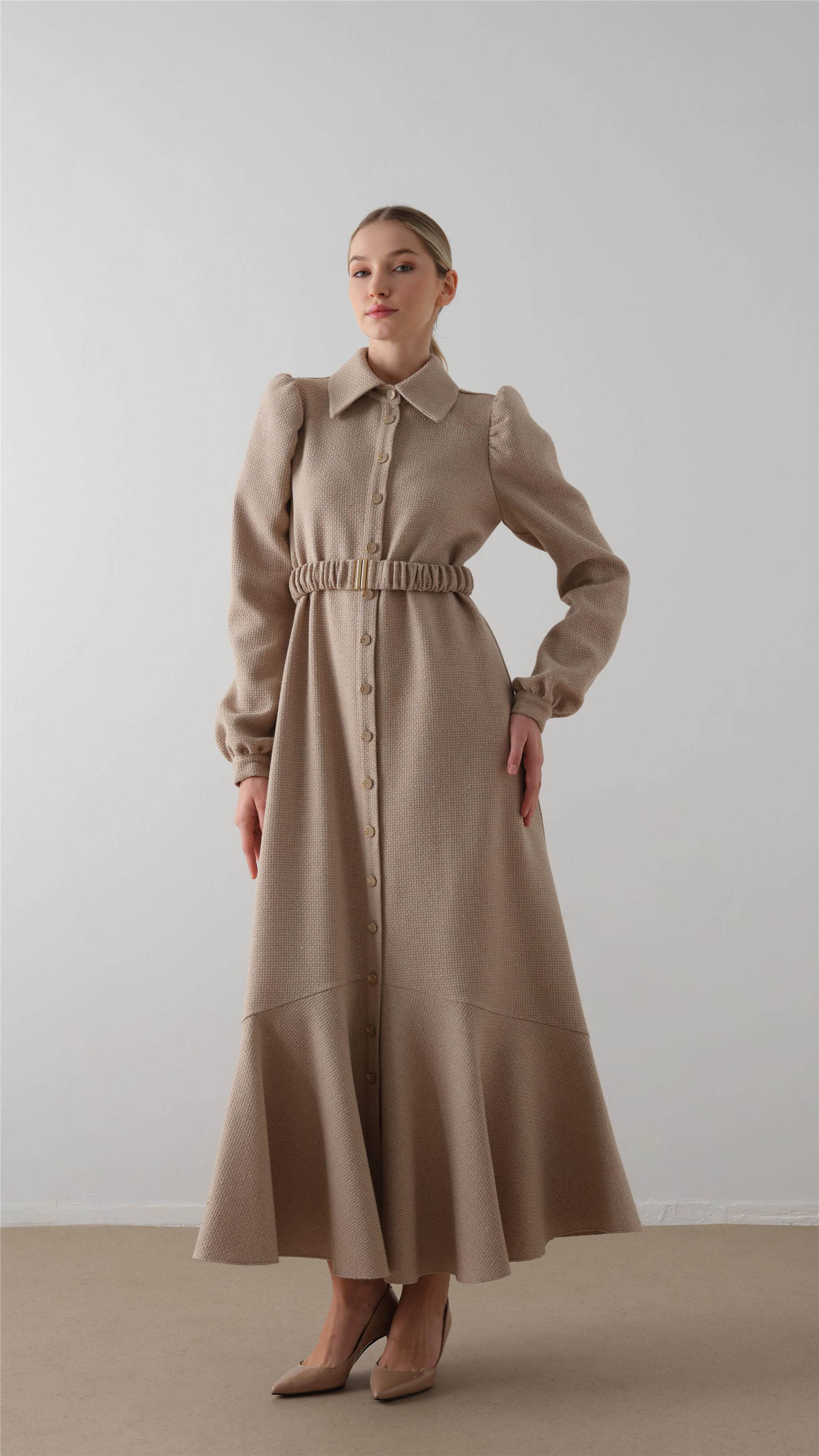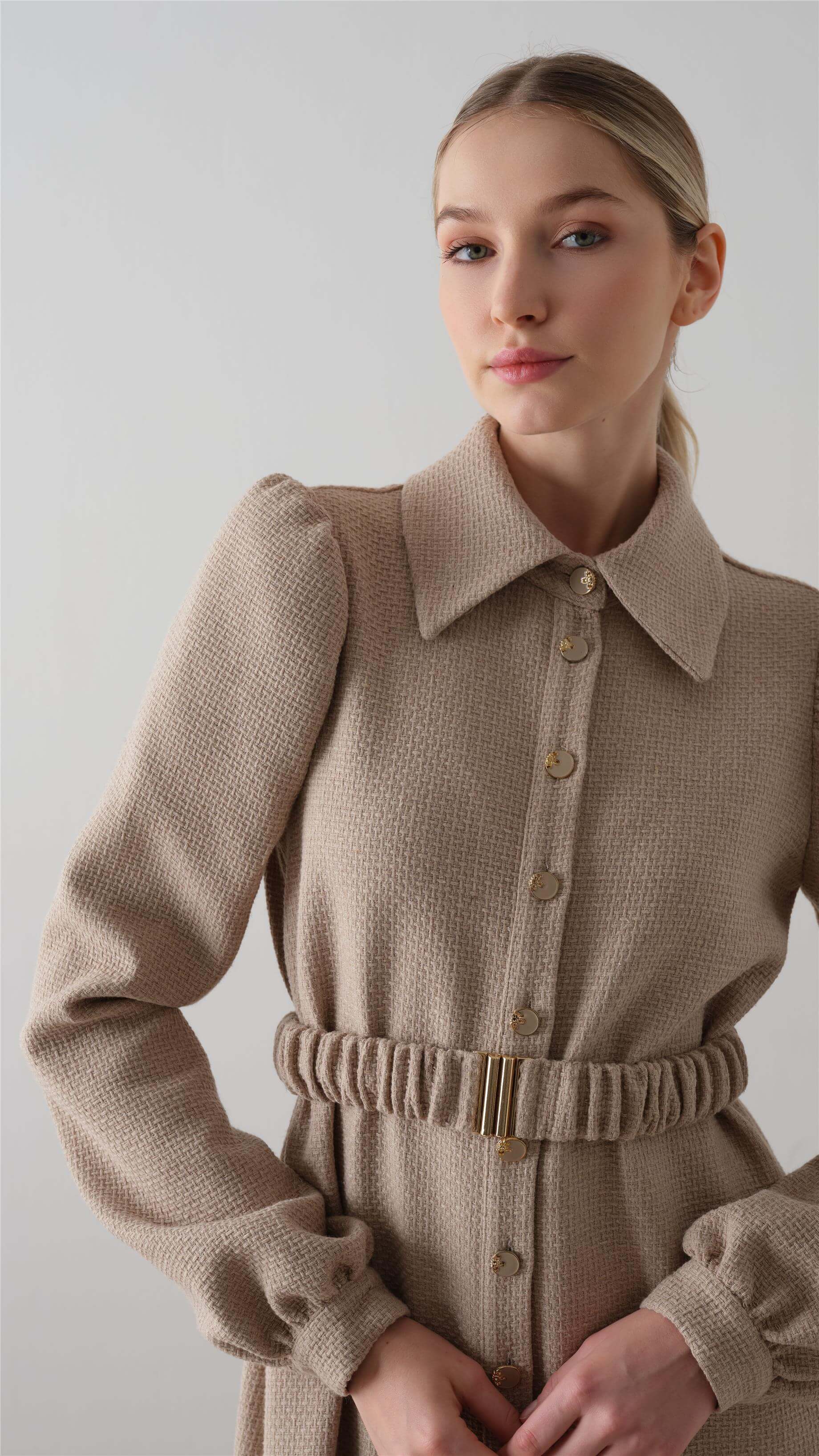 Elegant and refined, this tweed maxi dress brings timeless sophistication with modern modesty. Designed with a shirt collar and a full button-down front, it features a softly gathered elastic waist with a chic gold-buckle belt that enhances the silhouette. The textured Chanel-style fabric adds warmth and texture, making it ideal for transitional seasons and special occasions alike.