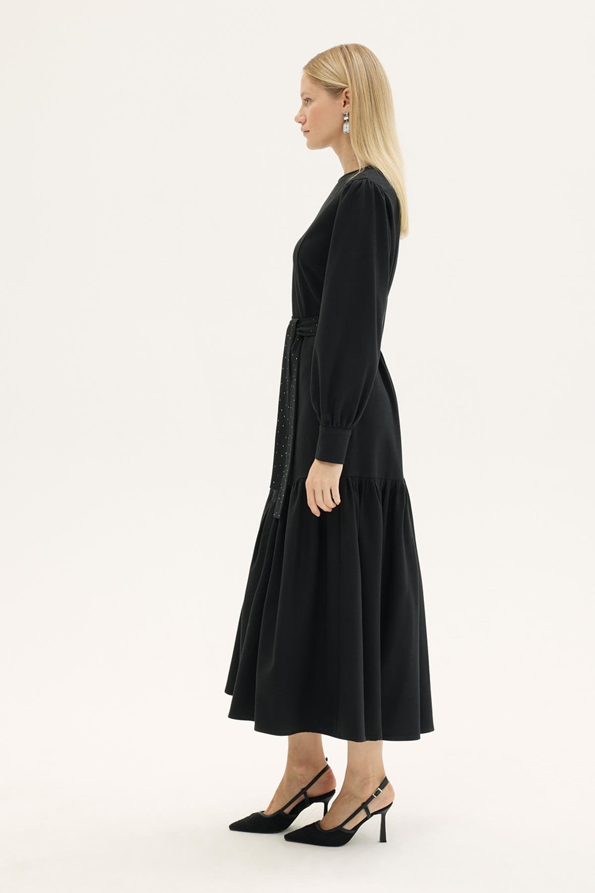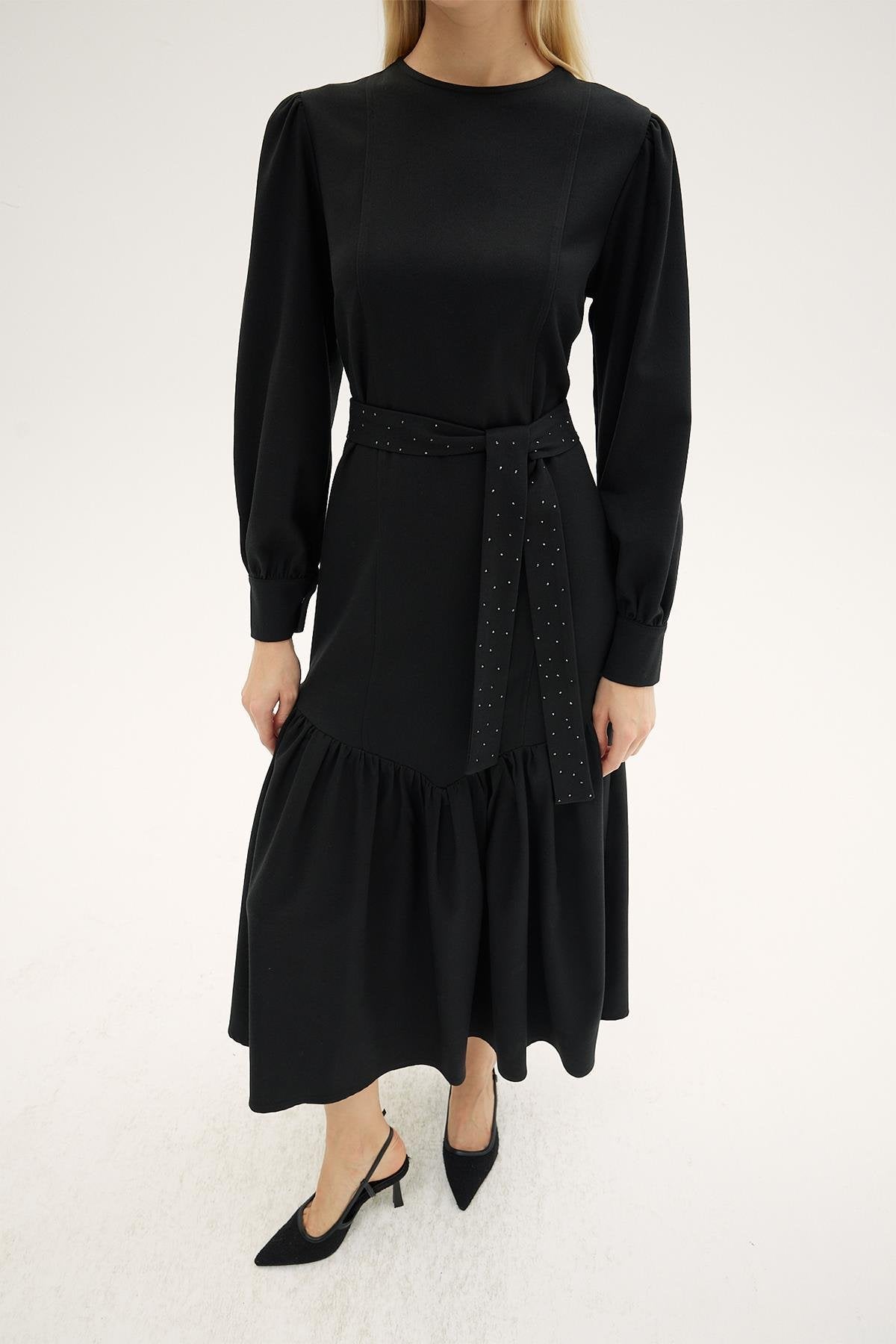 A refined midi dress crafted with a structured bodice and a fluid, softly gathered skirt. The matching belt enhances the silhouette while maintaining an elegant modest look, making it suitable for both everyday wear and special occasions.