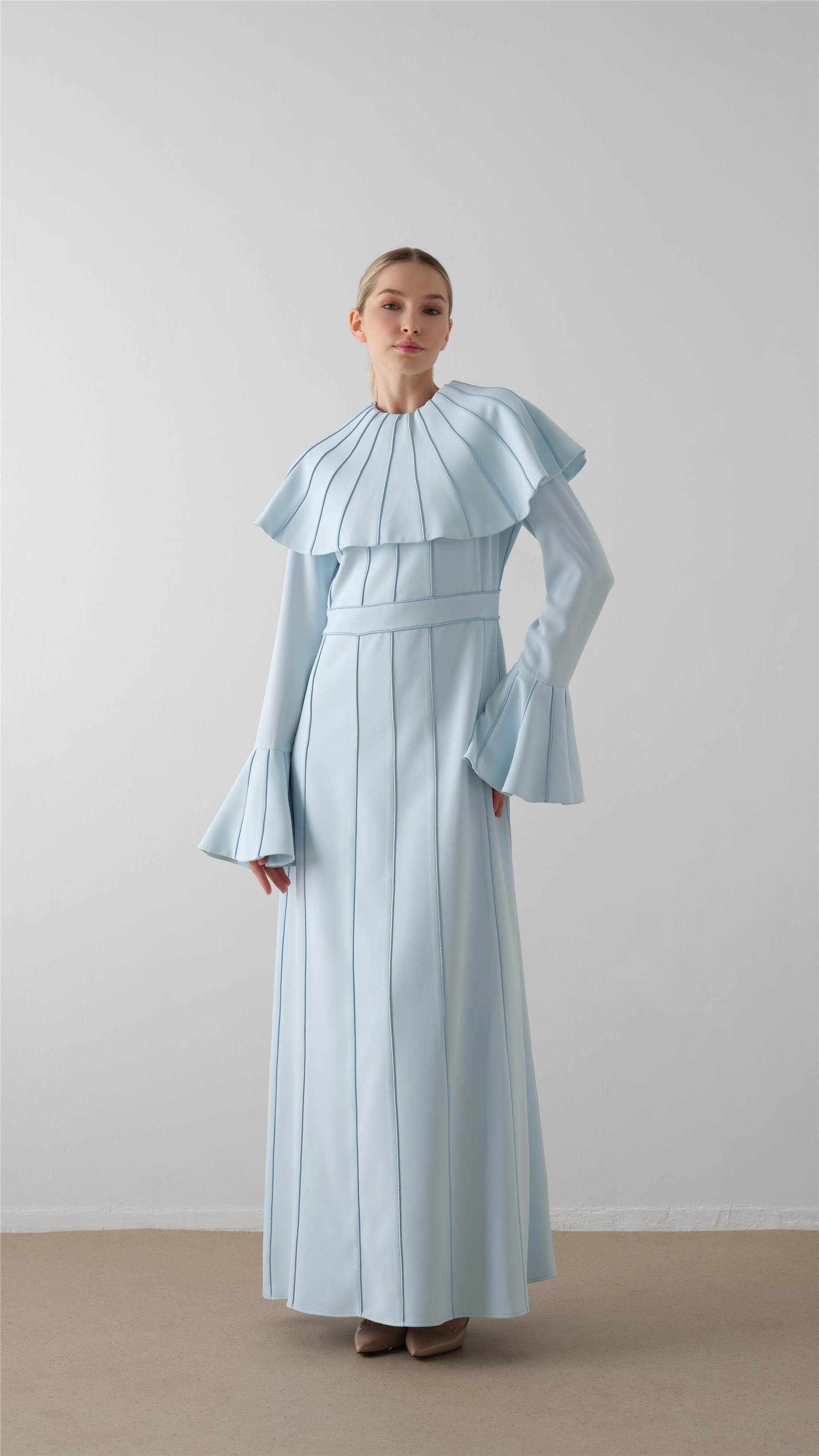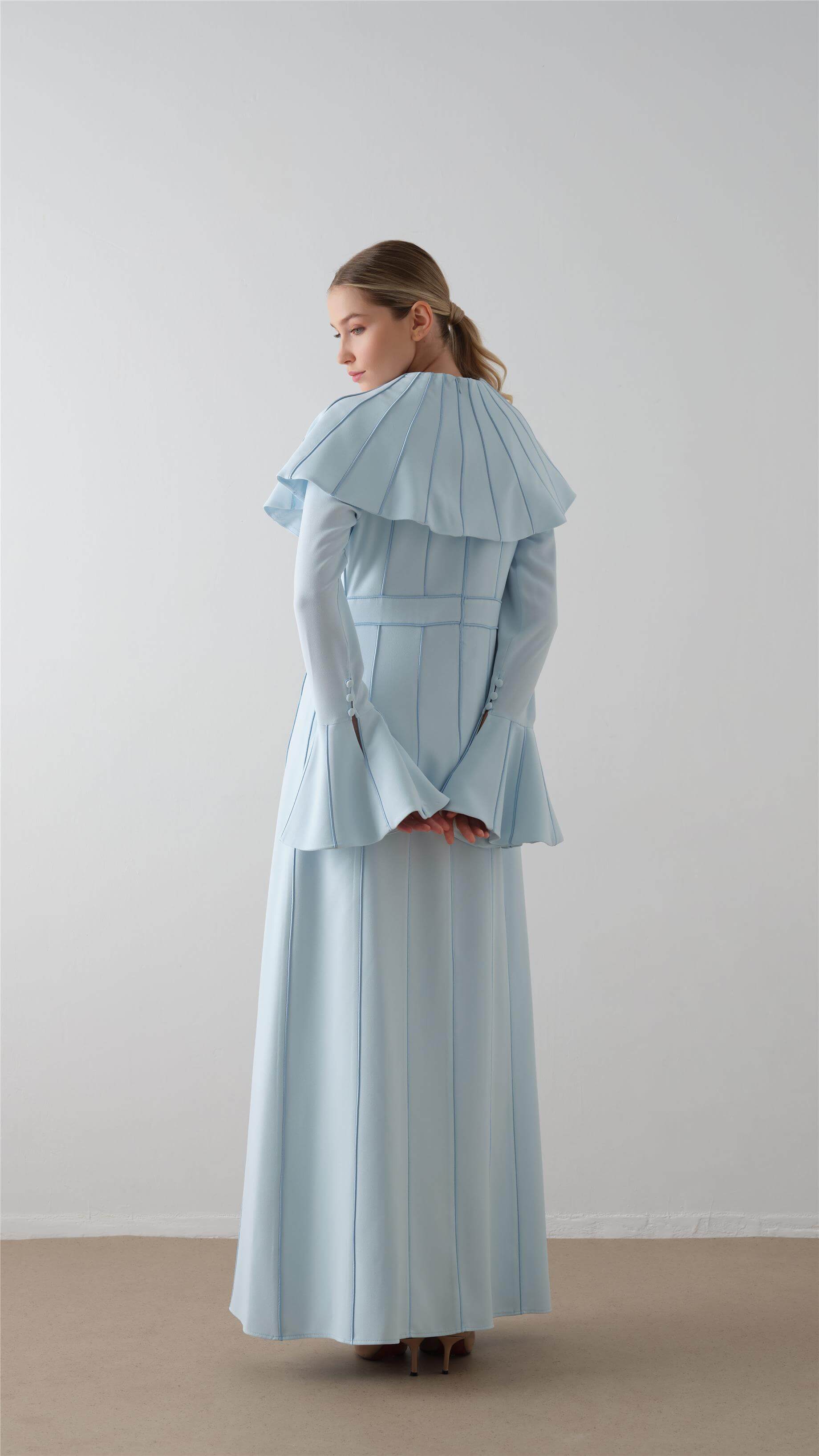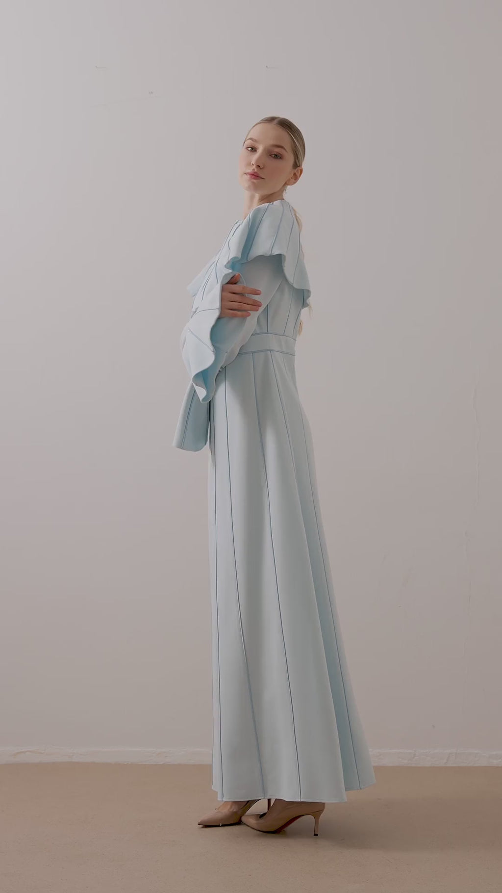 A refined statement piece that blends timeless grace with architectural design. This full-length crepe dress features an elegant cape overlay extending from the shoulders, creating a regal silhouette. The waistline is tailored for structure, while the flared cuff sleeves with panel detailing add dramatic yet sophisticated movement. Perfect for formal occasions or elegant evening wear.
