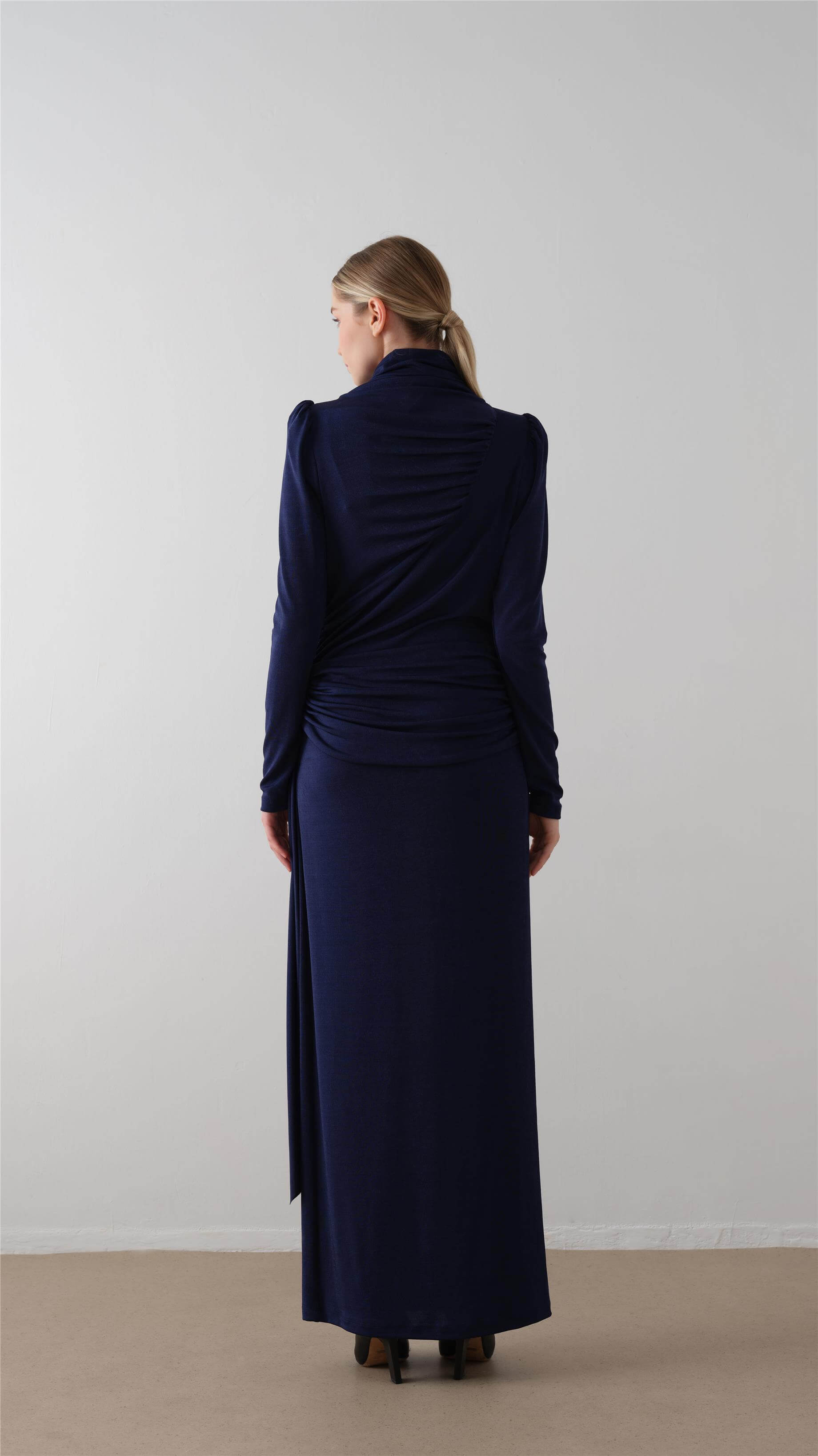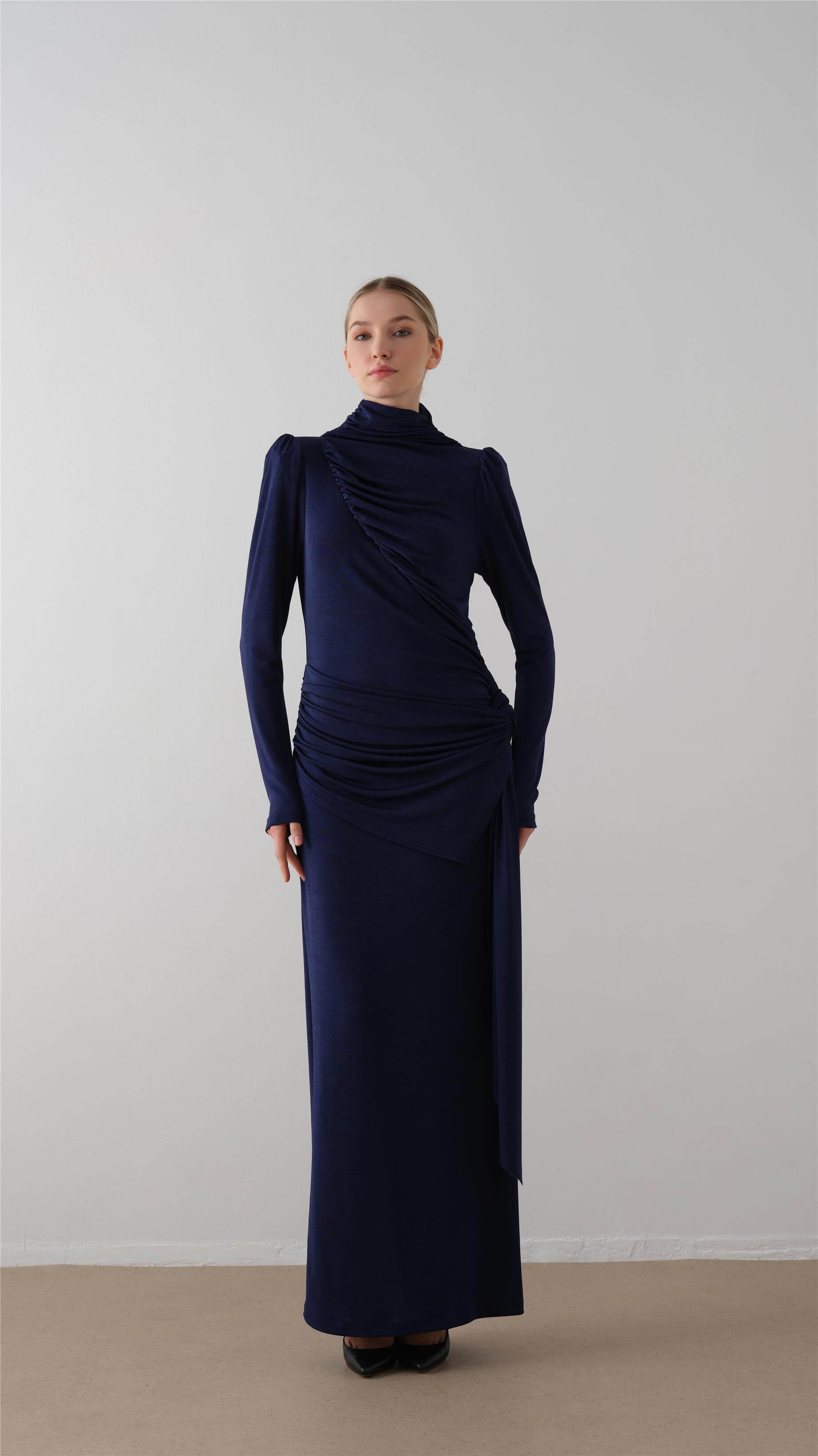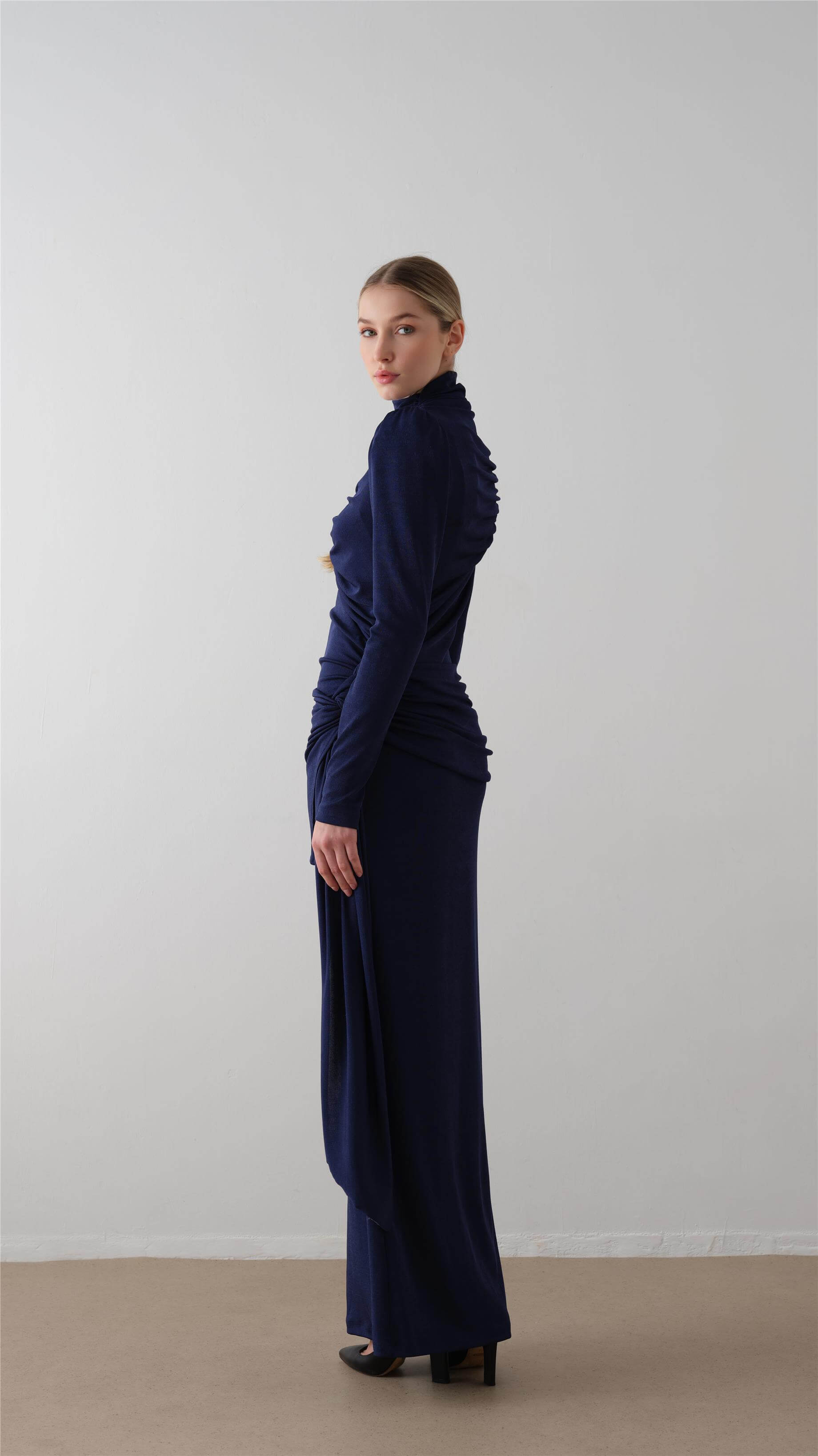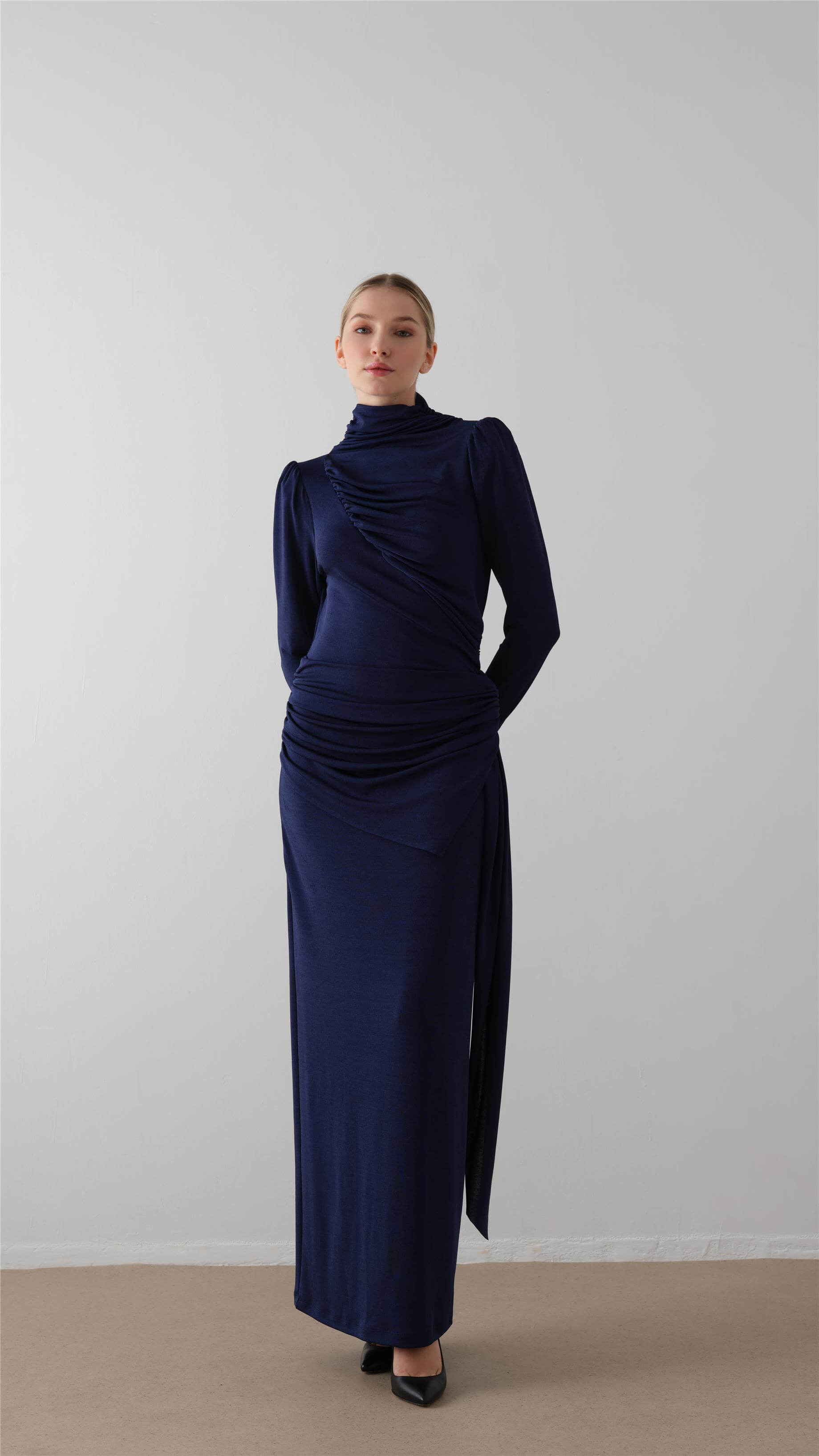 An effortlessly elegant piece designed to make a statement. Crafted from a soft stretch fabric with a subtle shimmer, this dress features a ruched bodice and side draping that beautifully enhance the silhouette. The high neckline and long sleeves add a touch of sophistication, making it ideal for formal gatherings or evening events.