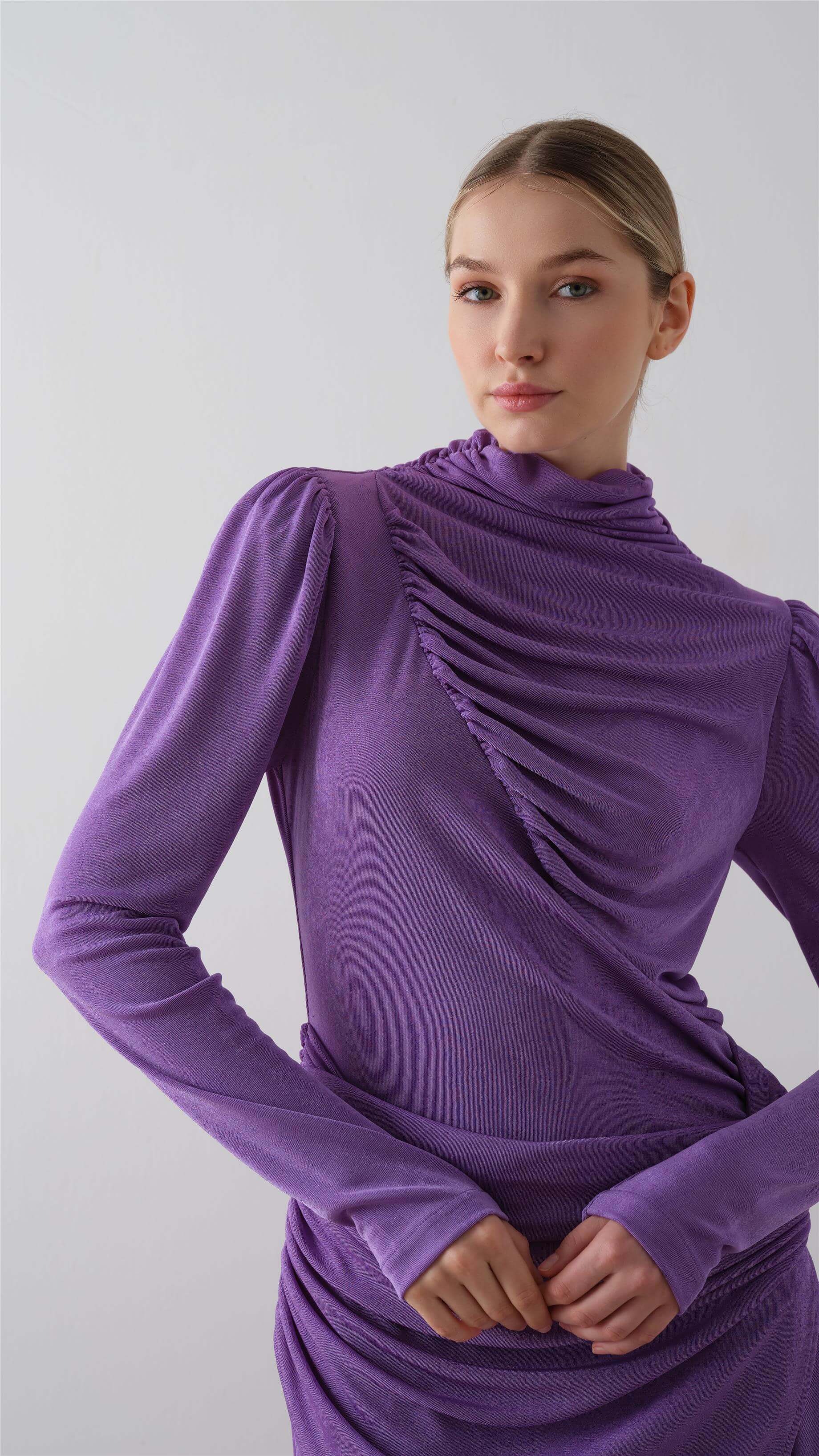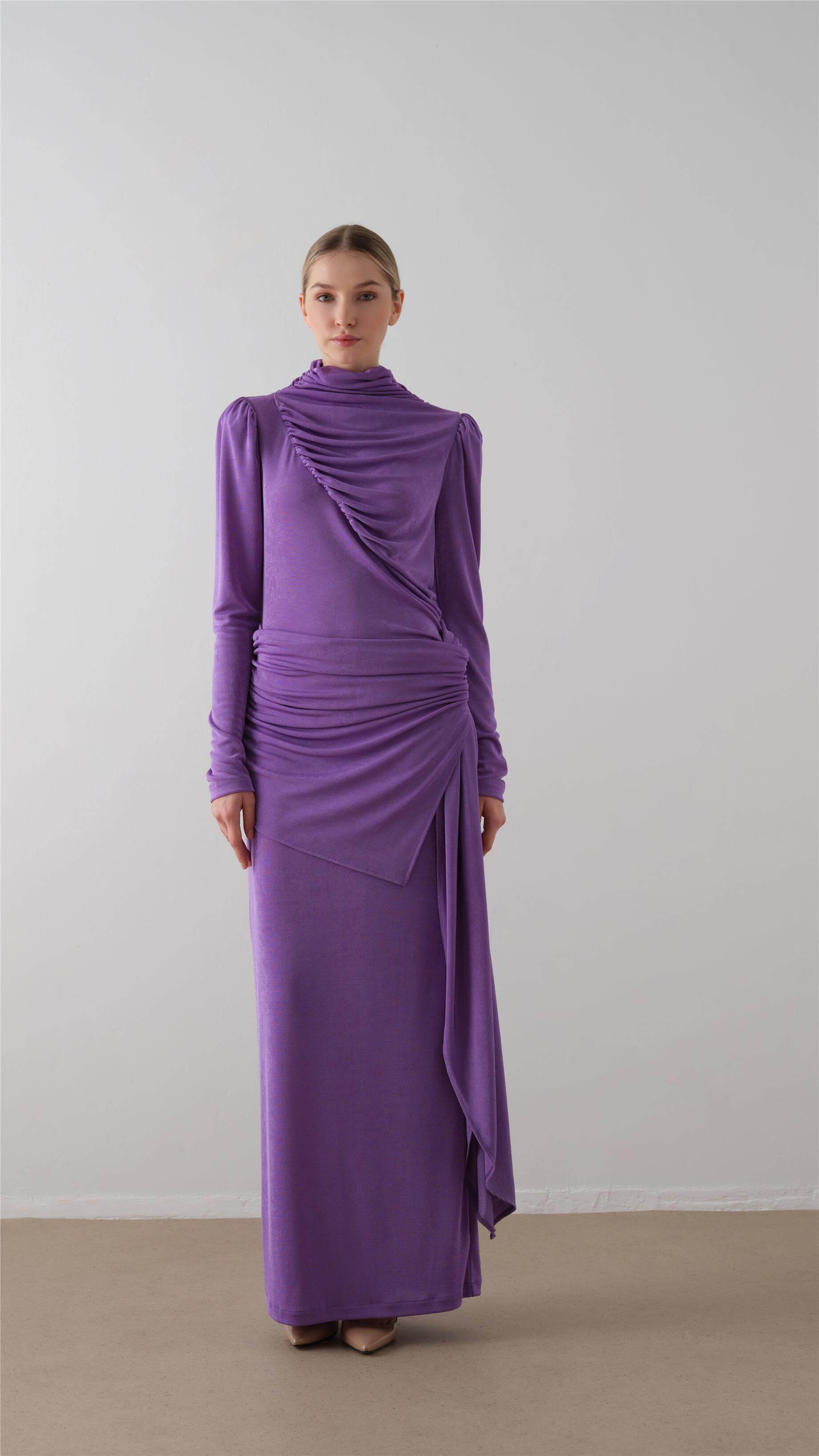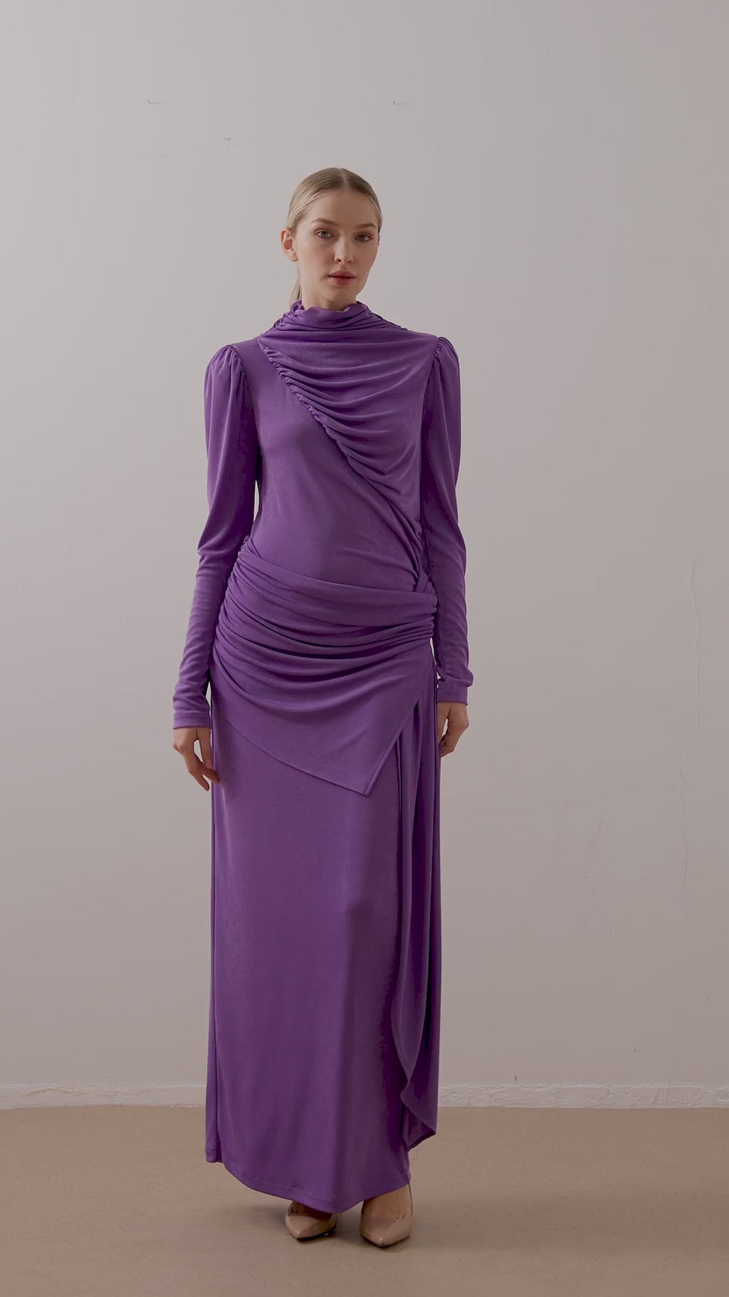 An effortlessly elegant piece designed to make a statement. Crafted from a soft stretch fabric with a subtle shimmer, this dress features a ruched bodice and side draping that beautifully enhance the silhouette. The high neckline and long sleeves add a touch of sophistication, making it ideal for formal gatherings or evening events.