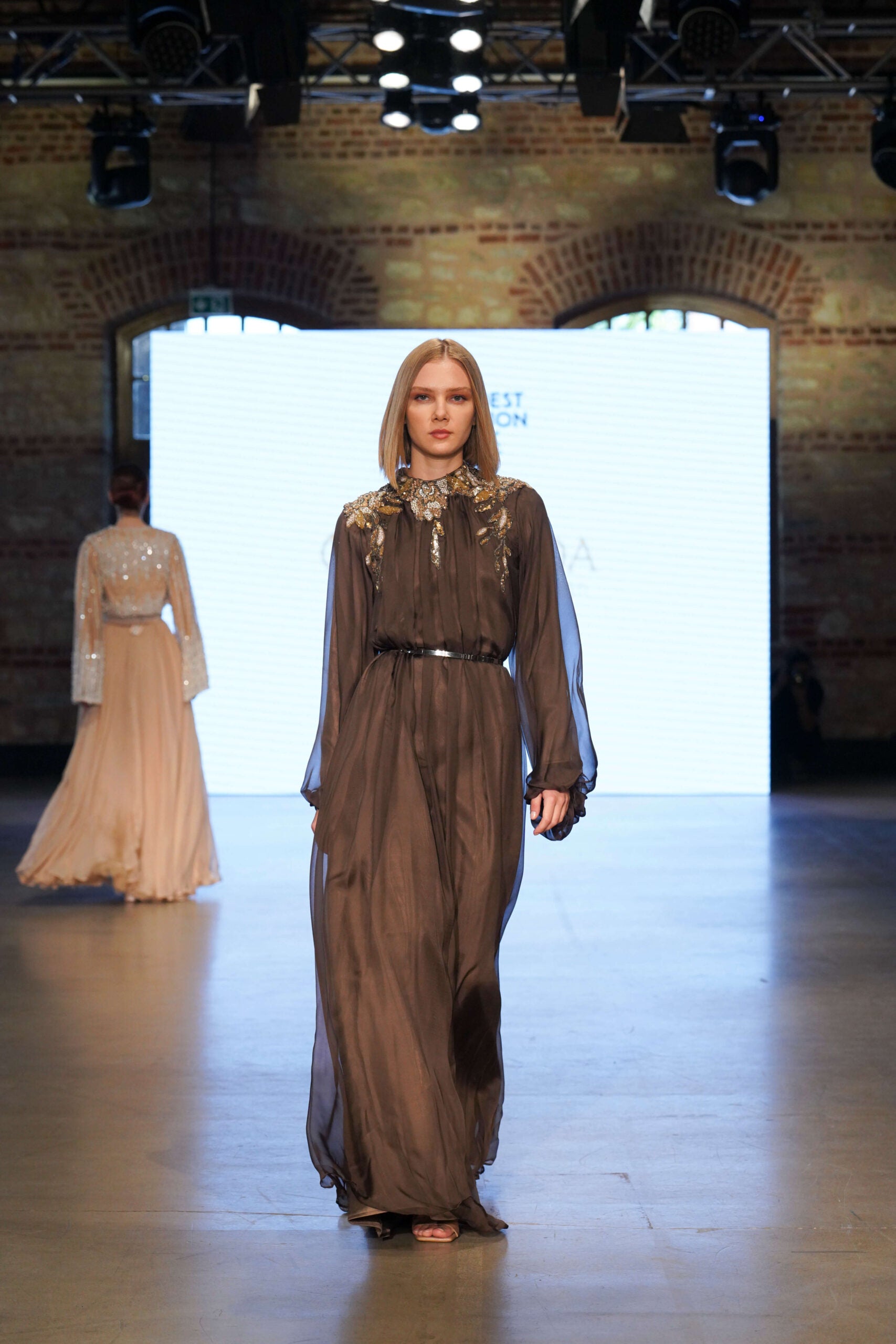 Sapphire Dust Balcanian Embellished Silk Gown – Brown