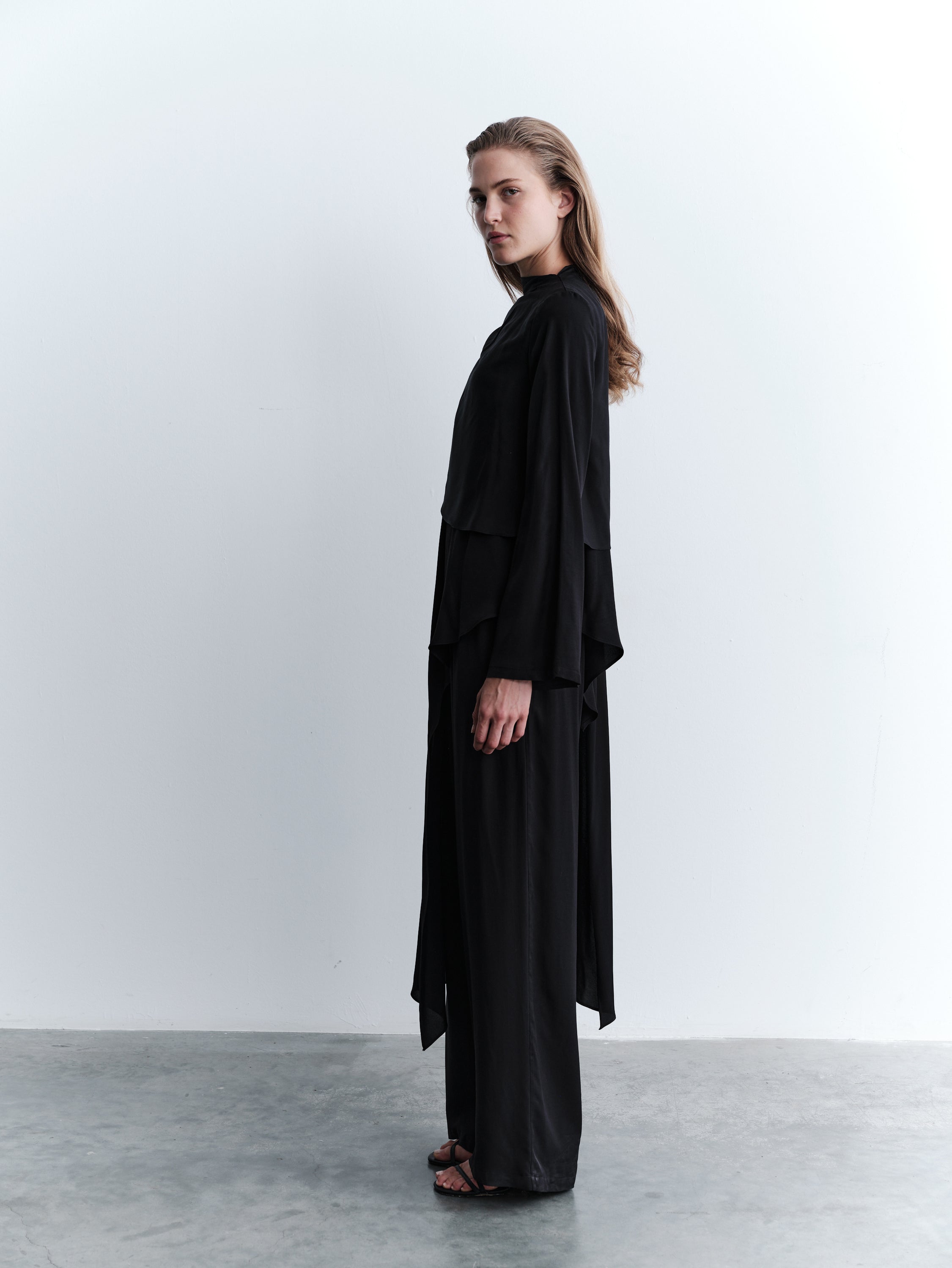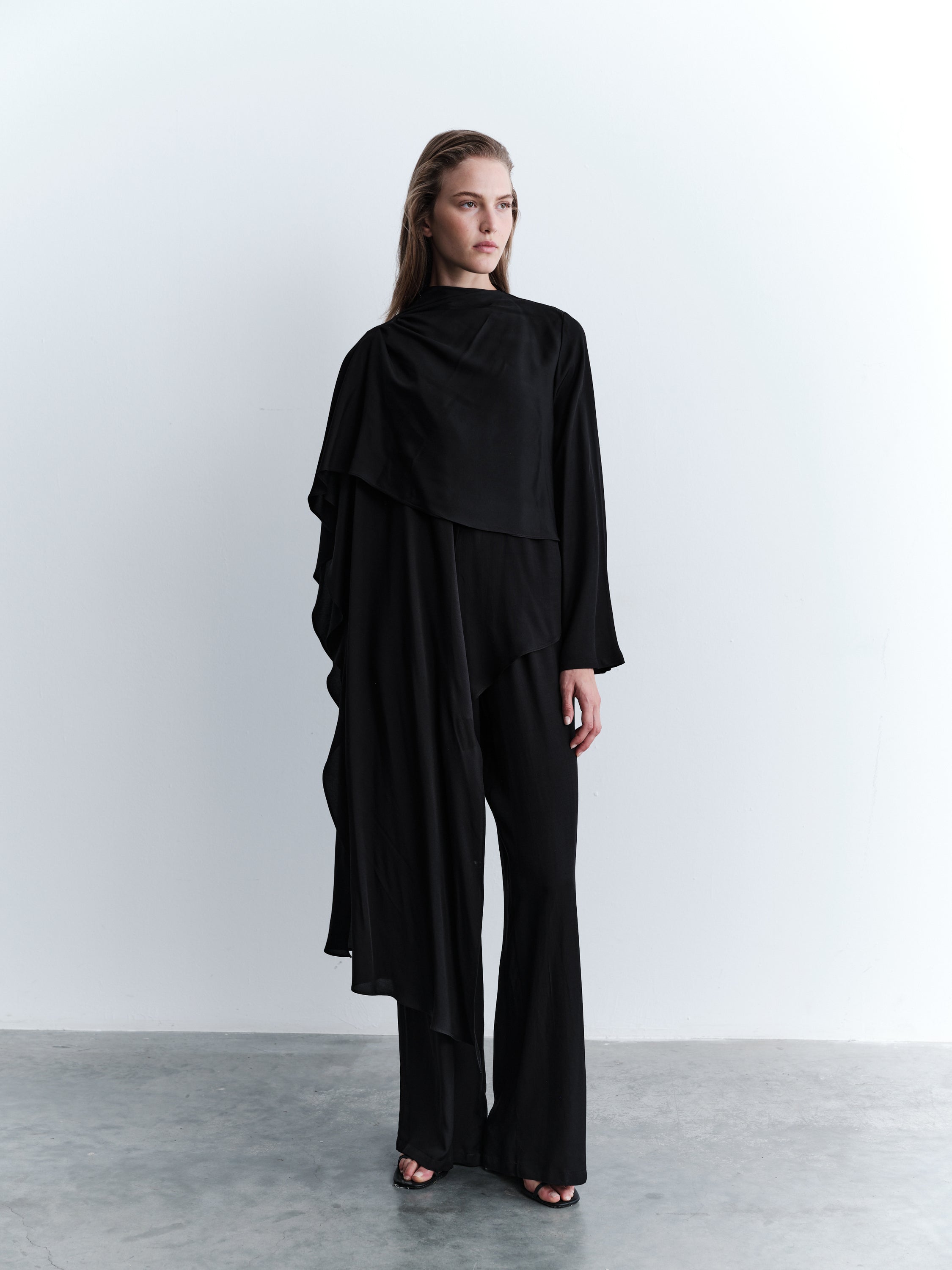 Fit: Relaxed fit with flowing drape. The blouse combines structure with fluid shawl detailing for dramatic movement, while the pants offer everyday comfort with an elastic waistband and pockets. Designed for versatility, balancing elegance and modesty.