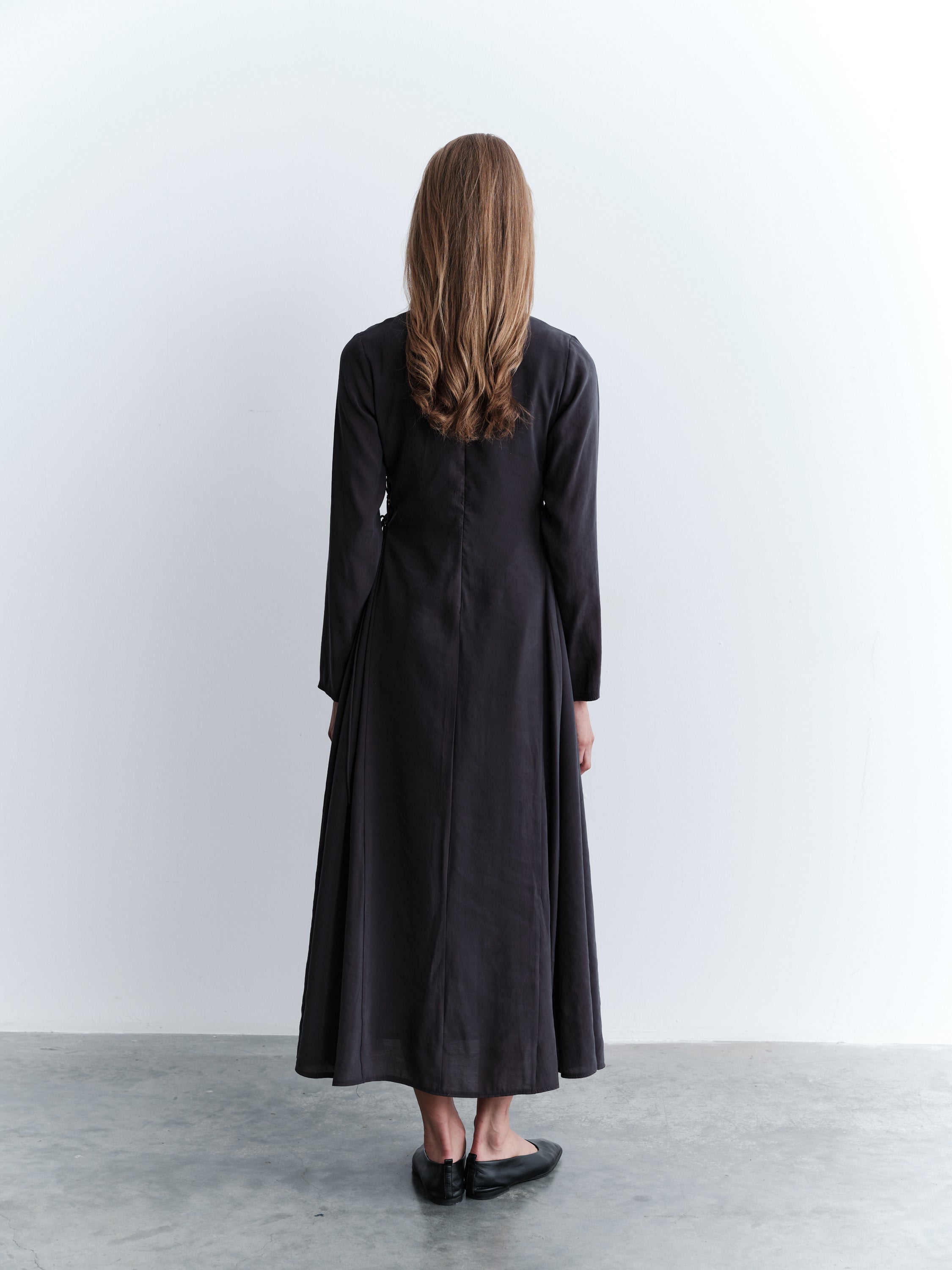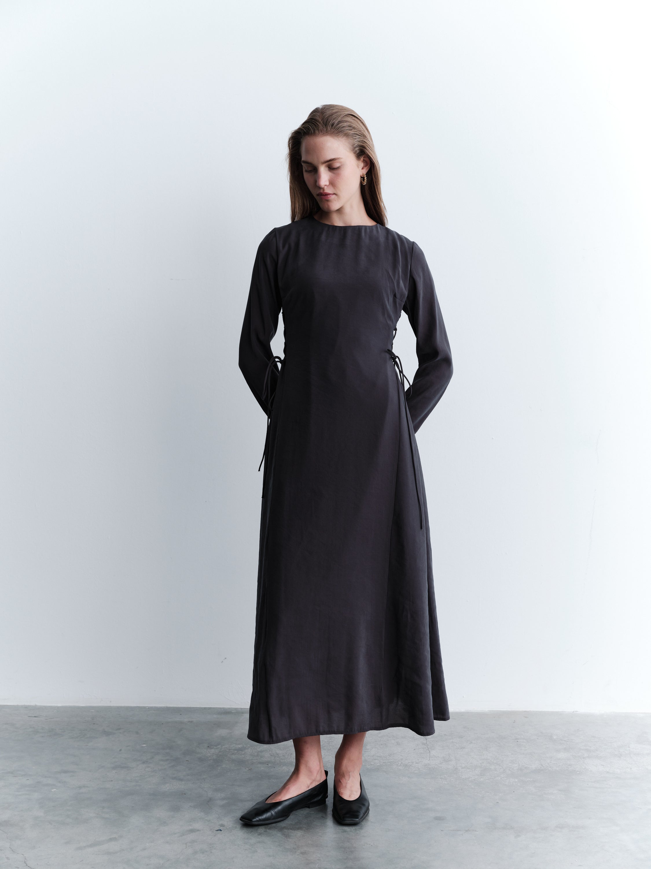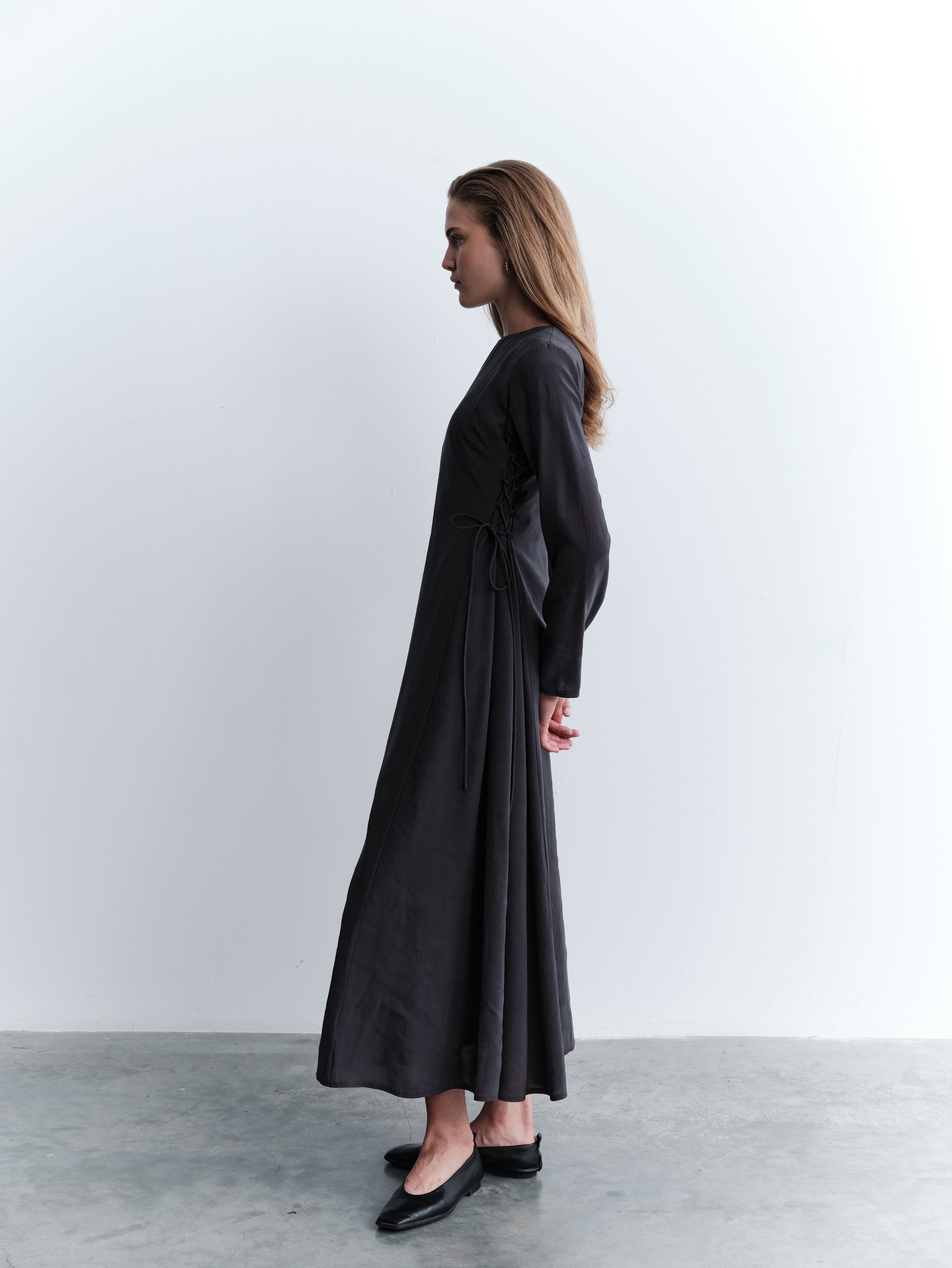This Tencel maxi dress offers both structure and fluidity, designed for versatility and comfort. Featuring adjustable lace-up ties at the sides, it allows for a customizable fit that highlights the waist. The dress is styled with narrow shoulders, long slim sleeves, and a hidden zipper at the back for a clean finish. Its full flared skirt flows elegantly with movement, while the soft cotton lining ensures all-day comfort. Crafted in a deep charcoal tone, this piece blends minimal sophistication with practical ease.