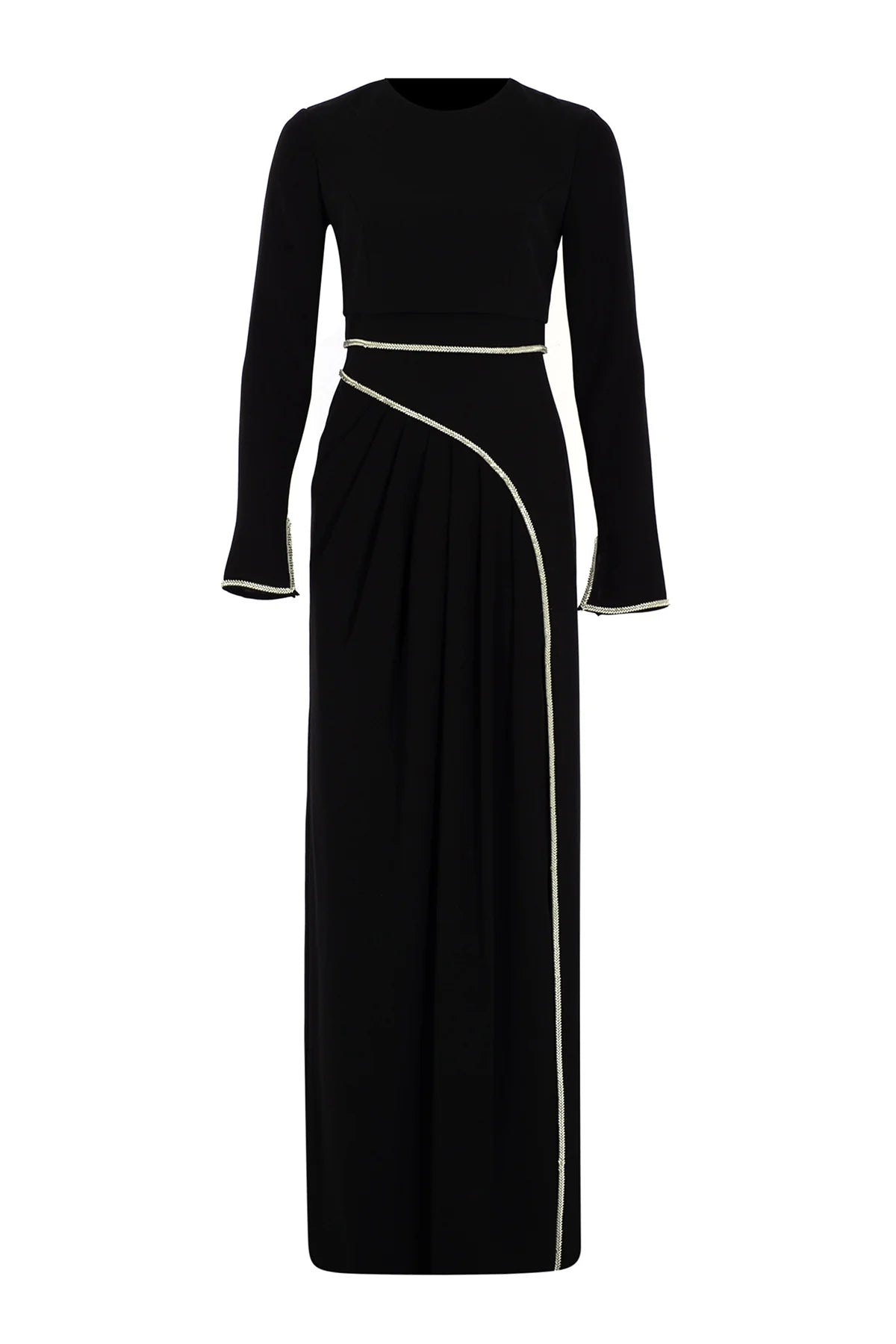 Asymmetric Draped Satin Long Evening Dress with Stone Embellishments - Black