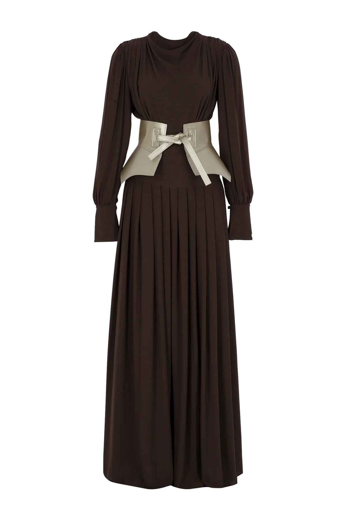 This long-sleeve evening dress features a softly gathered bodice paired with a structured corset-style belt that defines the waist with refined precision. The flowing skirt adds graceful movement, creating a balanced interplay between tailored structure and soft draping — a timeless choice for elevated occasions.