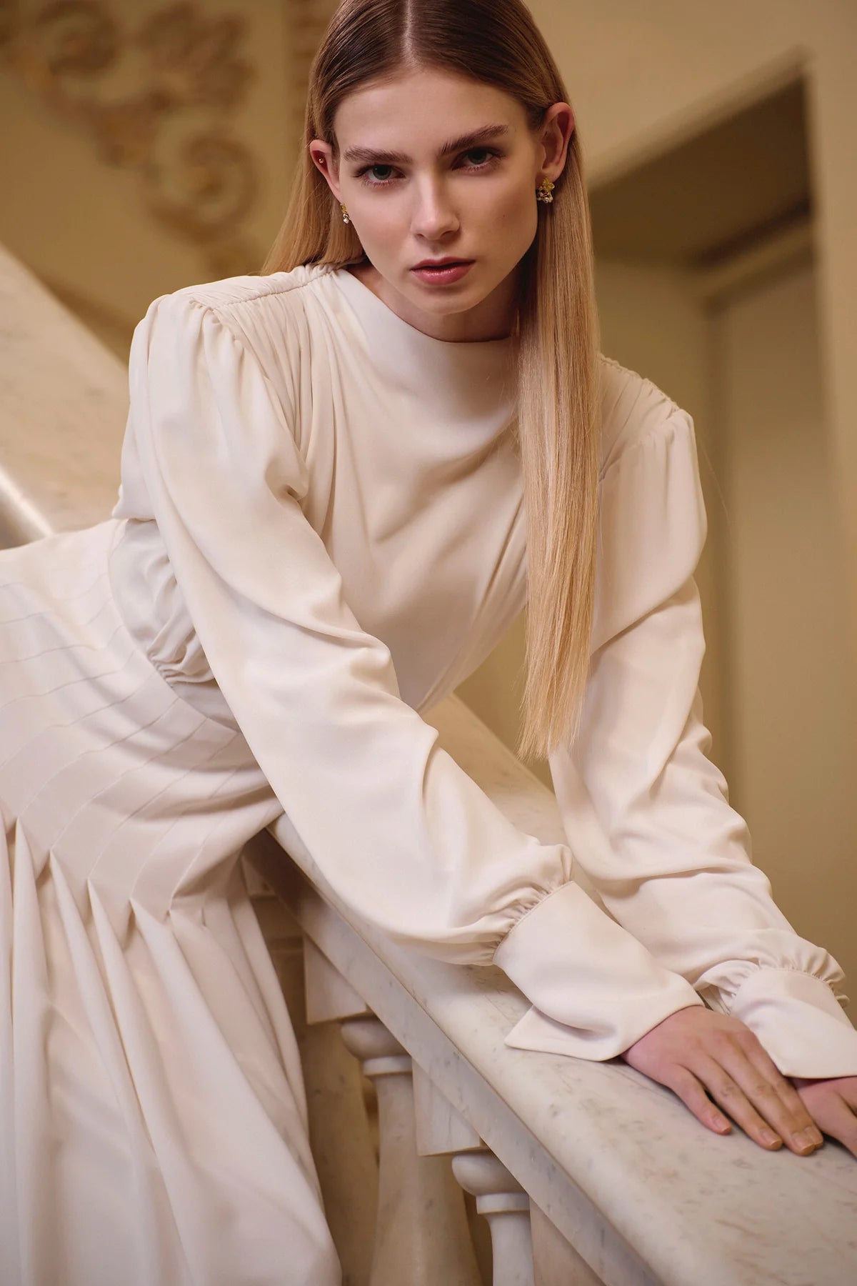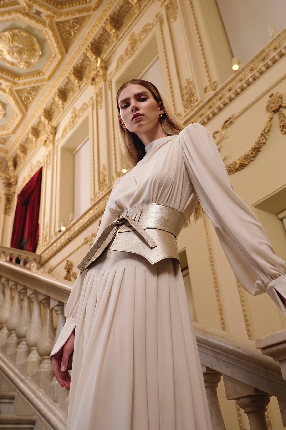 This long-sleeve evening dress features a softly gathered bodice paired with a structured corset-style belt that defines the waist with refined precision. The flowing skirt adds graceful movement, creating a balanced interplay between tailored structure and soft draping — a timeless choice for elevated occasions.