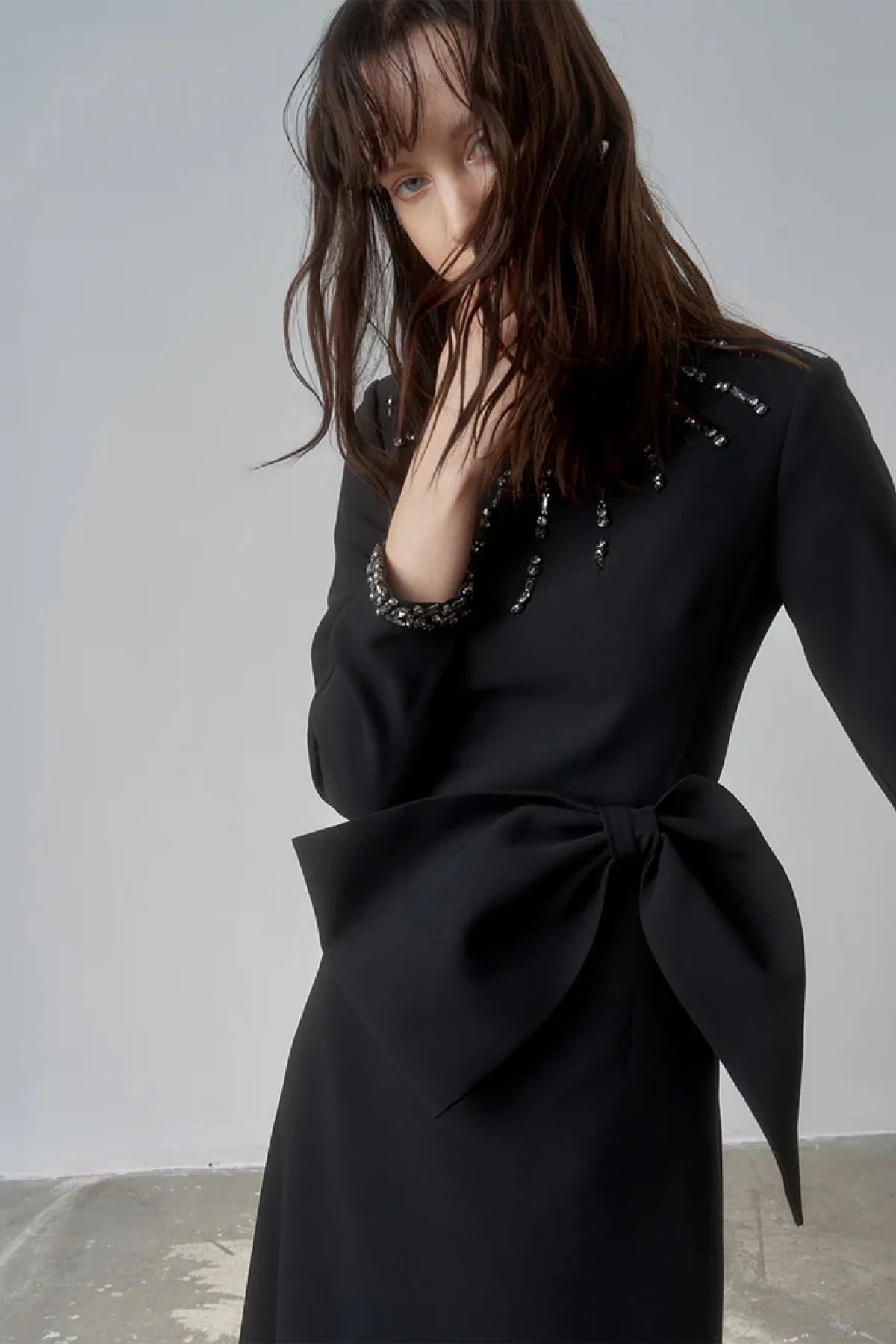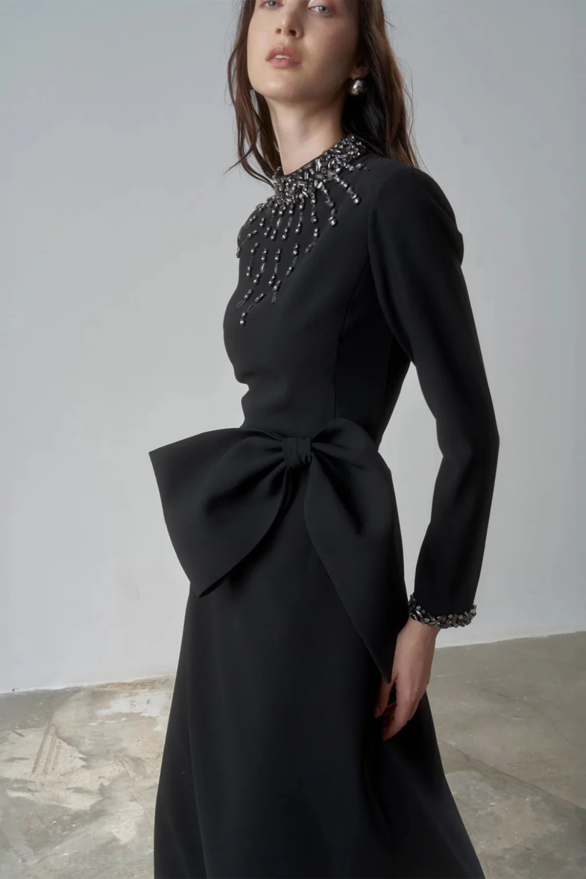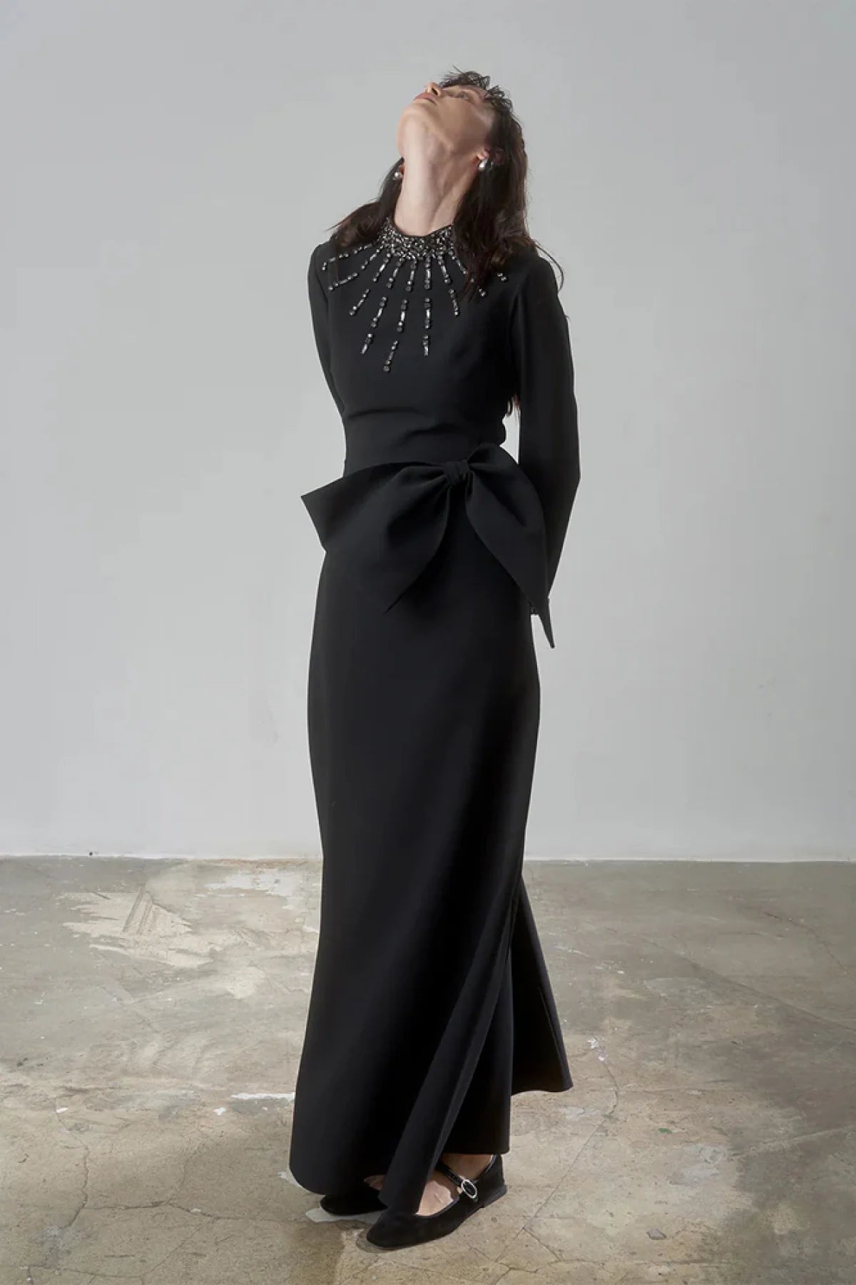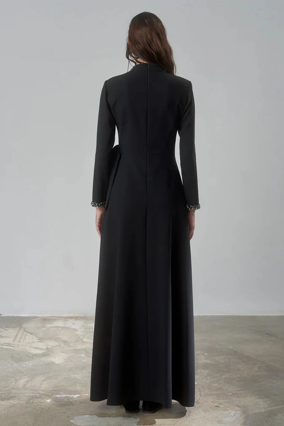 A refined evening gown defined by its structured high neckline, elongated sleeves, and fluid full-length skirt. Crystal and bead embellishments radiate from the neckline and accent the cuffs, adding a sophisticated touch of luminosity. The dramatic bow at the waist introduces a feminine sculptural element, balancing elegance with modern statement design—ideal for formal gatherings, receptions, and distinguished evening events.