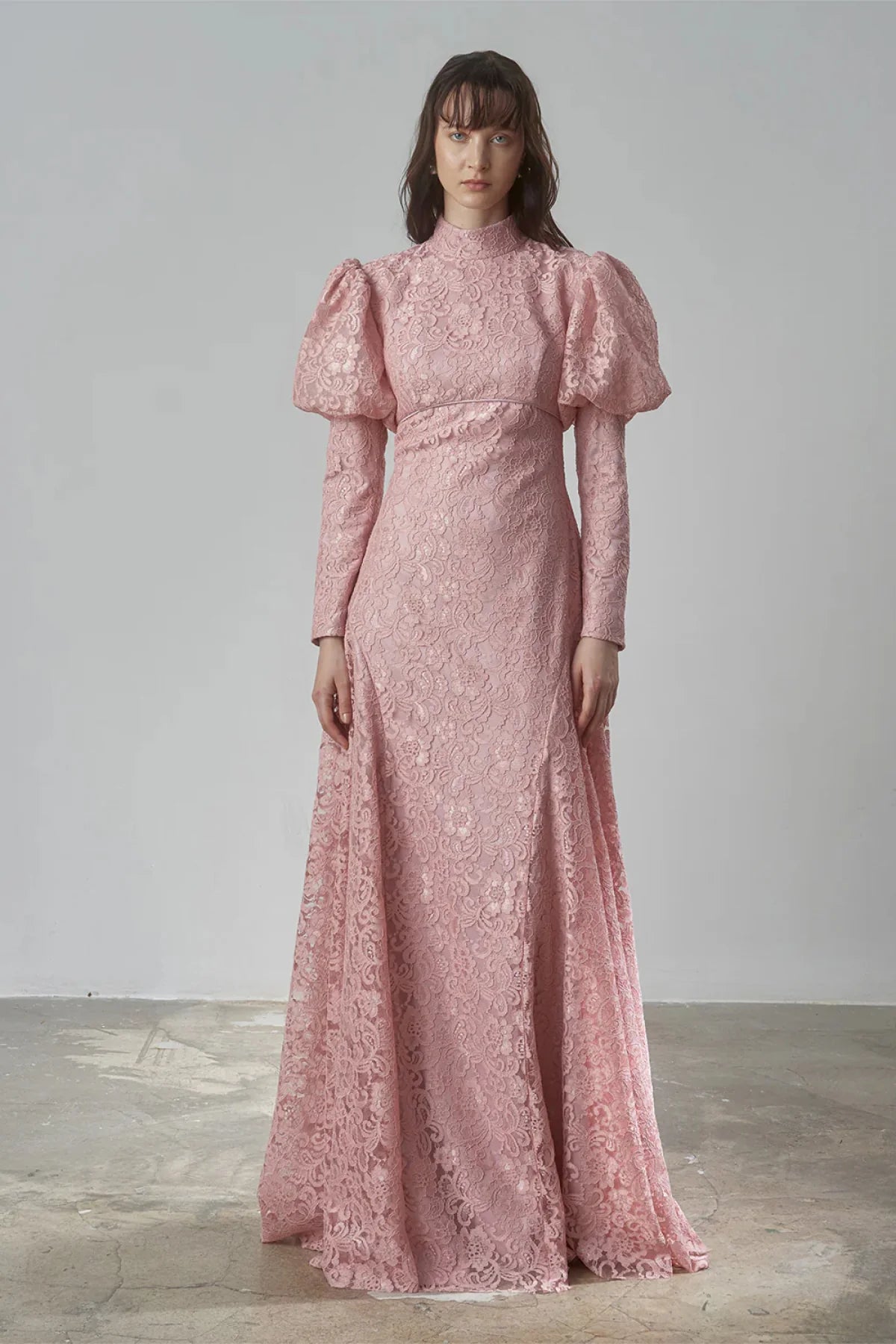 An elegant full-length gown crafted entirely from delicate lace, designed to evoke a timeless and romantic silhouette. The high neckline, sculpted waist seam, and voluminous gigot sleeves create a refined and modern balance, while the flowing skirt adds graceful movement. Perfect for weddings, engagements, and formal celebrations seeking sophistication with a vintage touch.