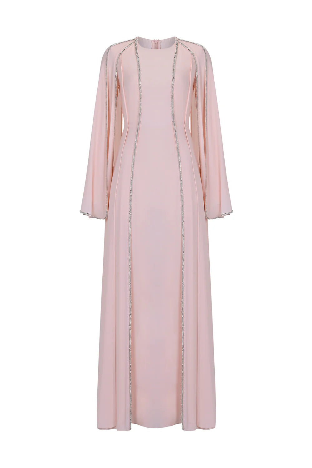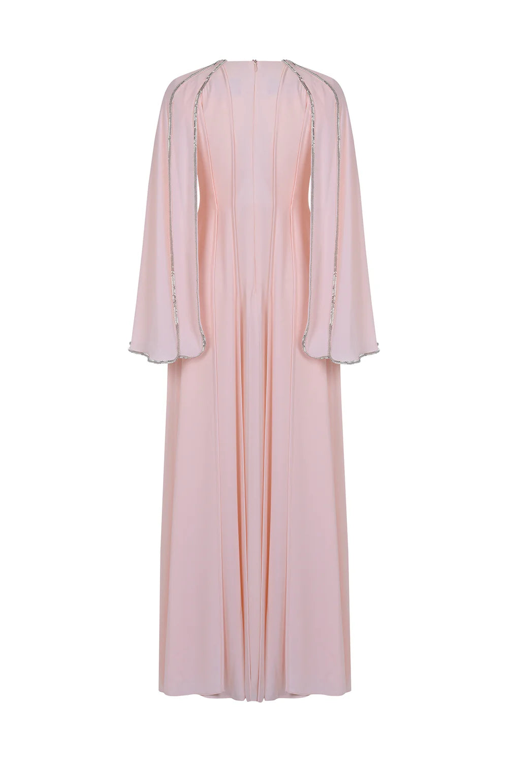 Long Cape-Sleeve Embellished Evening Dress – Powder Pink