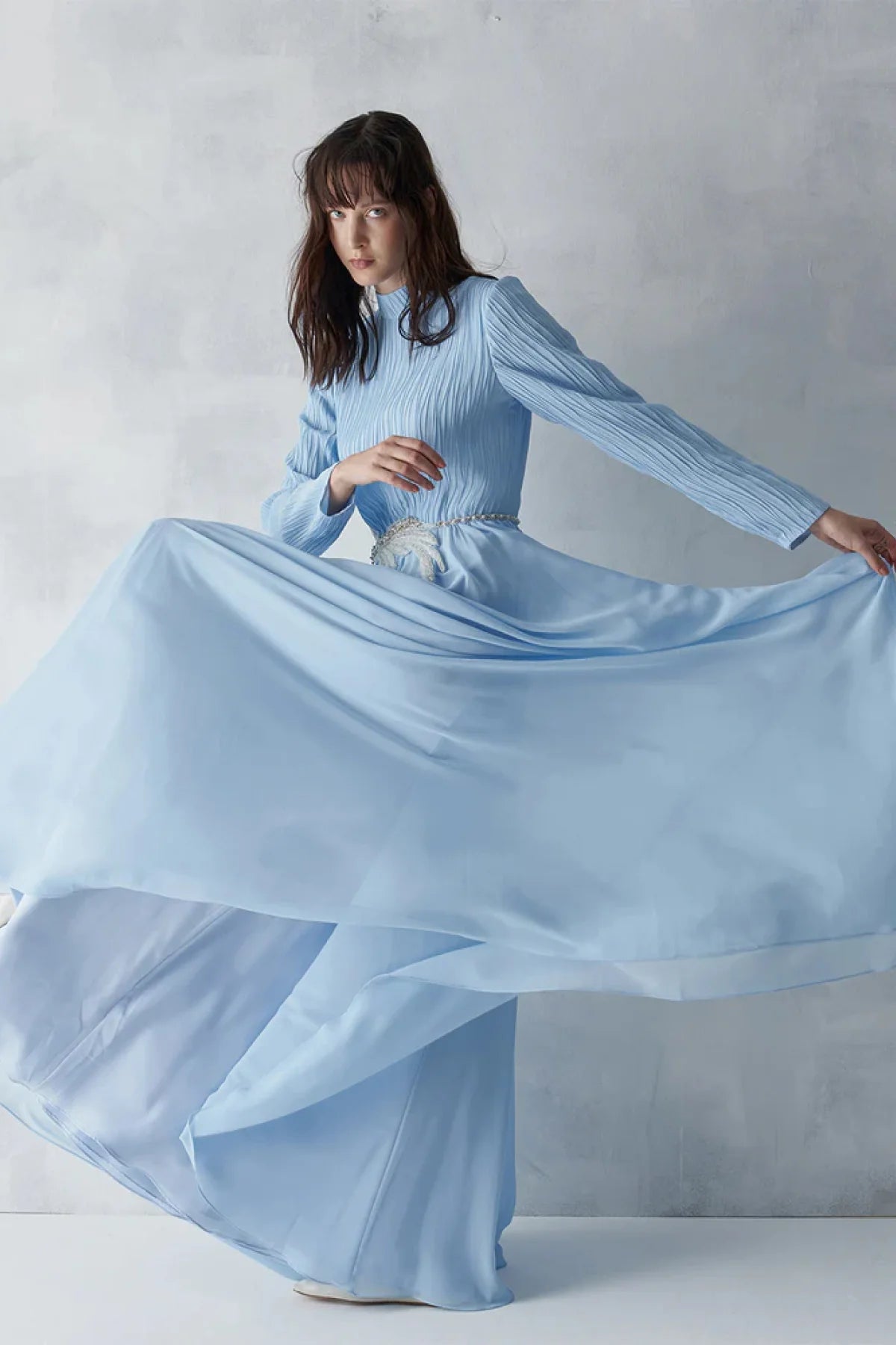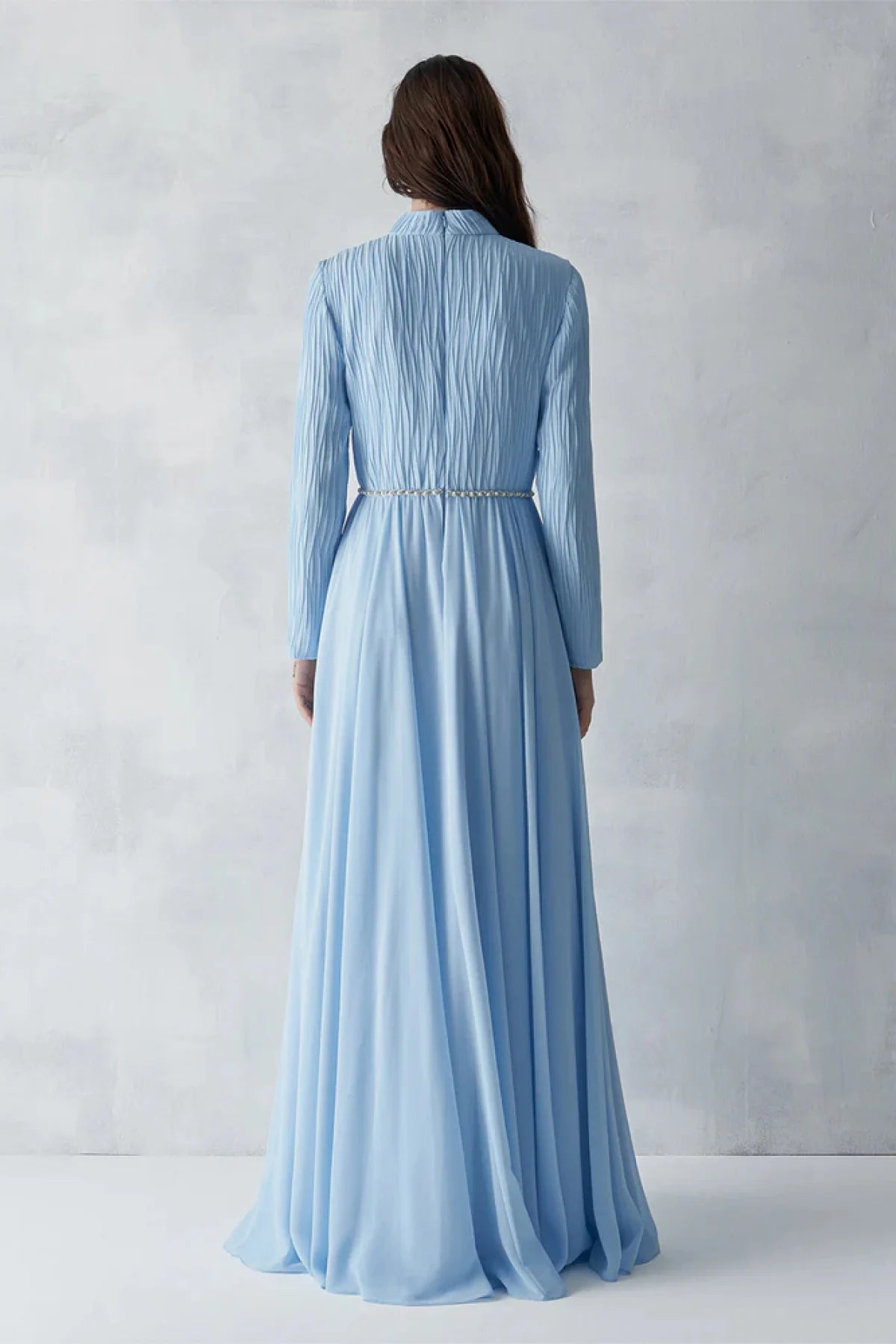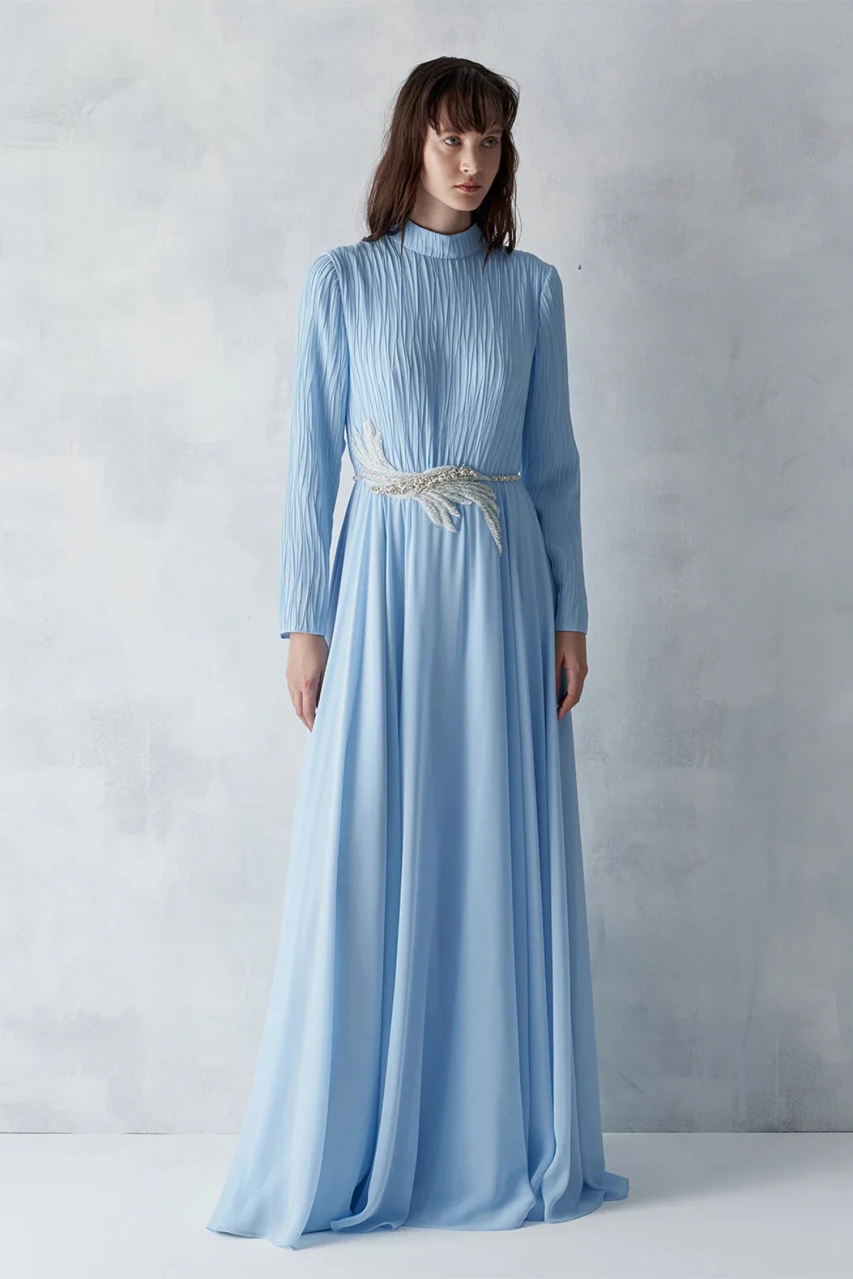 A refined and graceful gown featuring an elegant pleated bodice and a flowing, full-length skirt. The high neckline and long sleeves create a modest and timeless silhouette, while the beaded leaf belt adds a sophisticated focal point. The lightweight chiffon skirt moves beautifully with every step, making this piece an exquisite choice for weddings, evening events, or formal celebrations.