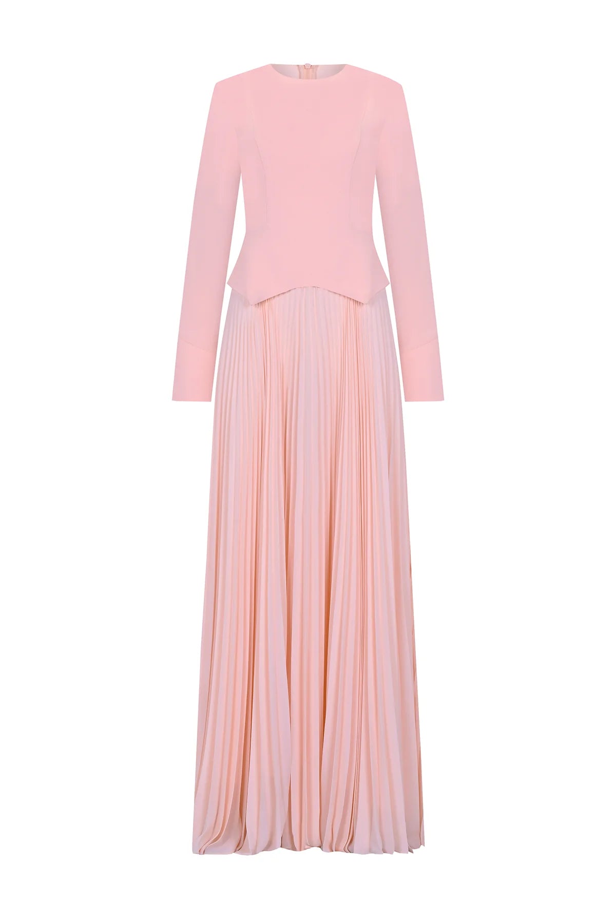 This refined evening dress features a structured, tailored bodice that gently shapes the silhouette, paired with a fluid pleated skirt that creates elegant movement. The clean lines, long sleeves, and soft draping make it a timeless and graceful choice for formal occasions, receptions, and special events.