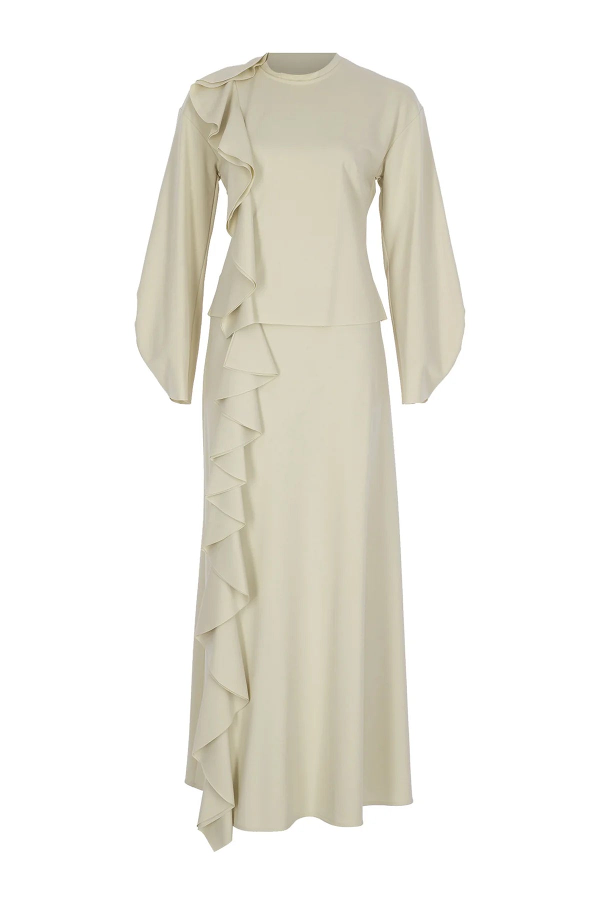 A refined two-piece ensemble designed with a sculptural asymmetric ruffle cascading from shoulder to hem. The high-neck blouse offers a clean, minimal silhouette paired with a fluid maxi skirt that moves elegantly with every step.