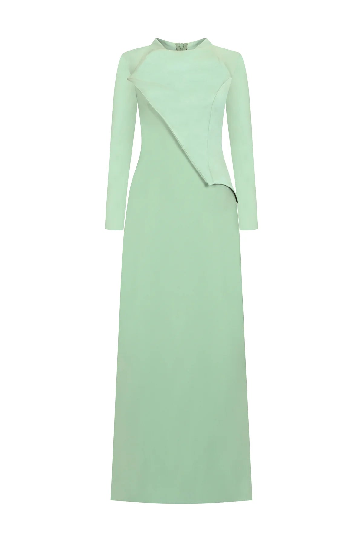 A refined minimalist silhouette elevated by sculptural satin paneling that creates a striking asymmetric composition across the bodice. The long, clean sleeves and smooth round neckline balance the architectural detailing, while the full-length skirt flows with understated elegance. A modern, gallery-inspired evening piece for formal events where sophistication is expressed through structure and simplicity.